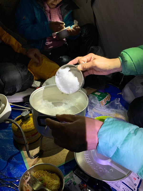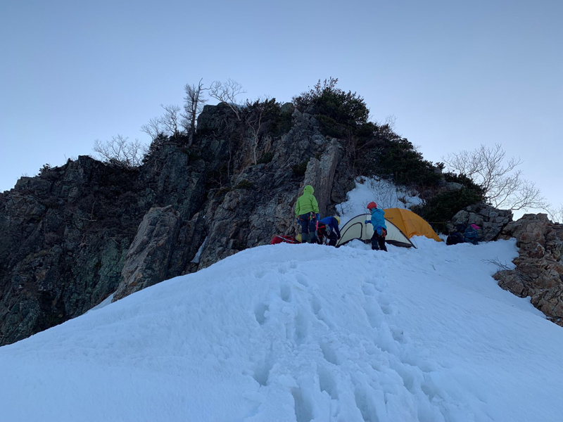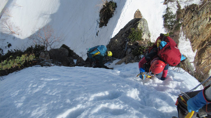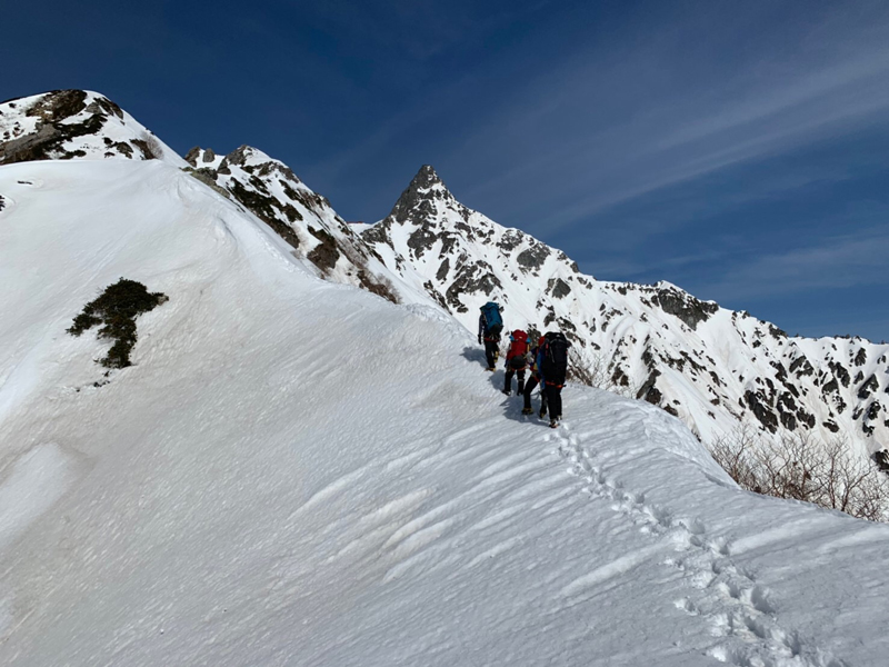 残雪期の槍ヶ岳北鎌尾根例会ですが、やはり無雪期の北鎌に比べて厳しいものになった。水俣乗越に着いた時、時間や若い2人以外の体力を考えて、天上沢側に降りずに峠でビバークして、翌日、東鎌尾根から本峰に登頂し横尾に下山した。