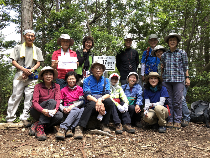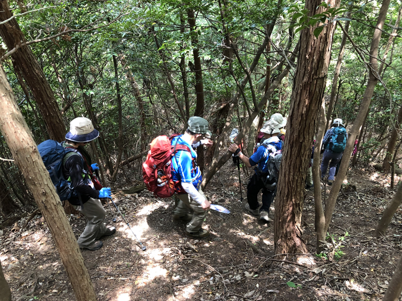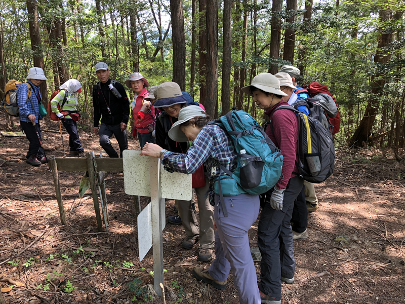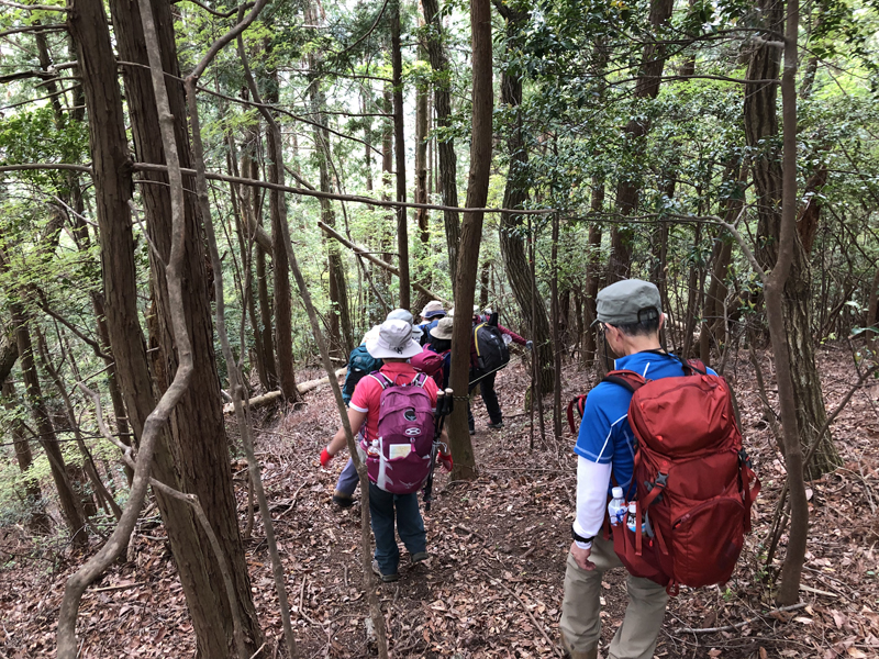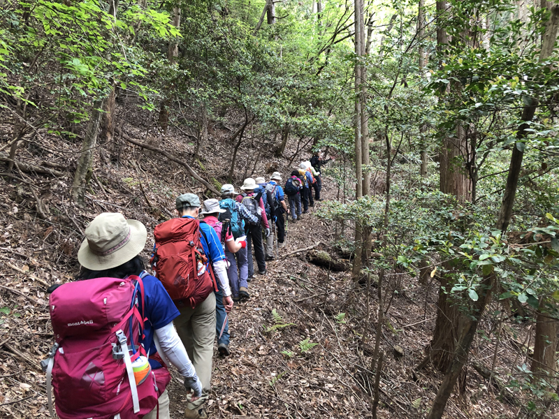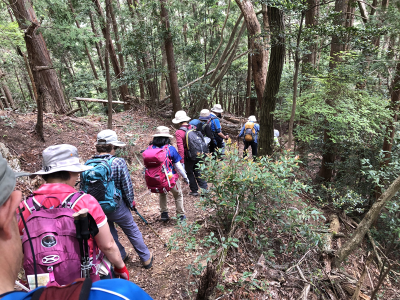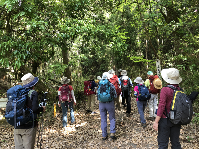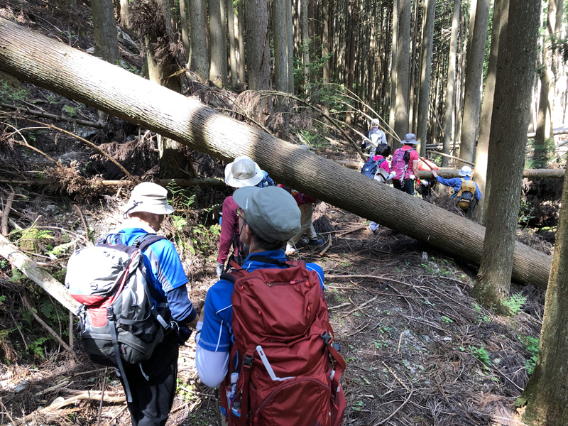 岩倉実相院前でバスを降り、岩倉具視幽棲旧宅の前で歴史に造詣の深いIさんから岩倉具視の解説をしていただいた後、繁見坂から箕ノ裏ヶ岳へ登った。その後、展望の良い静原の墓を経由して、江文峠分岐から寒谷峠手前で東に折れて、戸寺バス停まで無事下山した。昨夏の台風の被害は甚大で、倒木をくぐったりまたいだり。それでも、時折吹く爽やかな風に癒されながら、新緑の山歩きを楽しんだ。(S.I.)
