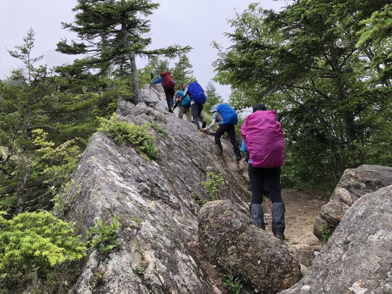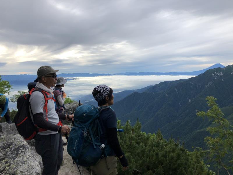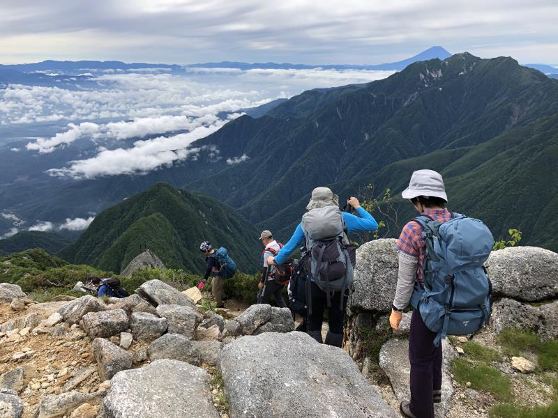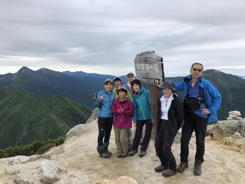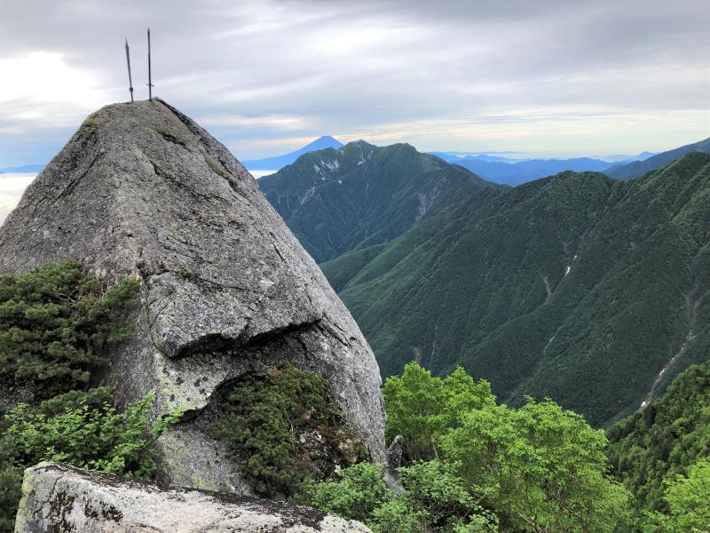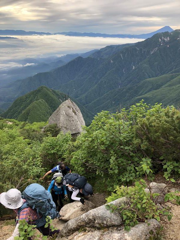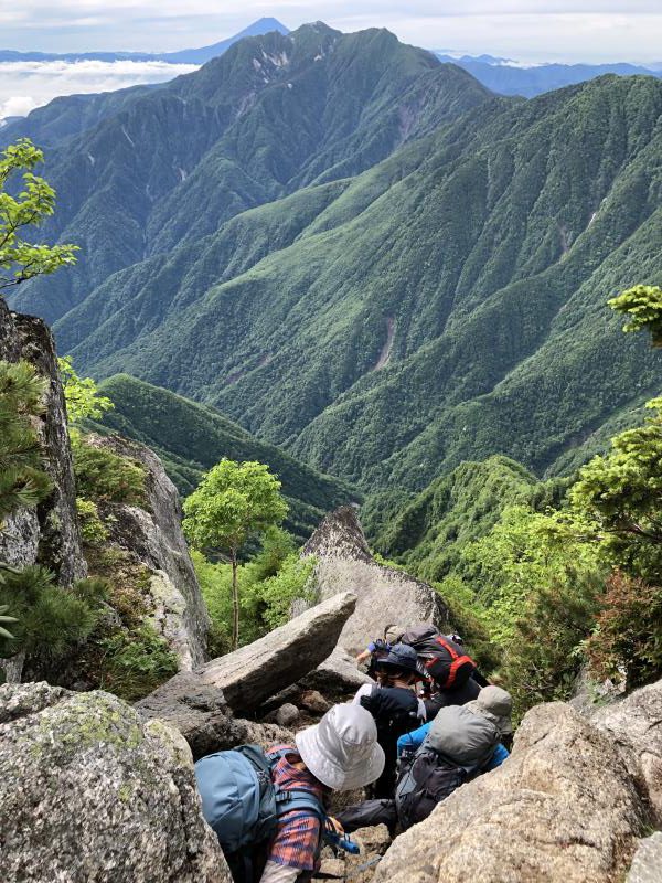 前線の動きでコロコロ変わる天気予報に悩まされた末に、出発前日の夕方、ようやく例会の実施を決めた。初日は雨に濡れることを覚悟していたが、黒戸尾根は大部分が樹林帯で、小雨はさほど気にならず、針葉樹林の新芽や苔がいっそう緑を深めていた。刀利天狗を過ぎると、修験道ならではの梯子や鎖場が連続する。コースタイムよりやや早めで七丈小屋に到着。翌朝5時に小屋を出発して約2時間半で山頂へ。時折陽射しが見られるほど天気は回復した。地蔵岳のオベリスクの後方に佇む富士山をはじめ、北岳、仙丈ヶ岳、鋸岳、御嶽、乗鞍、北アルプス、八ヶ岳など360度の絶景にしばし見とれた。標高差2,200mの日本三大急登の一つに数えられるだけあって、登り甲斐のあるコースであることは間違いない。それにしても、この尾根を日帰りする軽装のトレイルランナーの多いことには驚いた。(S.I.)