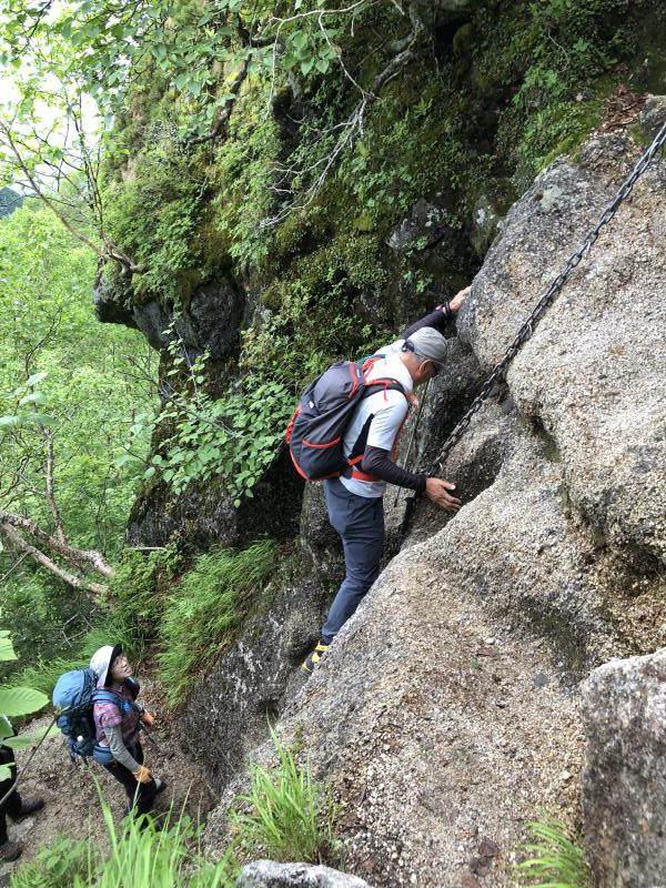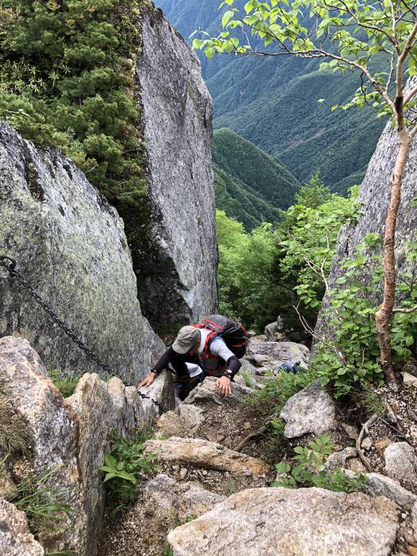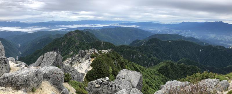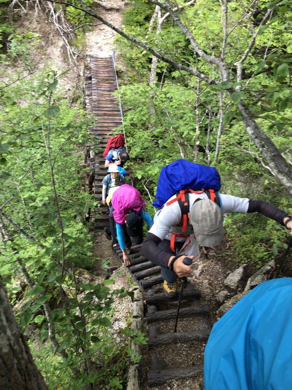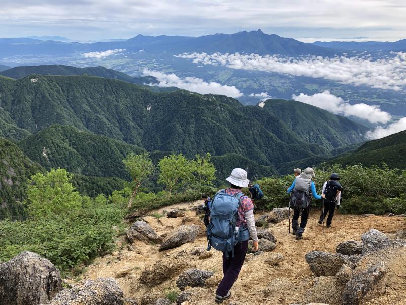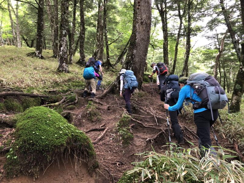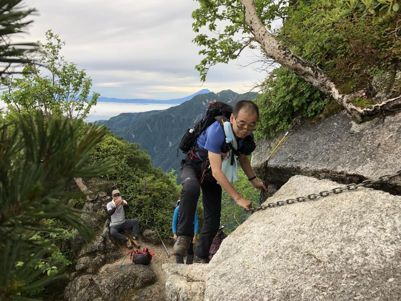 前線の動きでコロコロ変わる天気予報に悩まされた末に、出発前日の夕方、ようやく例会の実施を決めた。初日は雨に濡れることを覚悟していたが、黒戸尾根は大部分が樹林帯で、小雨はさほど気にならず、針葉樹林の新芽や苔がいっそう緑を深めていた。刀利天狗を過ぎると、修験道ならではの梯子や鎖場が連続する。コースタイムよりやや早めで七丈小屋に到着。翌朝5時に小屋を出発して約2時間半で山頂へ。時折陽射しが見られるほど天気は回復した。地蔵岳のオベリスクの後方に佇む富士山をはじめ、北岳、仙丈ヶ岳、鋸岳、御嶽、乗鞍、北アルプス、八ヶ岳など360度の絶景にしばし見とれた。標高差2,200mの日本三大急登の一つに数えられるだけあって、登り甲斐のあるコースであることは間違いない。それにしても、この尾根を日帰りする軽装のトレイルランナーの多いことには驚いた。(S.I.)