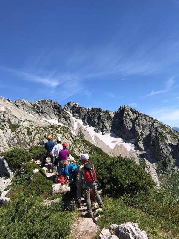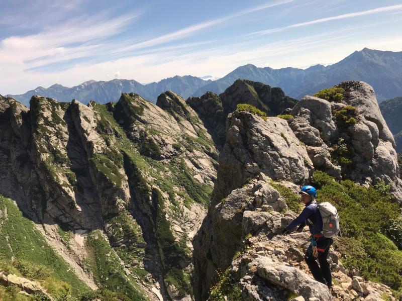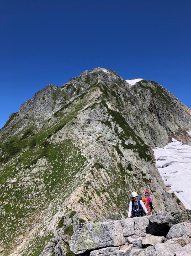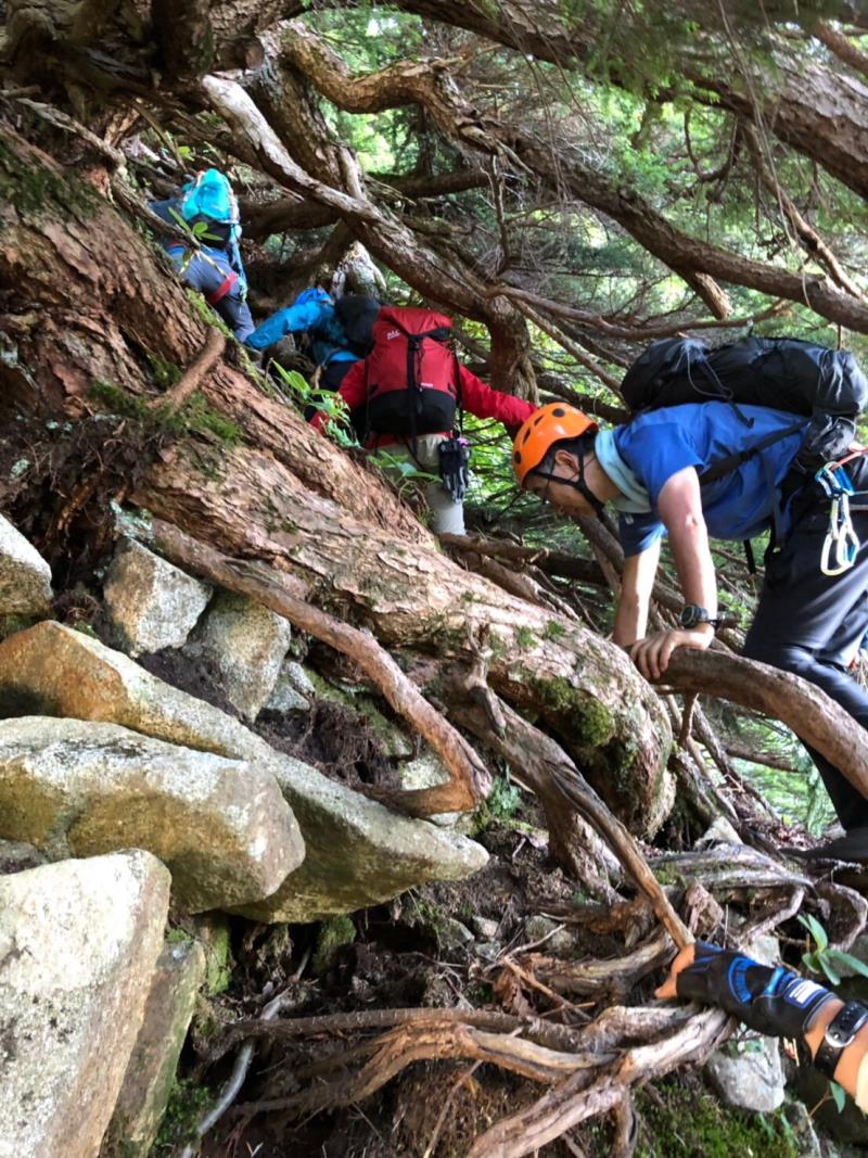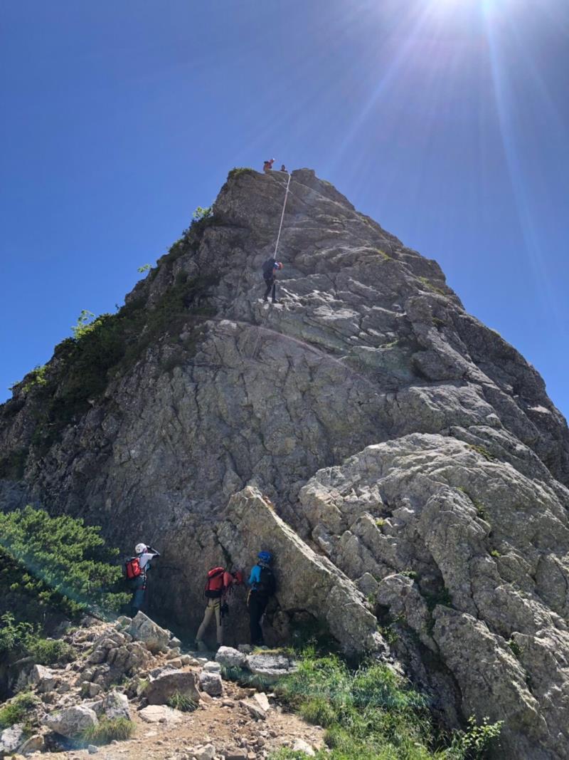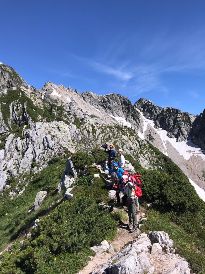 AM3:40テン場出発、暗闇の中雪渓を下り源次郎取付へ。AM5:15登山開始。少し行くと岩登りの核心部が2箇所と合間、合間にウネウネとねじれた松の木登り。岩登りは先行パーティが苦戦で待たされるも、我々パーティはCLのお助けロープやフリークライムで難なくクリア。ほぼ踏み跡が分かるルートを進み、尾根上に出ると八ツ峰がドーンと青空に映える。いよいよ源次郎のハイライト、2峰からの30mロープ2本での懸垂下降。ここでも先が詰まっており長らく待機するも、事前練習の成果はバッチリ!スタートから待ち時間含め8時間半で剱岳本峰、祠の裏から頂へ。体力勝負のバリエーションルート、厳しさの分、登頂の喜びも倍増。あとは別山尾根をカニのヨコバイでの長い渋滞に巻き込まれながら下山した。Y・K