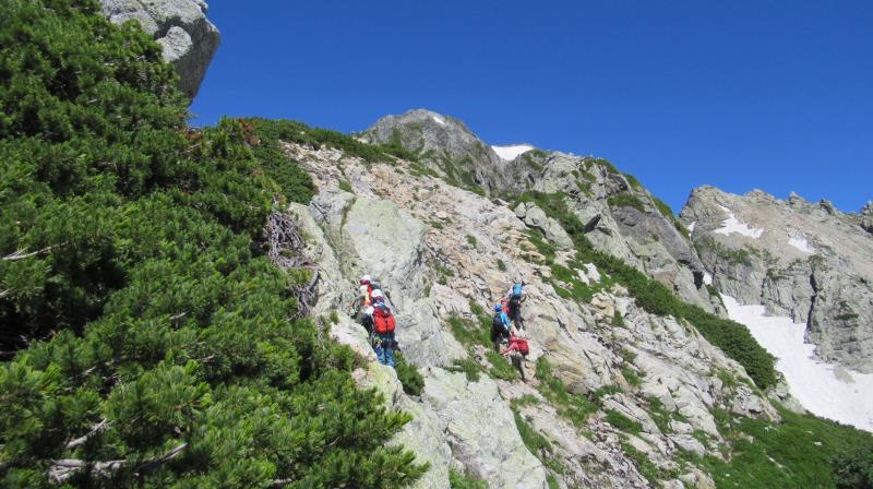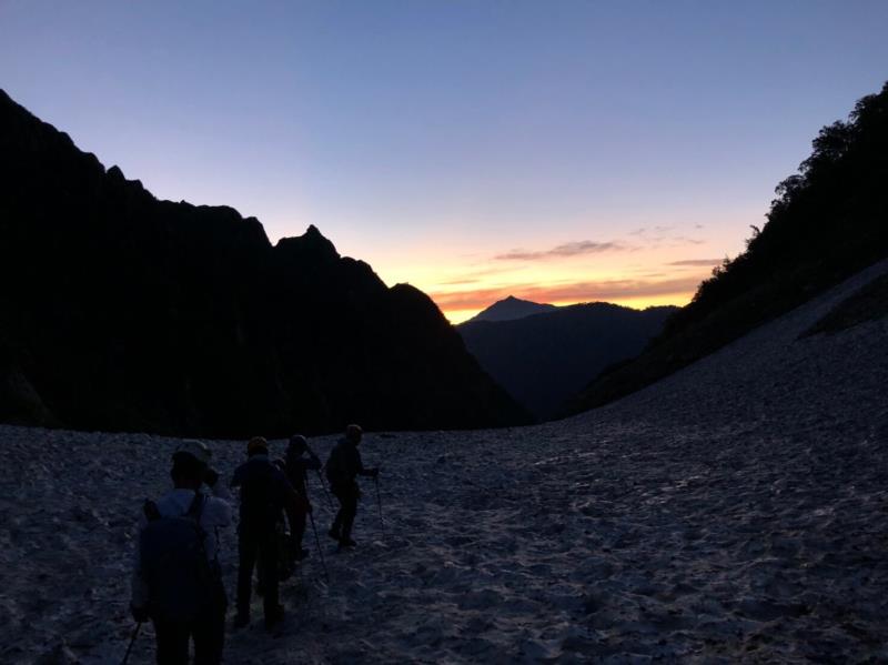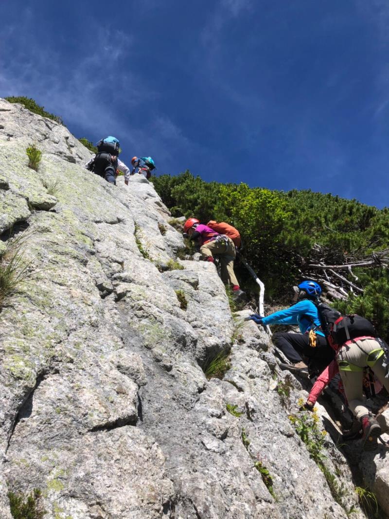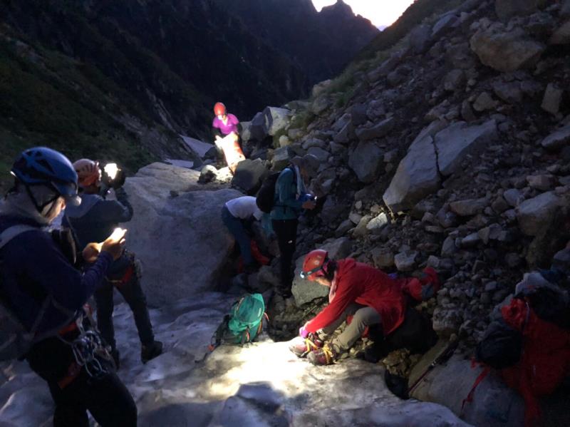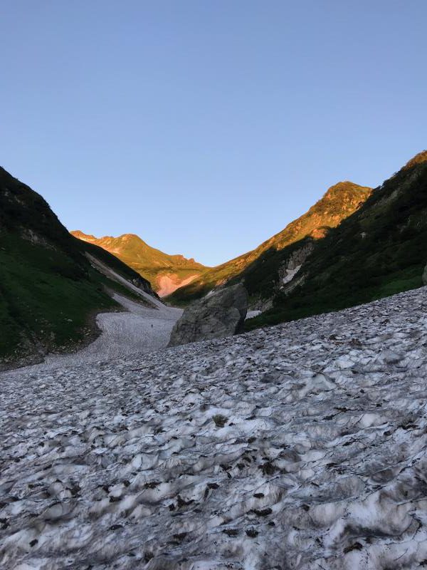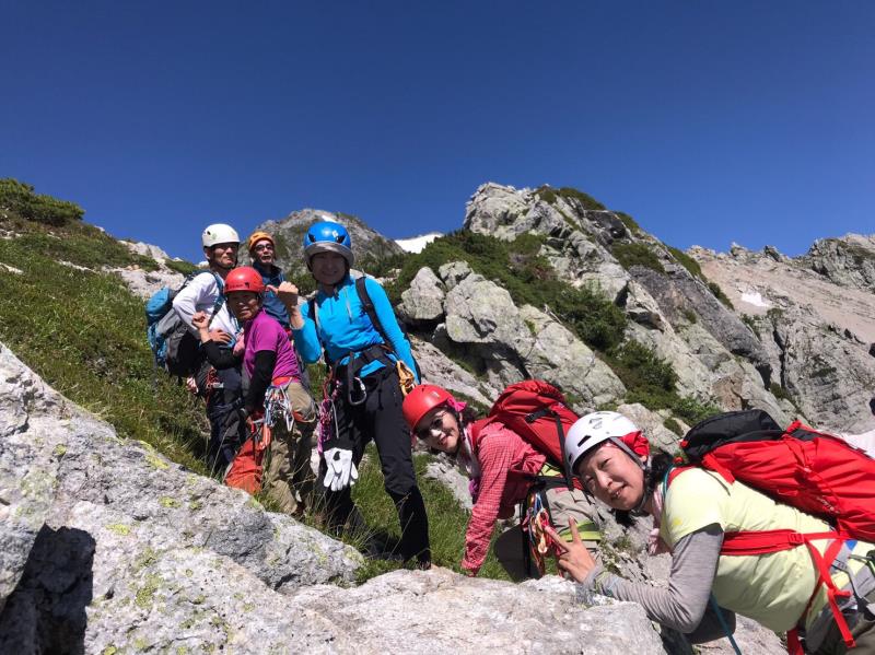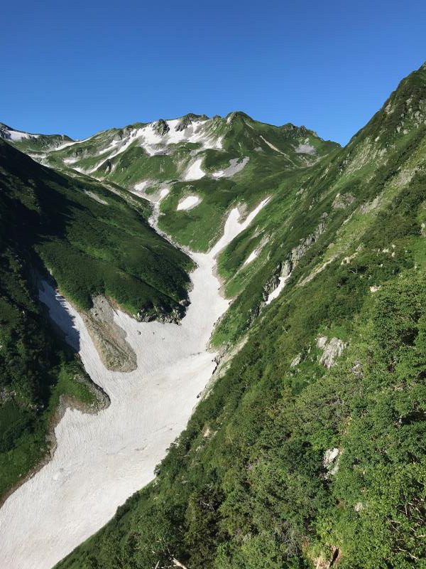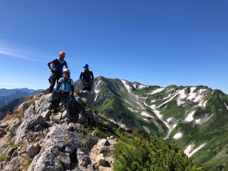 AM3:40テン場出発、暗闇の中雪渓を下り源次郎取付へ。AM5:15登山開始。少し行くと岩登りの核心部が2箇所と合間、合間にウネウネとねじれた松の木登り。岩登りは先行パーティが苦戦で待たされるも、我々パーティはCLのお助けロープやフリークライムで難なくクリア。ほぼ踏み跡が分かるルートを進み、尾根上に出ると八ツ峰がドーンと青空に映える。いよいよ源次郎のハイライト、2峰からの30mロープ2本での懸垂下降。ここでも先が詰まっており長らく待機するも、事前練習の成果はバッチリ!スタートから待ち時間含め8時間半で剱岳本峰、祠の裏から頂へ。体力勝負のバリエーションルート、厳しさの分、登頂の喜びも倍増。あとは別山尾根をカニのヨコバイでの長い渋滞に巻き込まれながら下山した。Y・K