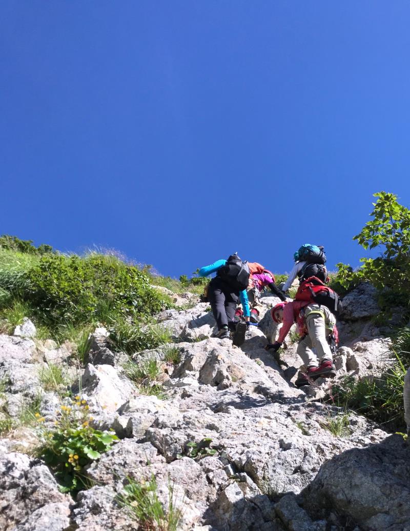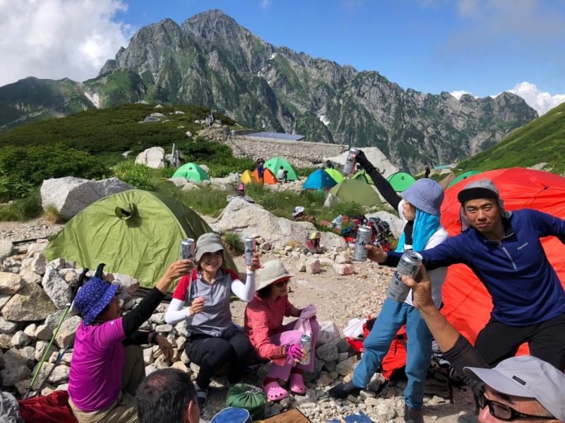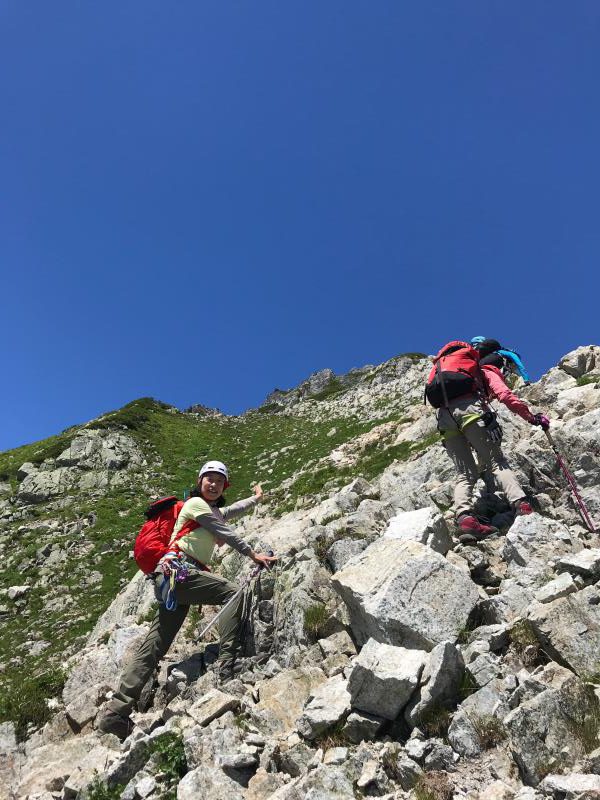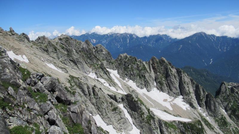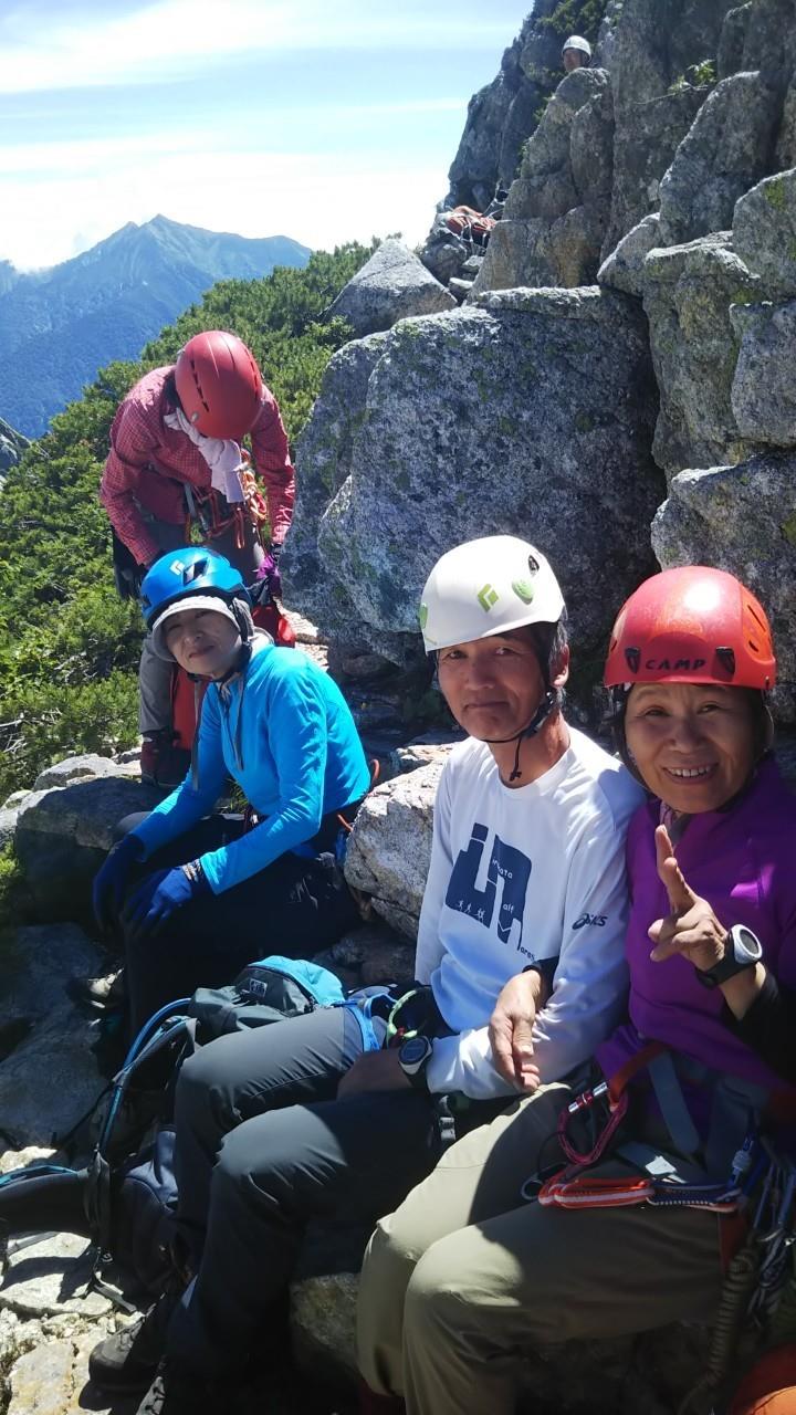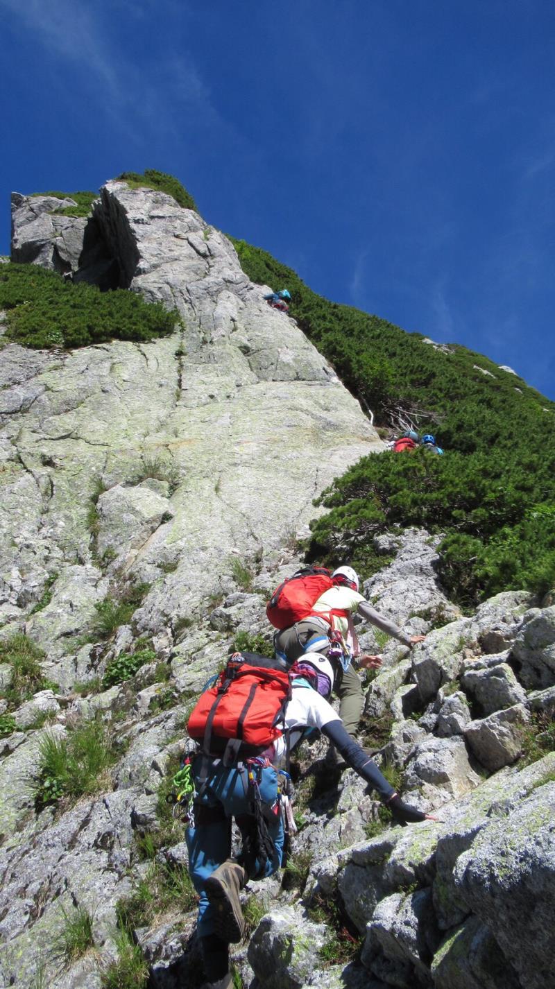 AM3:40テン場出発、暗闇の中雪渓を下り源次郎取付へ。AM5:15登山開始。少し行くと岩登りの核心部が2箇所と合間、合間にウネウネとねじれた松の木登り。岩登りは先行パーティが苦戦で待たされるも、我々パーティはCLのお助けロープやフリークライムで難なくクリア。ほぼ踏み跡が分かるルートを進み、尾根上に出ると八ツ峰がドーンと青空に映える。いよいよ源次郎のハイライト、2峰からの30mロープ2本での懸垂下降。ここでも先が詰まっており長らく待機するも、事前練習の成果はバッチリ!スタートから待ち時間含め8時間半で剱岳本峰、祠の裏から頂へ。体力勝負のバリエーションルート、厳しさの分、登頂の喜びも倍増。あとは別山尾根をカニのヨコバイでの長い渋滞に巻き込まれながら下山した。Y・K
