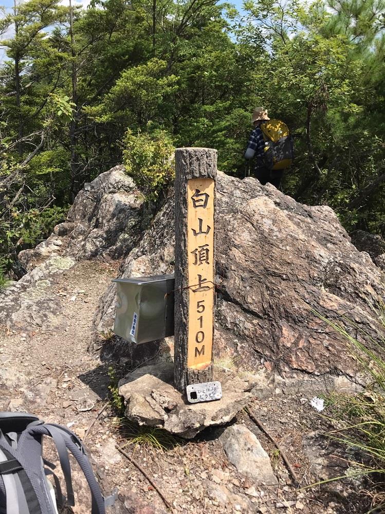 p510白山頂上に到着。大きな岩の上に標識がありますが、日陰がなく、少し降りた日陰で昼食。
