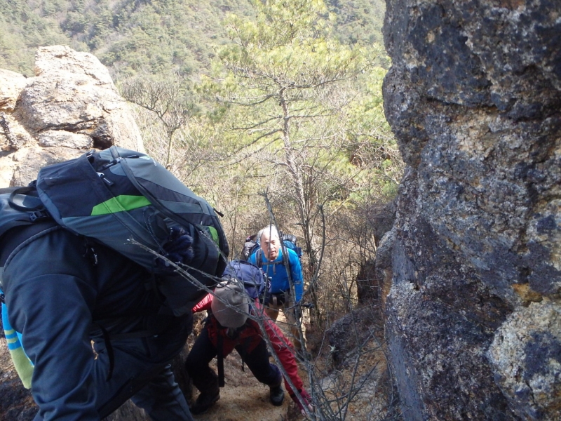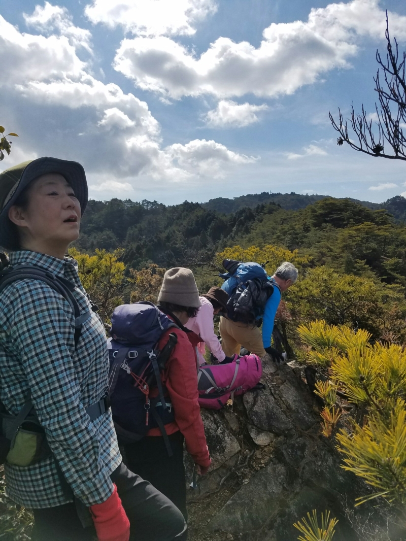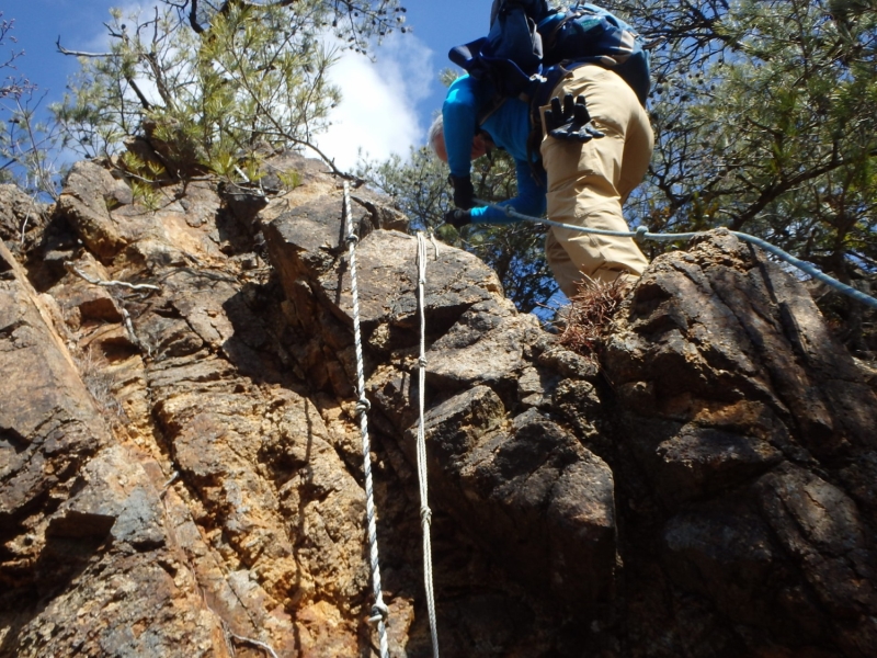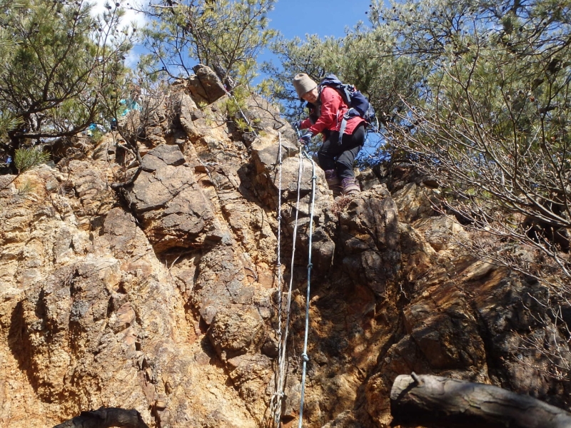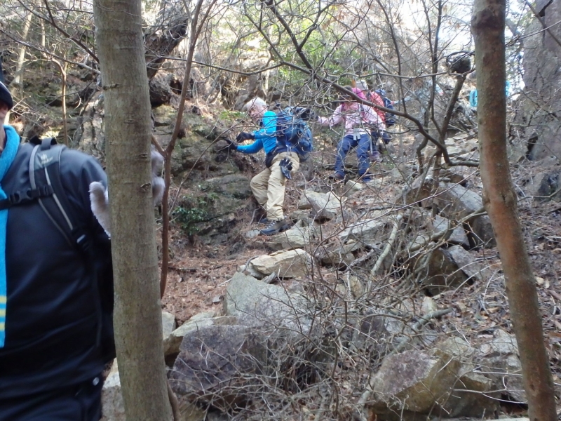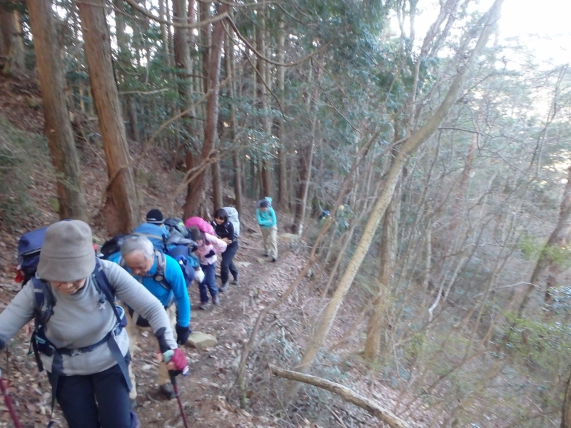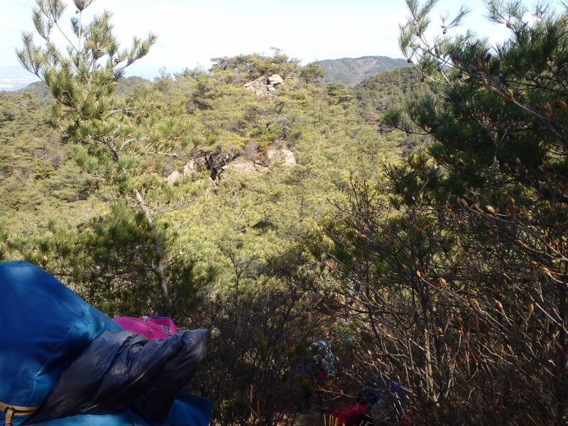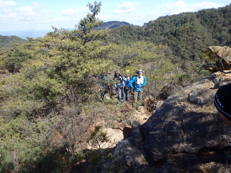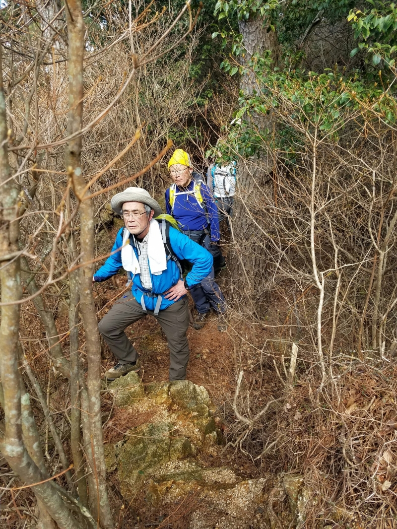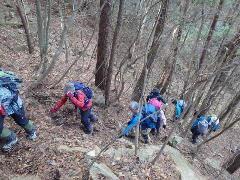 さて古寺山を一旦下降し、六甲アルプスの取り付きへ移動する。まずは、尾根道の激登りである。ストックをザックにしまい細枝を頼りにぐいぐい高度をかせいでいく。落ち葉で滑りやすい壁のような斜面を登り切るといよいよ六甲アルプスの始まりである。岩を乗越し、大岩を巻いて、ザレ場を進んで行く。さしずめ 展望満載のヤセ尾根歩きと言ったところか。振り返れば、ゆったりした古寺山が静かにそびえている。