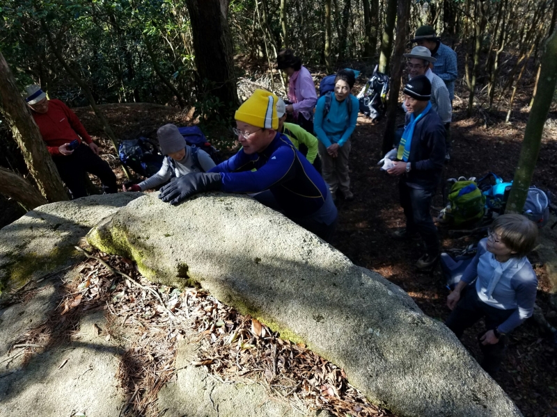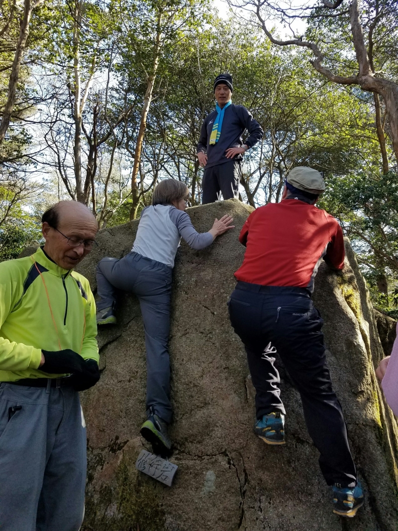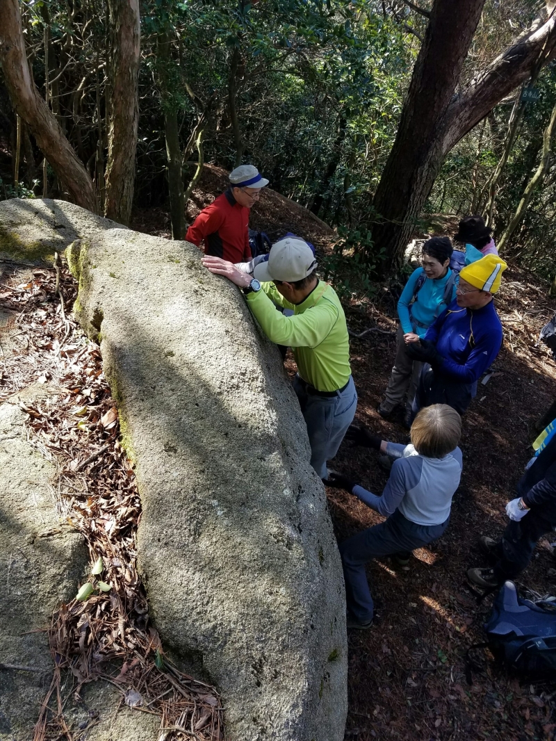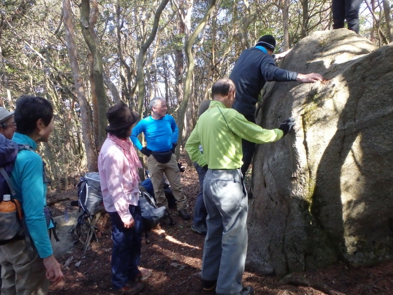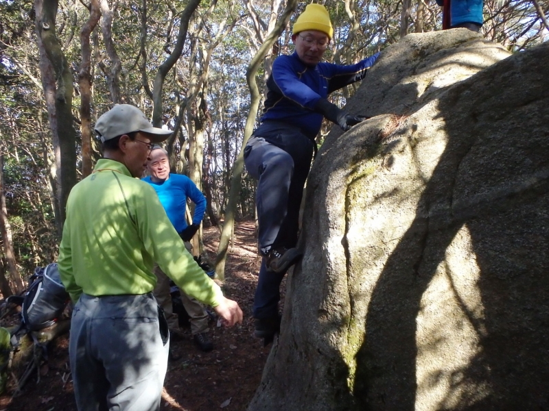636mの山頂には展望がない。その代わり「清盛の涼み岩」と呼ばれる高さ2m程の大岩が鎮座している。岩遊びにうってつけのこの岩でボルダリングのまね事にしばし興じた。