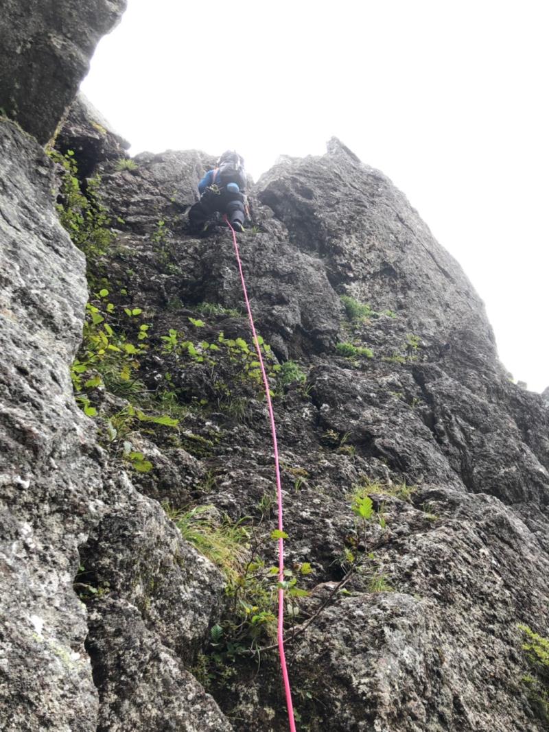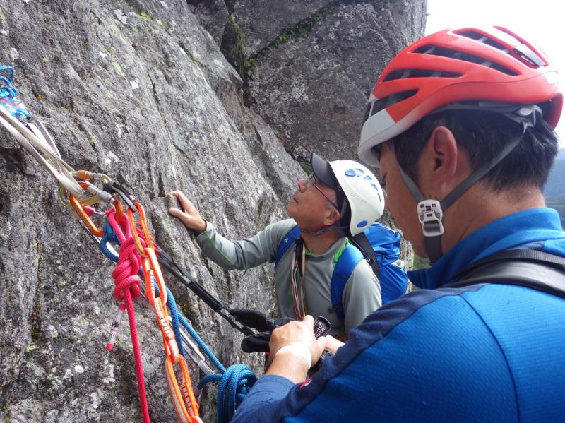 クライミングには少し不向きな奇数の3人だがルートの確認や意見を出し合い楽しく登攀開始。全部で5P、初めての岩場とあってわくわくと緊張の交差の連続。