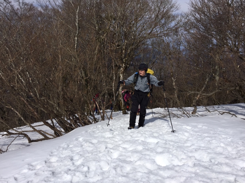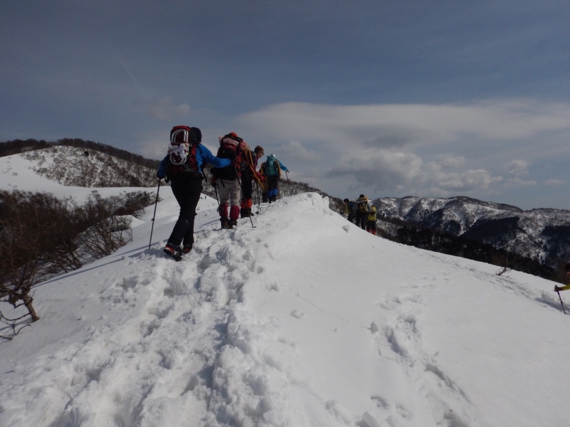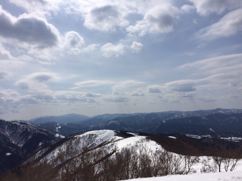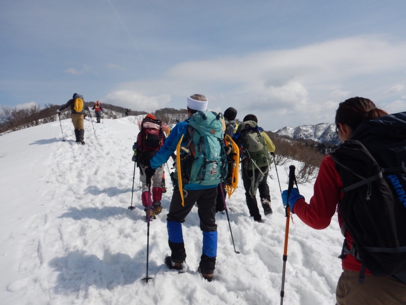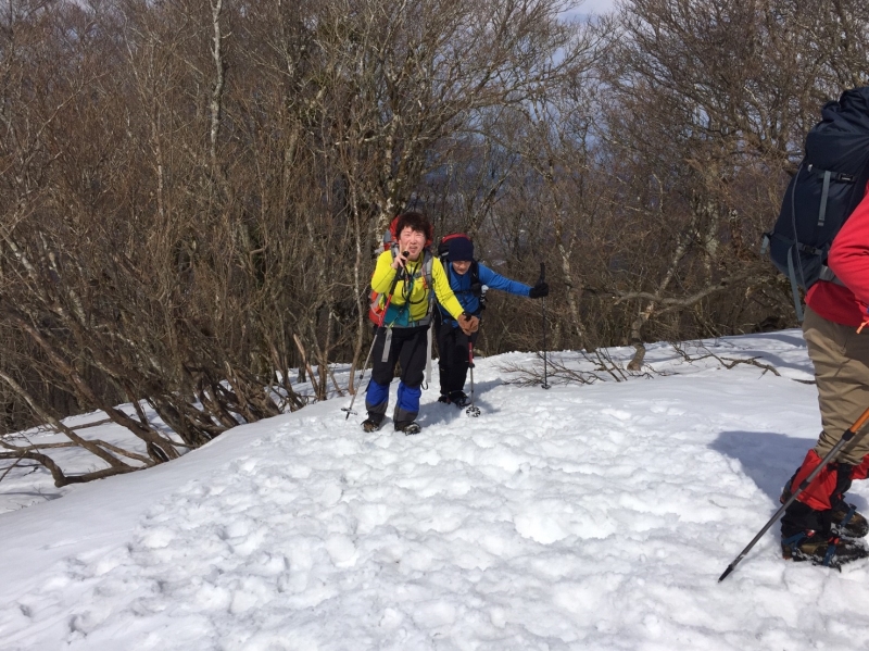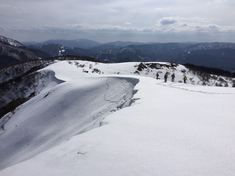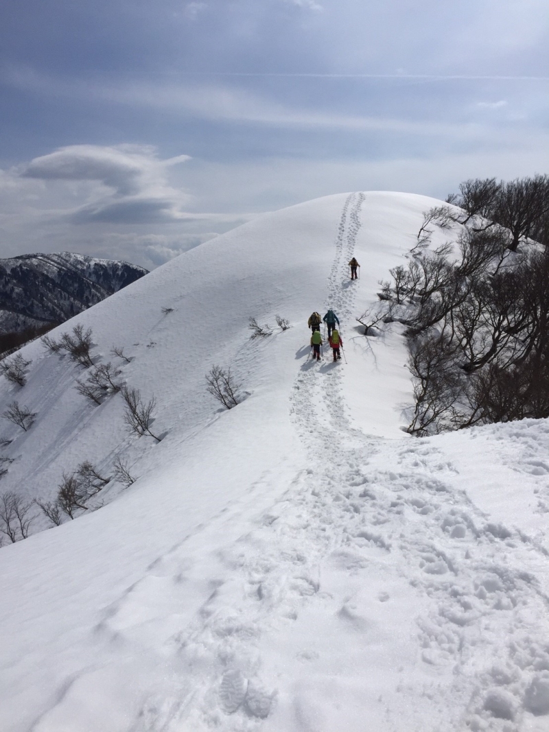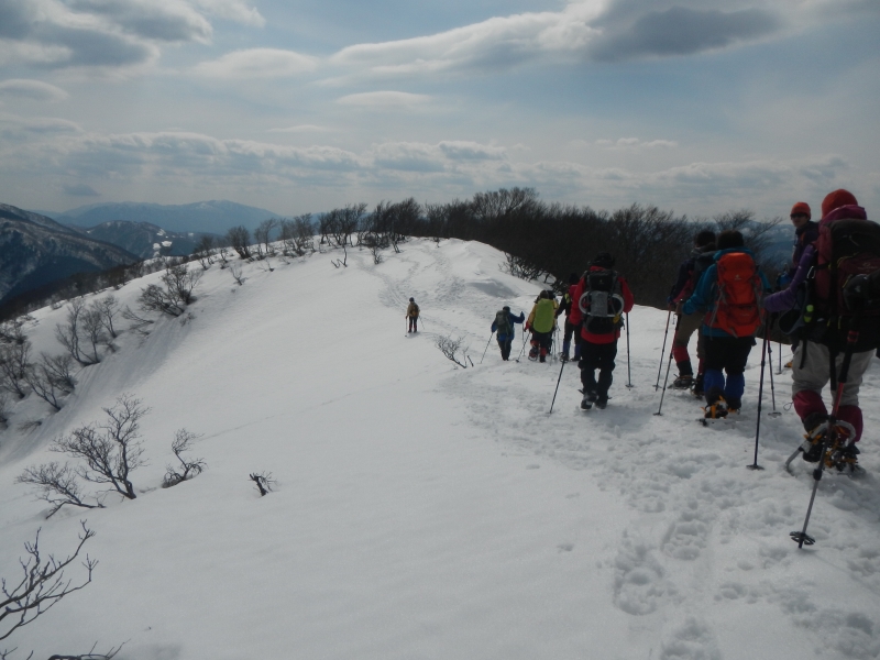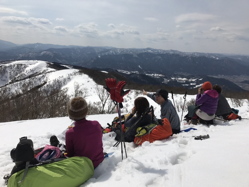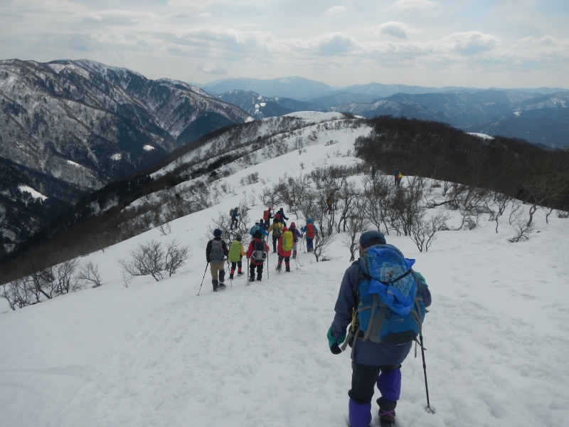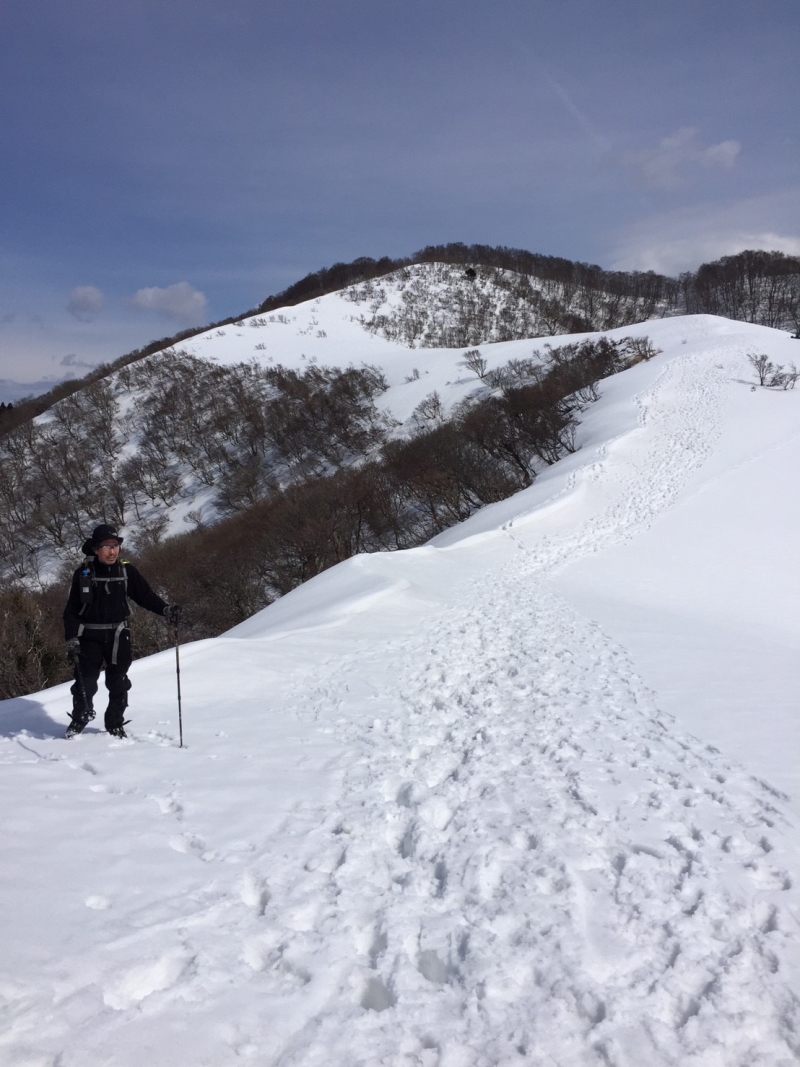 9:00ごろ倉見駐車場に到着です。すごい天気良く、みんなの期待が高まります。頂上付近、この時期はたっぷり雪があって、雪庇が張り出してるとのこと。スタート直後は暖かすぎて、稜線は雪が少なめでした。頂上もダメかと思いきや、頂上付近の稜線にはたっぷり雪があり、雪庇も小さめですが、ちゃんとありました。風もなく、ポカポカ陽気の中、ランチタイムです。若狭湾の海と連なる雪山の景色をゆっくり堪能しました。(時間の関係で、三十三間山のピークは割愛)