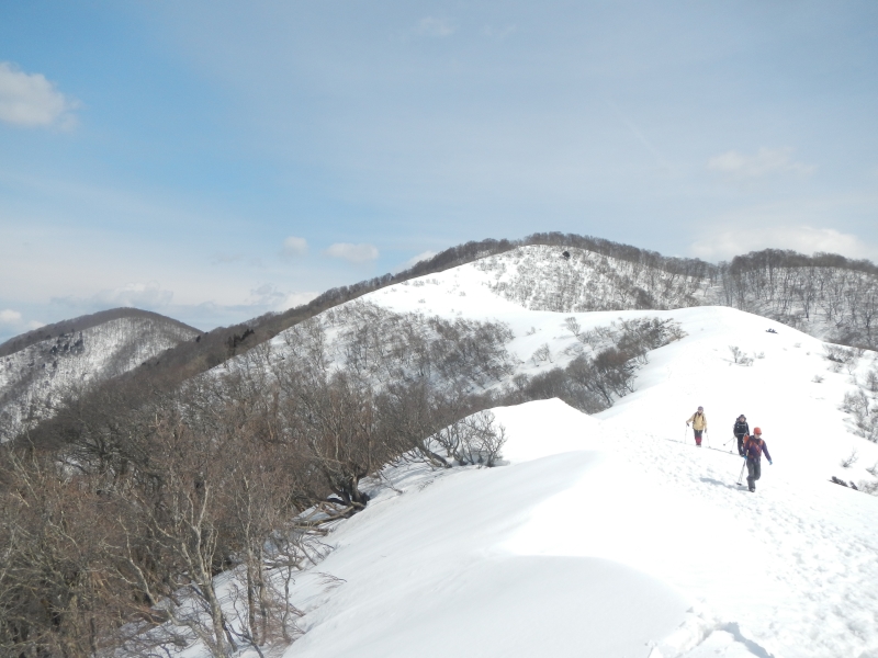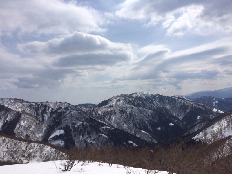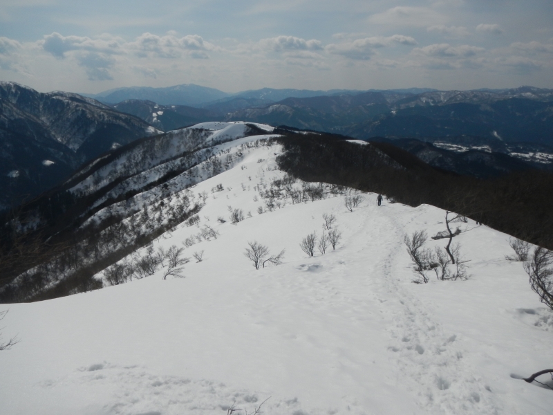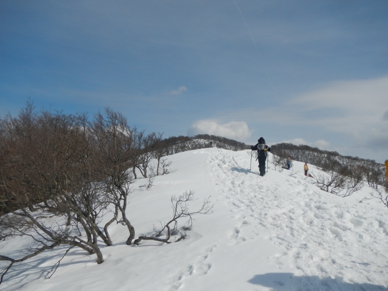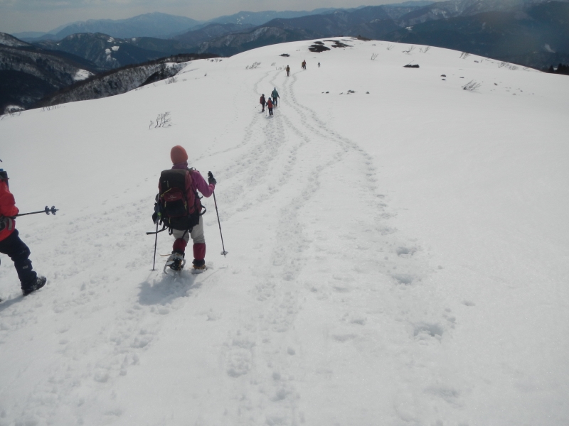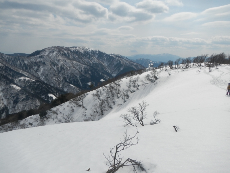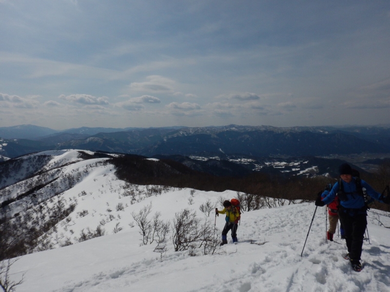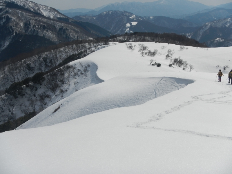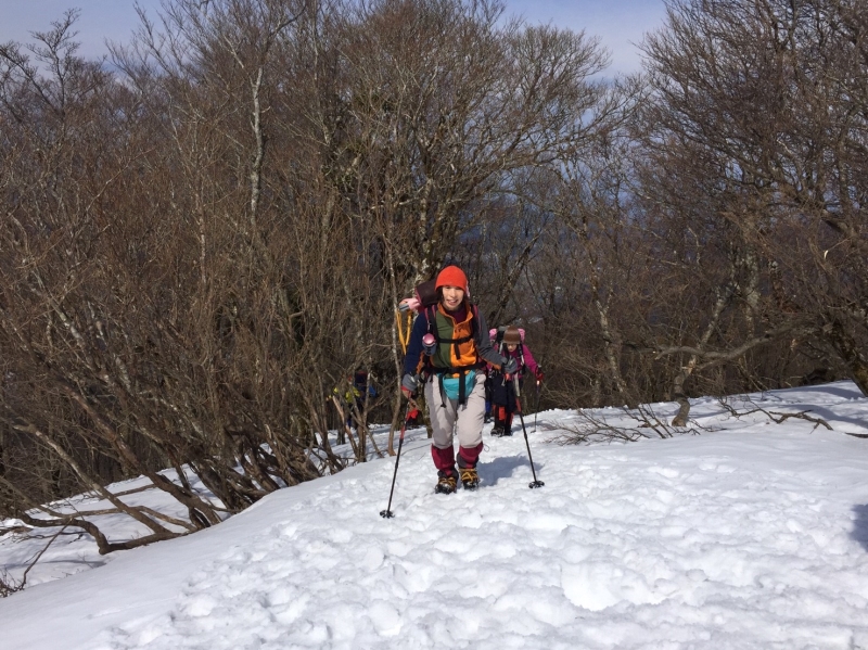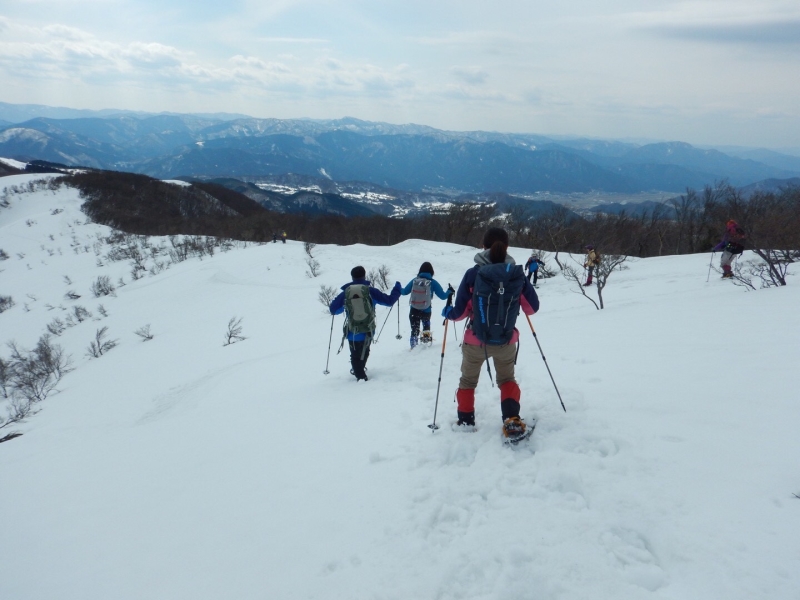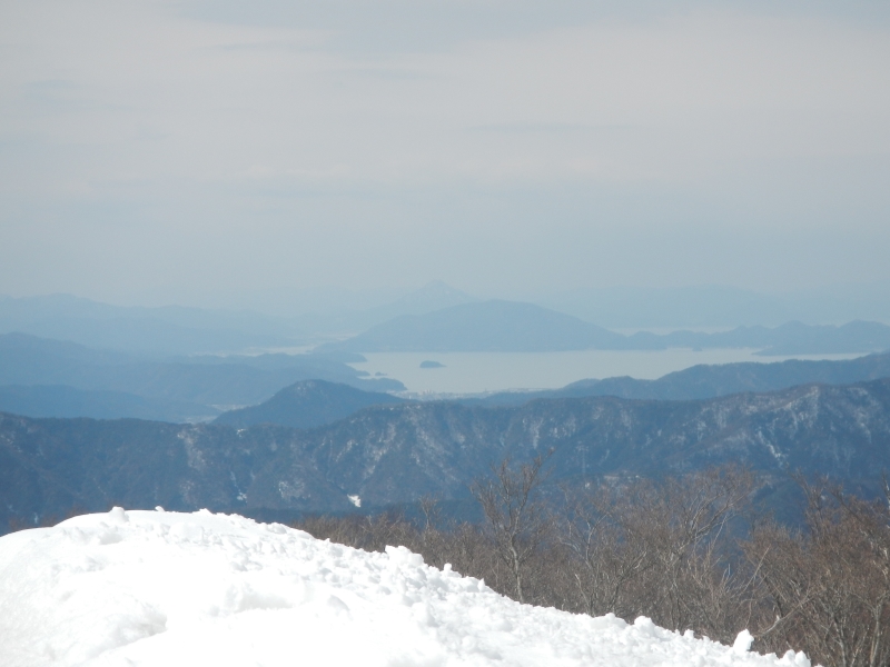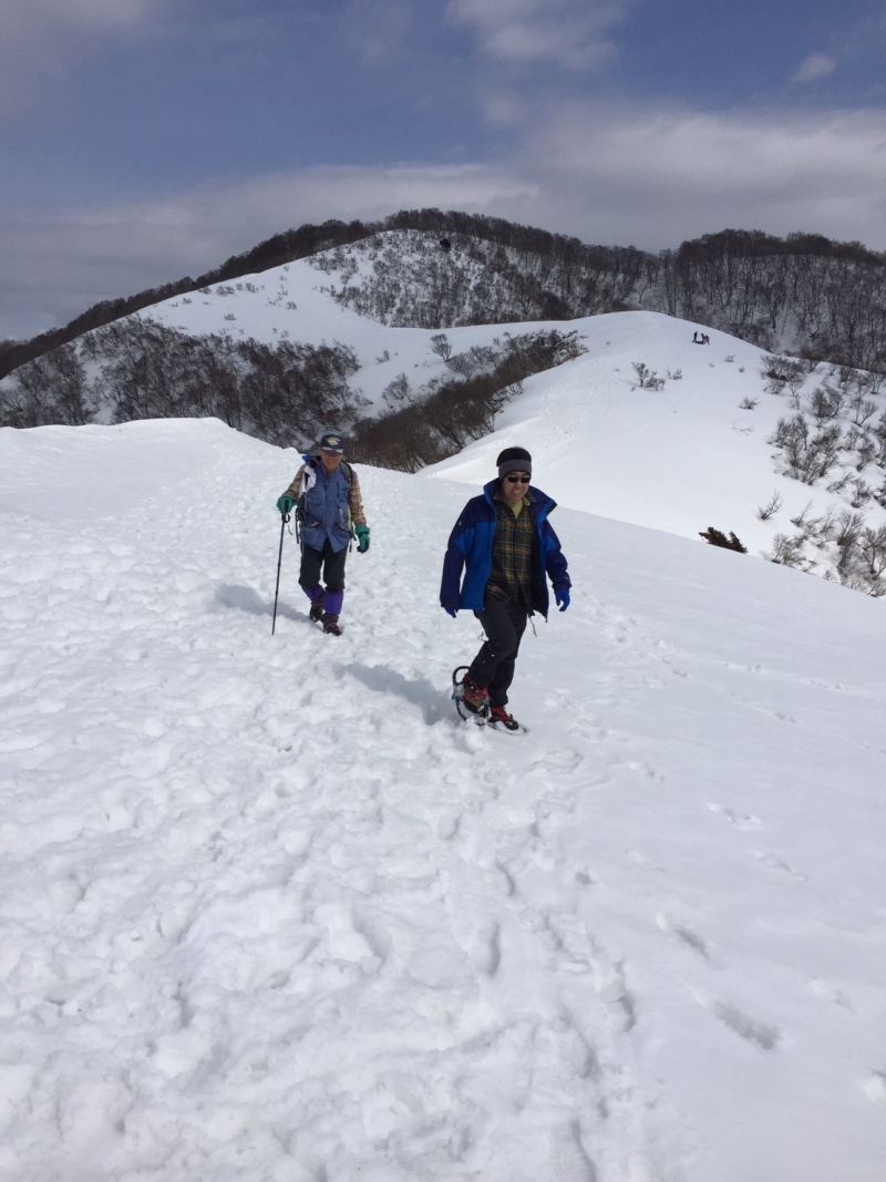 9:00ごろ倉見駐車場に到着です。すごい天気良く、みんなの期待が高まります。頂上付近、この時期はたっぷり雪があって、雪庇が張り出してるとのこと。スタート直後は暖かすぎて、稜線は雪が少なめでした。頂上もダメかと思いきや、頂上付近の稜線にはたっぷり雪があり、雪庇も小さめですが、ちゃんとありました。風もなく、ポカポカ陽気の中、ランチタイムです。若狭湾の海と連なる雪山の景色をゆっくり堪能しました。(時間の関係で、三十三間山のピークは割愛)