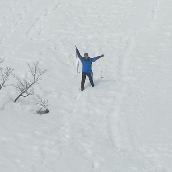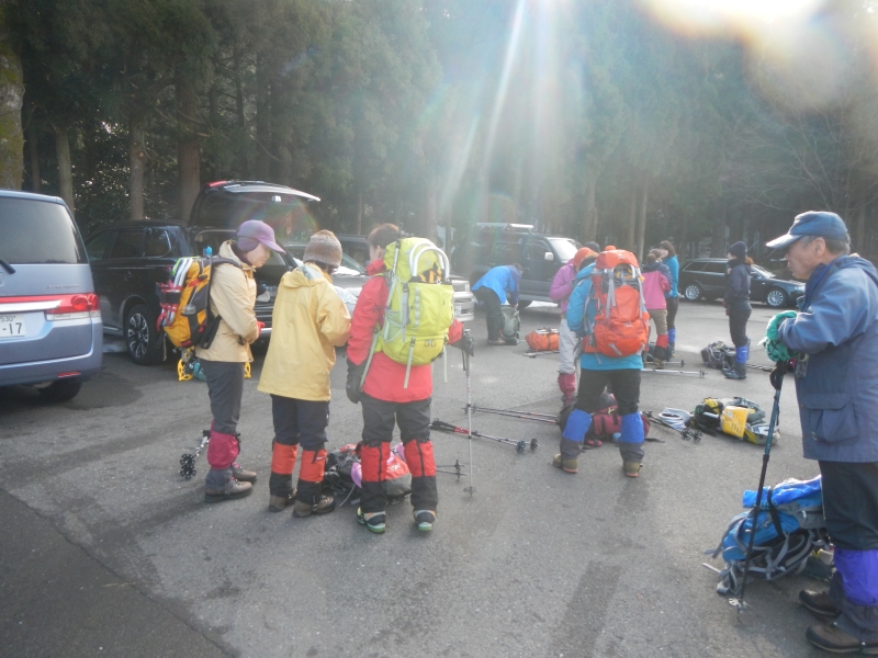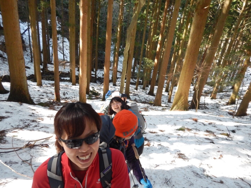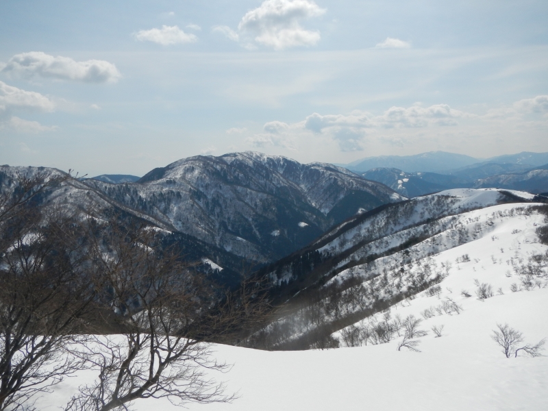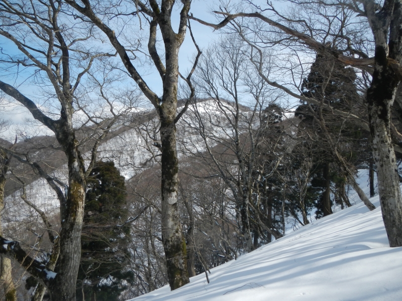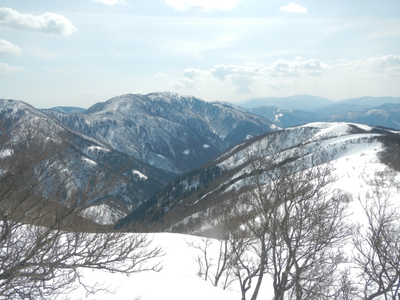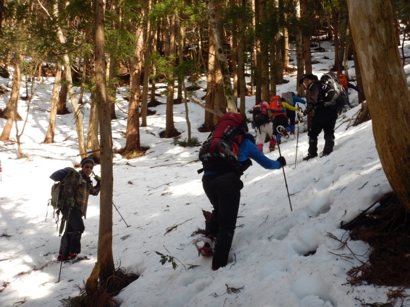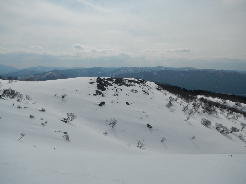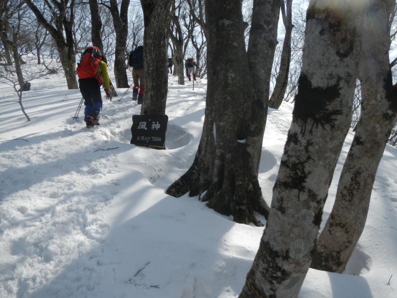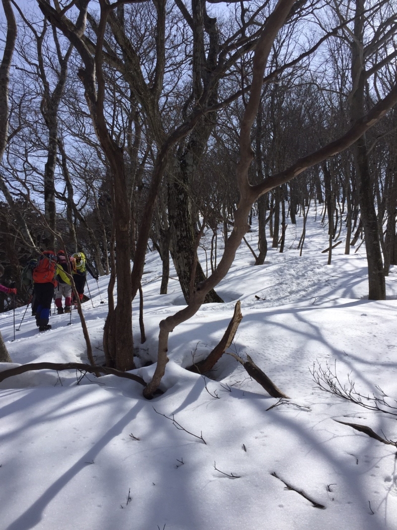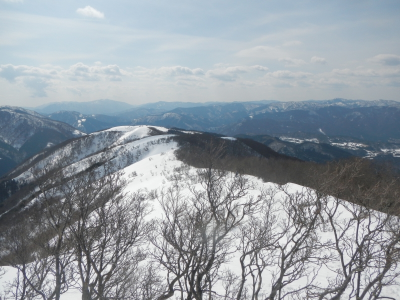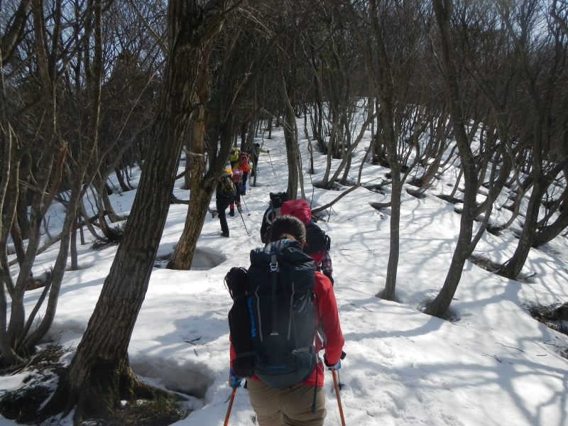 9:00ごろ倉見駐車場に到着です。すごい天気良く、みんなの期待が高まります。頂上付近、この時期はたっぷり雪があって、雪庇が張り出してるとのこと。スタート直後は暖かすぎて、稜線は雪が少なめでした。頂上もダメかと思いきや、頂上付近の稜線にはたっぷり雪があり、雪庇も小さめですが、ちゃんとありました。風もなく、ポカポカ陽気の中、ランチタイムです。若狭湾の海と連なる雪山の景色をゆっくり堪能しました。(時間の関係で、三十三間山のピークは割愛)