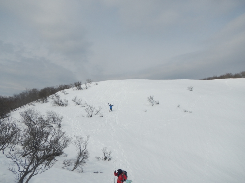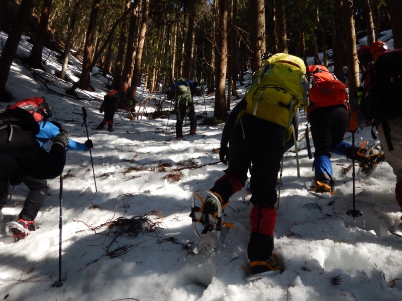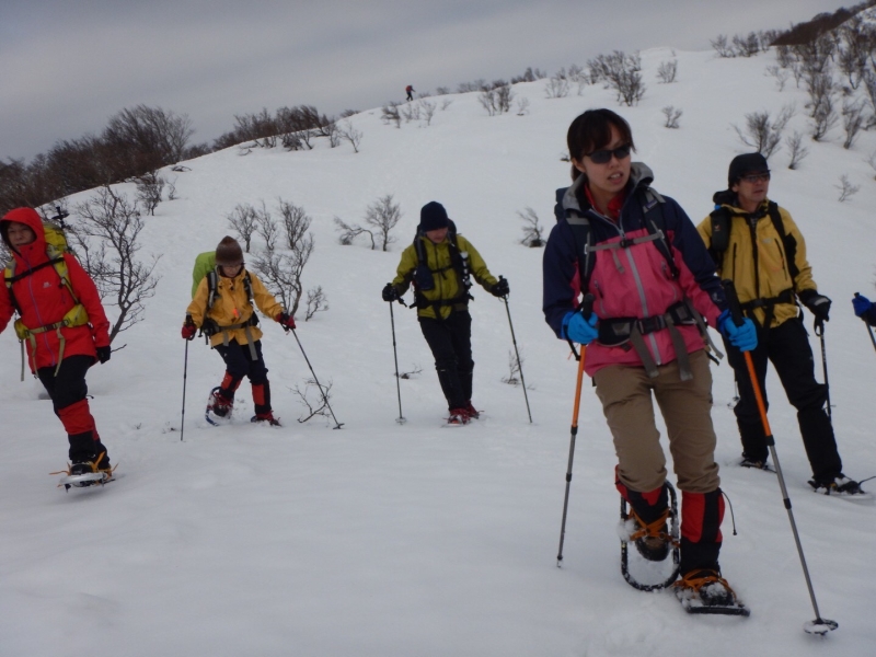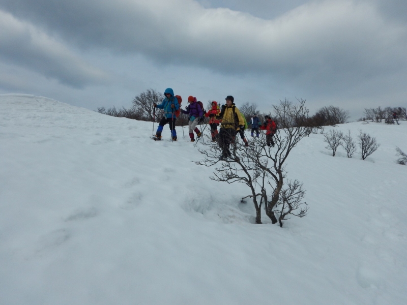 その後は、今日のメインイベント、ワカンで雪山稜線歩きです。天気良い、風もない、雪たっぷりという最高の条件がそろい、みんなハイテンションです。雪面稜線のアップダウンを駆け抜けました。