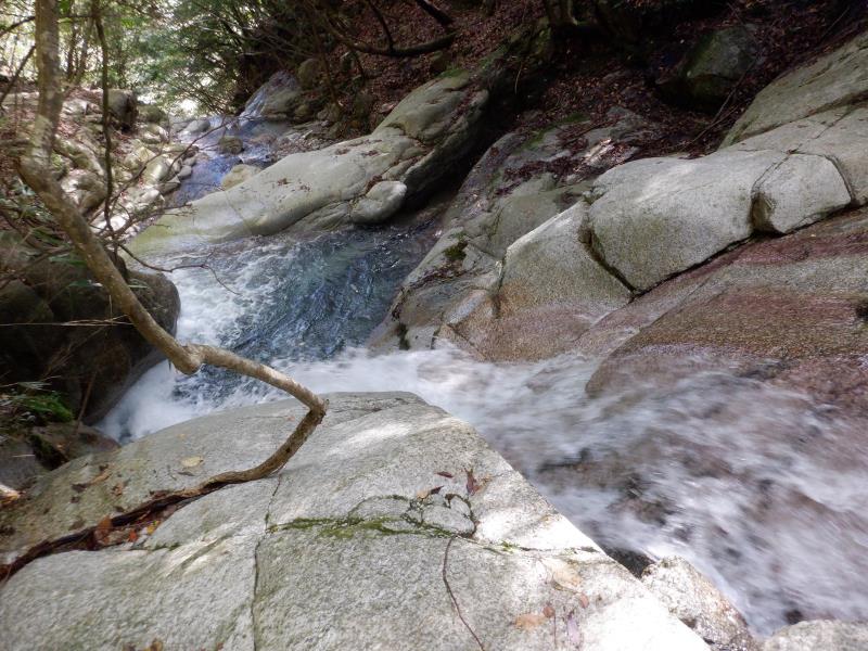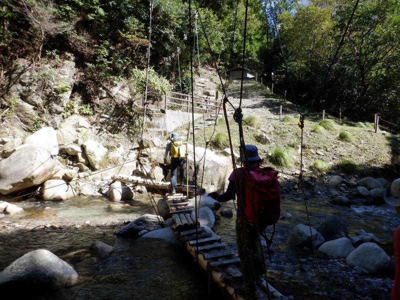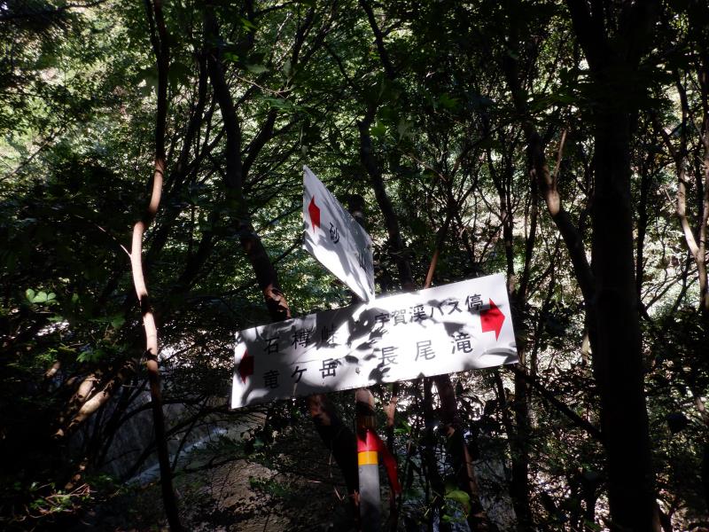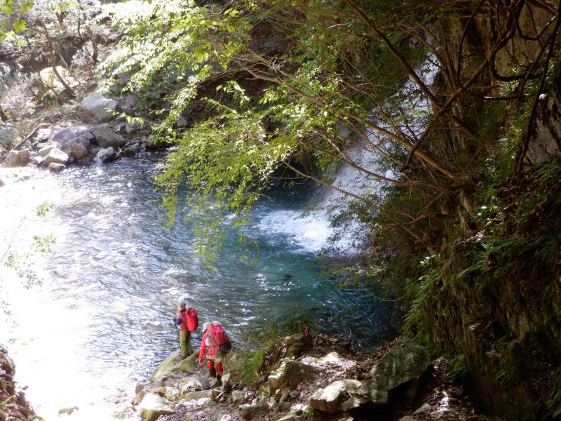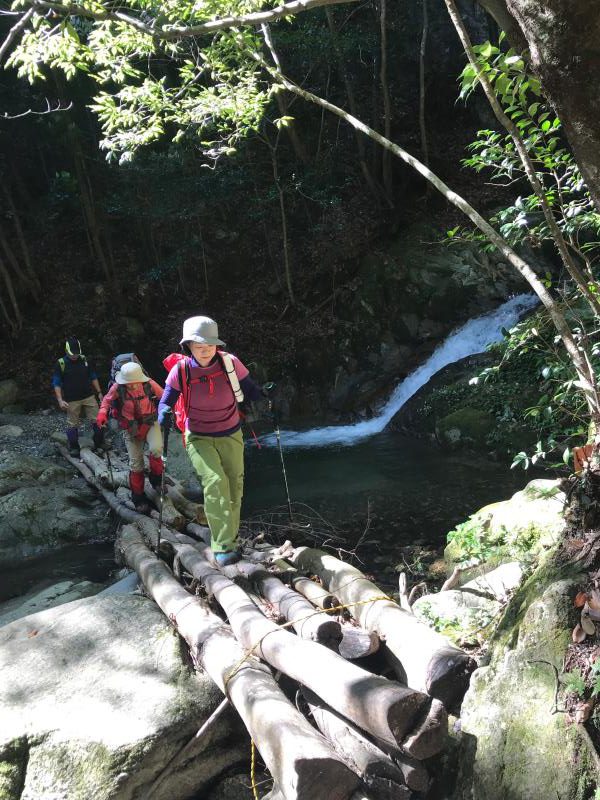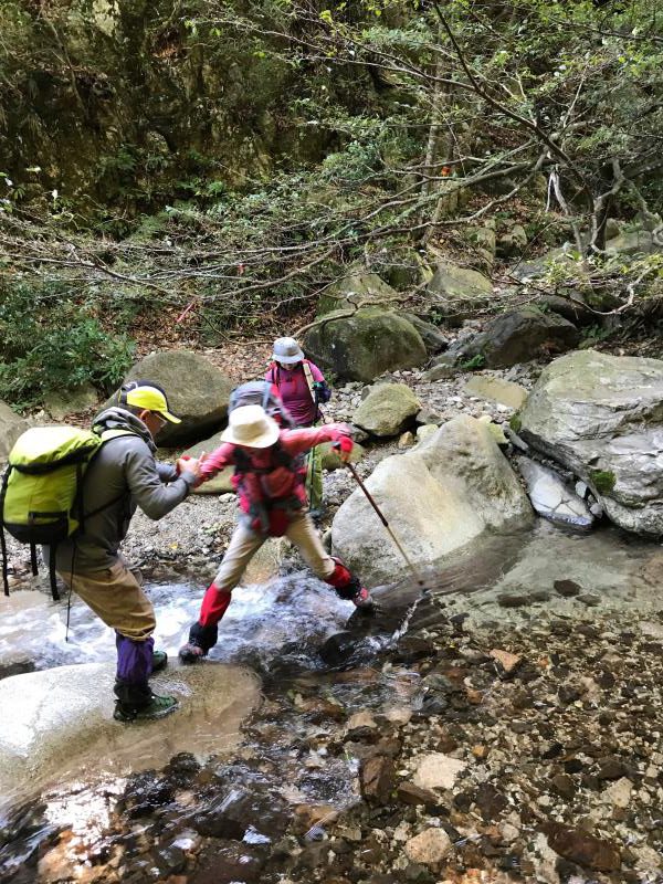 初日の、宇賀渓本流沿いの下山は、久しぶりに沢に触れられた感満載で、水量もそれほど多くなく、マイナスイオンを浴び、とても気持ちよく、渡渉ではみんなでわいわいとプチ沢気分を満喫できました。。