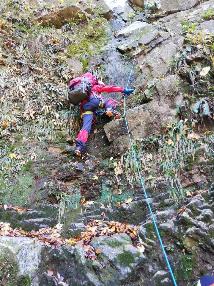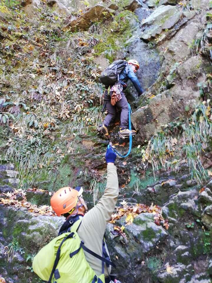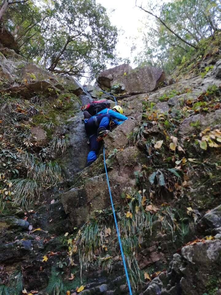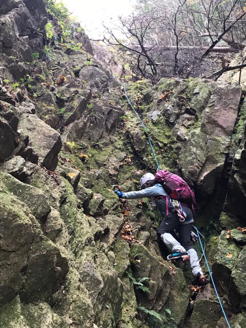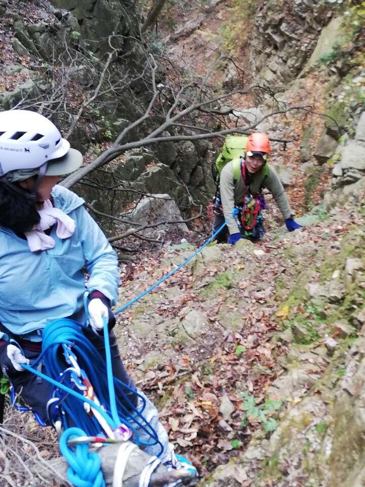 L、SLが張った固定ロープを、本日前爪アイゼンデビューの新会員Yさん含め5名がアッセンダーを使って登る、という変則パーティー。