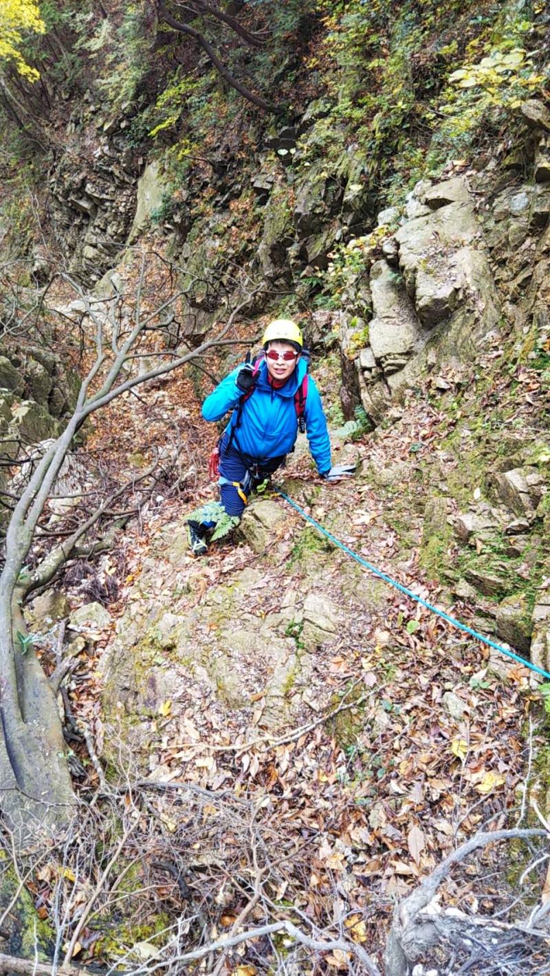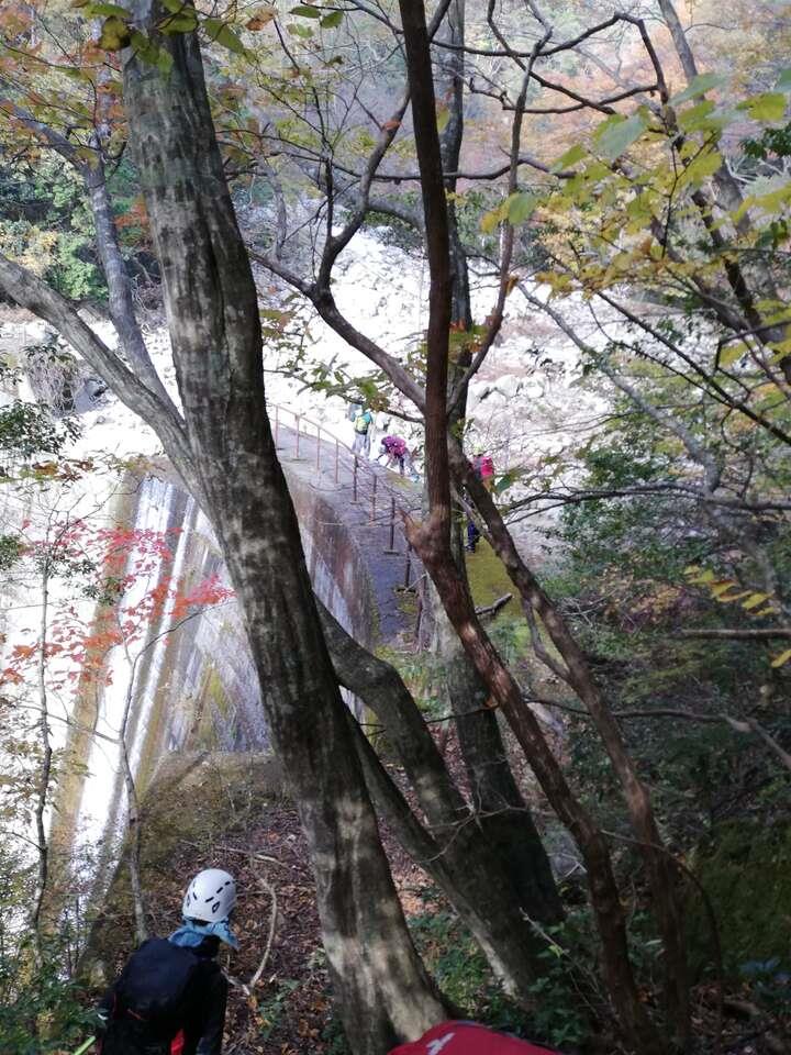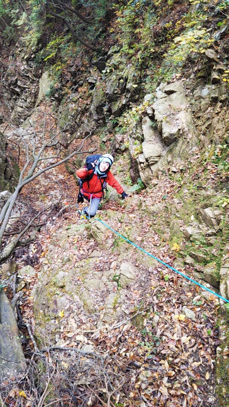 L、SLが張った固定ロープを、本日前爪アイゼンデビューの新会員Yさん含め5名がアッセンダーを使って登る、という変則パーティー。