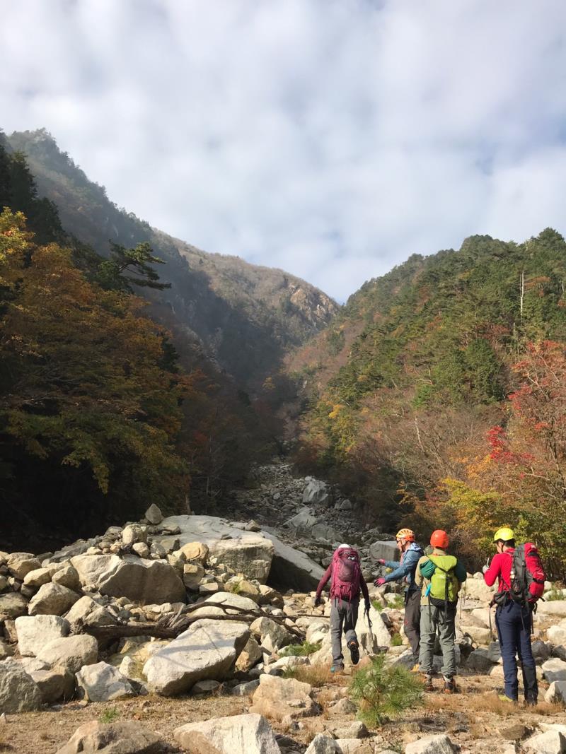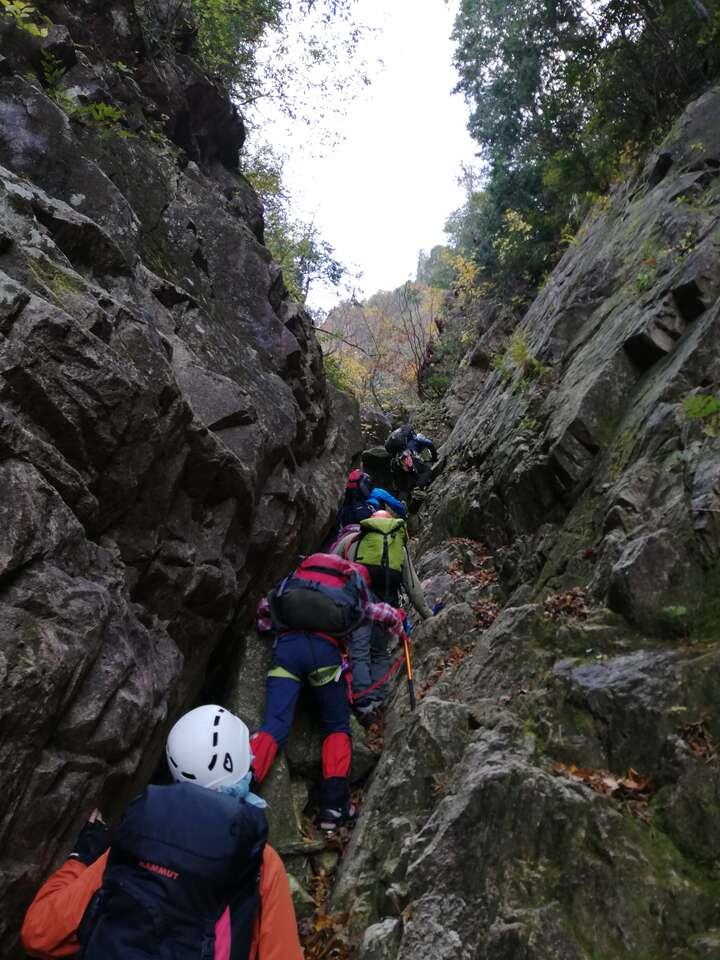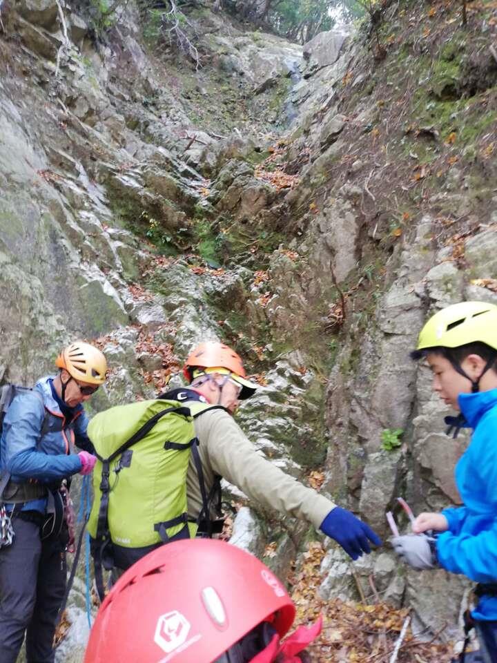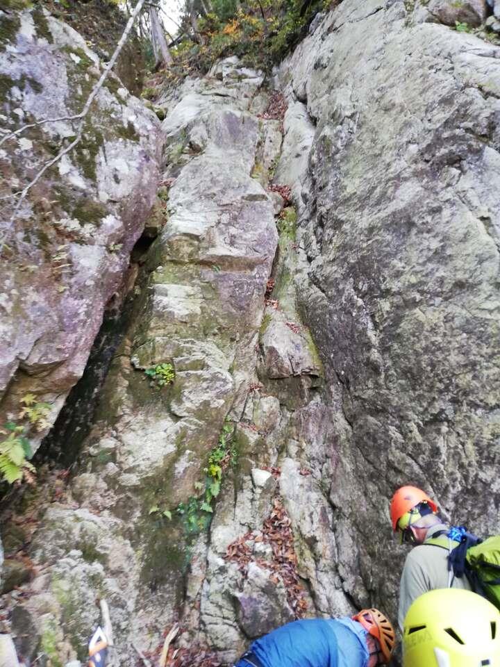 無雪期のアルファルンゼでアイゼントレーニングを行った。車を一台、下山するキタダカ道の木戸登山口にデポ。あとの2台でルンゼの取付きまで向かう。