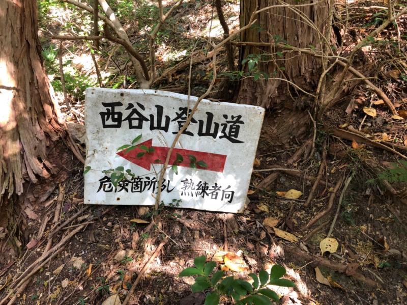 六甲山の谷歩きでは難しいコースに数えられている西山谷です。谷の入口には「熟練者向け、危険な岩場あり」の看板があります。
