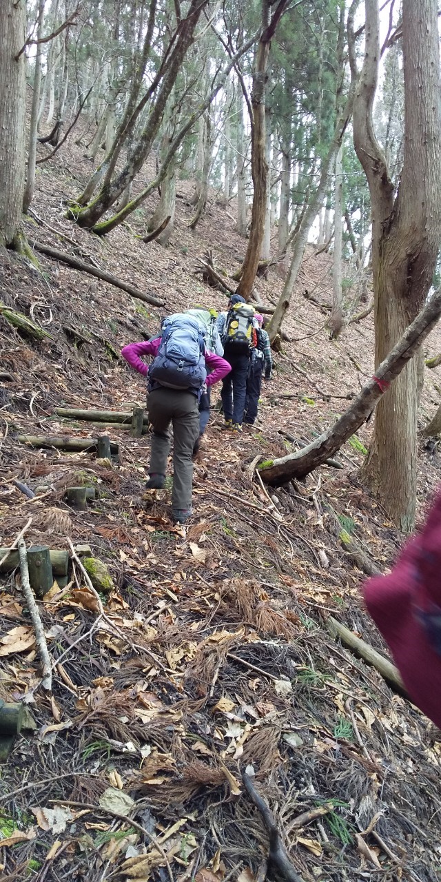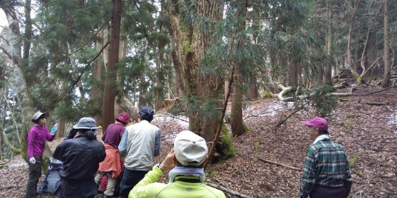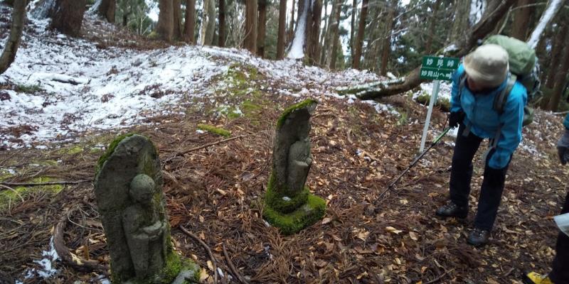 山頂より妙見峠を目指して出発。此処の尾根には、素晴らしいブナの木が並んでします。新緑か紅葉の頃にもう一度訪れたい。妙見峠は村岡区作山と八鹿町日畑を結ぶ旧街道で流石に道もしっかりとしています。登山の最後は名草神社にある三重塔。4匹の猿の確認できました。