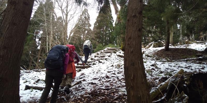 氷上町を越える辺りから周りの山々は霧に隠れて山頂部がかすかに見える風景。きっと今日は竹田城址が雲海に浮かんでいるのだろう。7km余りの林道走り、妙見登山口駅の表示のあるところに到着。登山道はしっかりと整備もされておりますが、階段が続きます。1,000mを越える辺りから白いものが辺りを覆ってきました。