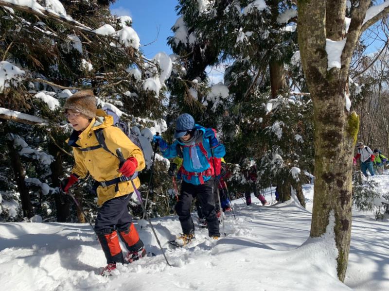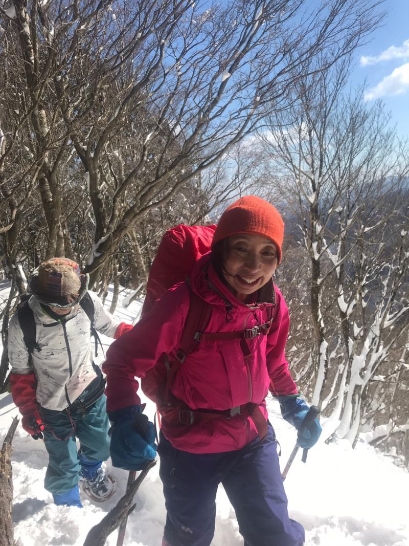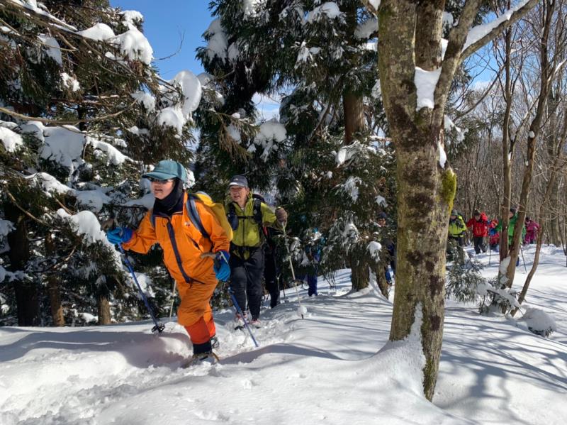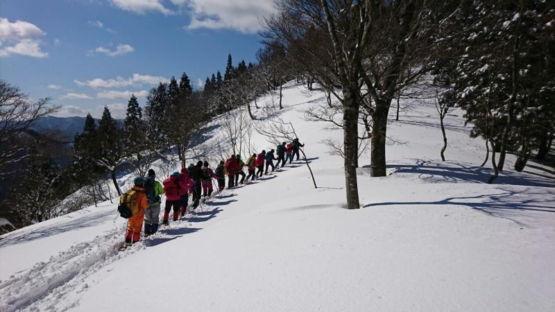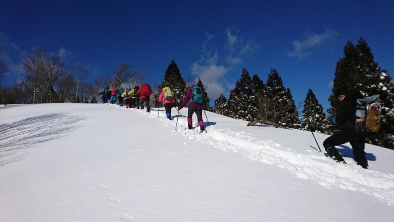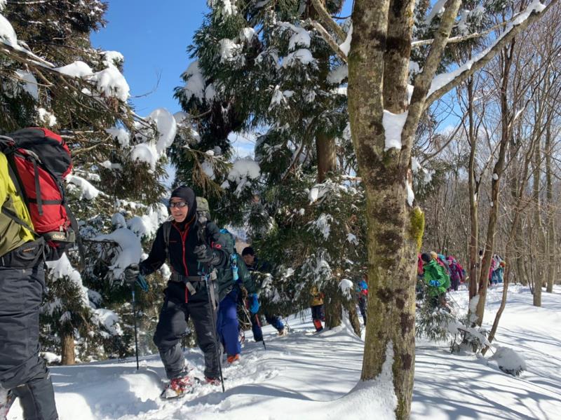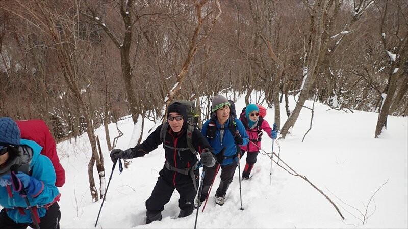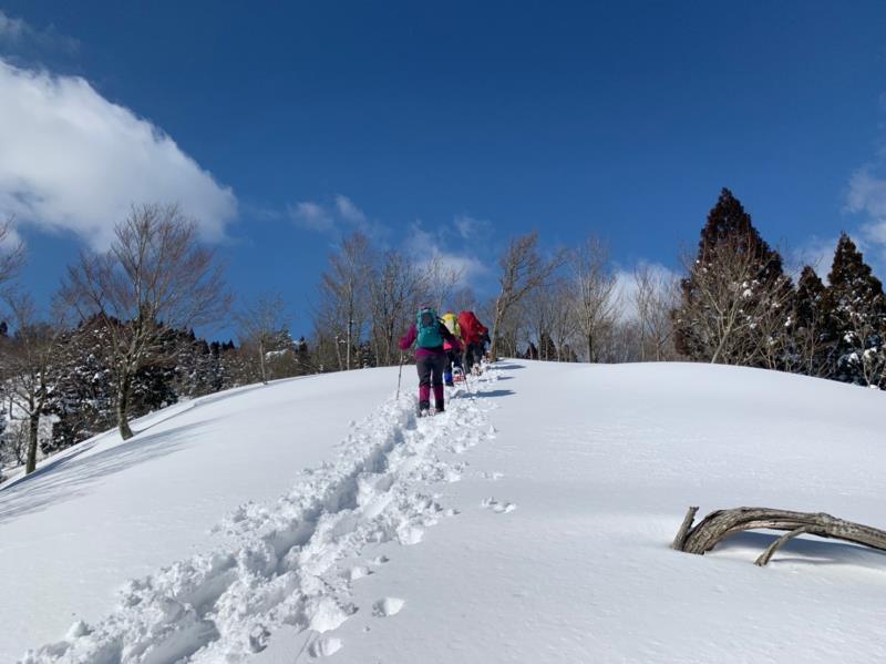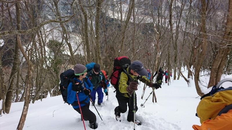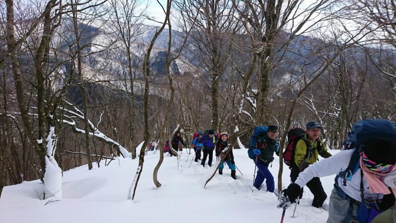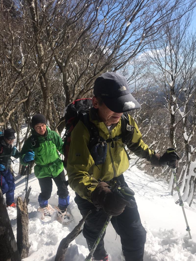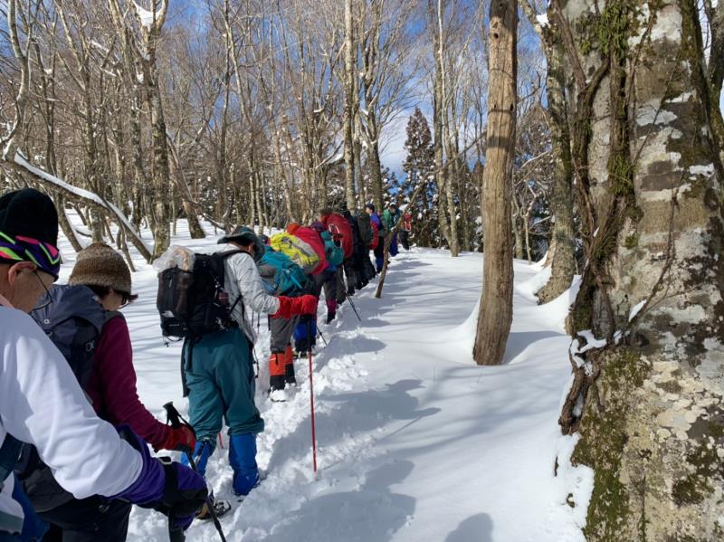東尾根の途中からワカンを装着し、トレースのない白銀の世界を一列になってラッセル歩行しました。