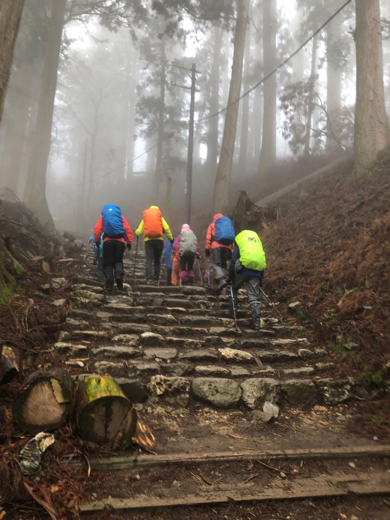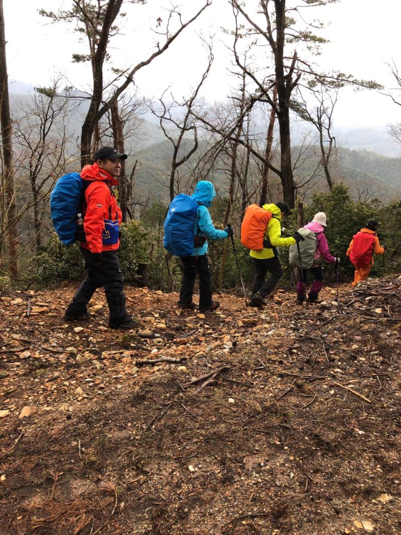 春の雨が残る清滝に リーダーと会員9名 レインウエアで集合しました