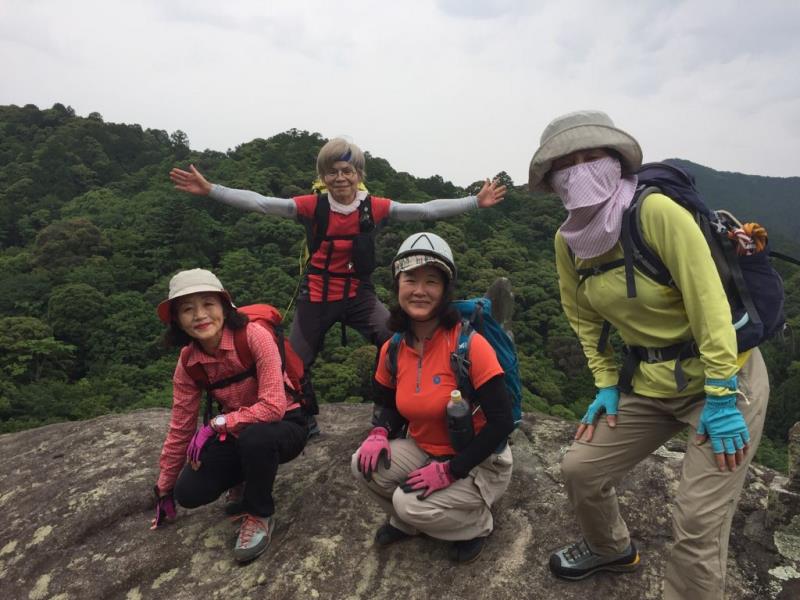 待ちに待った例会再開の日、1300年以上続いている修験道の行場「伊勢山上」を歩いた。久しぶりの例会で皆さん笑顔がこぼれていたものの、最初の難所、約20mの岩壁の登り“油こぶし”を前に緊張感が走る。その次の高さ約5mの人工壁のような砂岩を無事登り終えると、再び和やかな雰囲気に。抱付岩、小天井を過ぎて森に囲まれた尾根道に入ったところでまさかの雷鳴を2度聞く。土砂降りがくるのかと思いきや、1時間ほど小雨が降ったり止んだりしただけで、その後の岩稜歩きに影響はなかった。表行場と裏行場、合わせて6キロ弱の山行だったが、心地よい緊張感を味わいながら新鮮な森の空気をいっぱい吸い込んで、皆さんと例会再開の喜びを分かち合えた。(S.I)