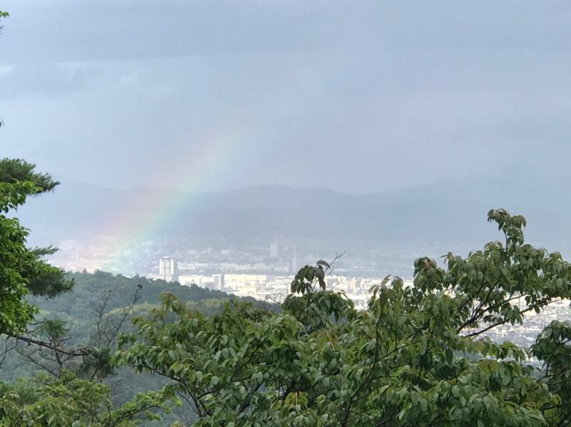 途中カッパを着ながらも最後は虹の出現で気持ちが和らぎ、体験山行の方も含め全員元気に19kmを完歩しました。