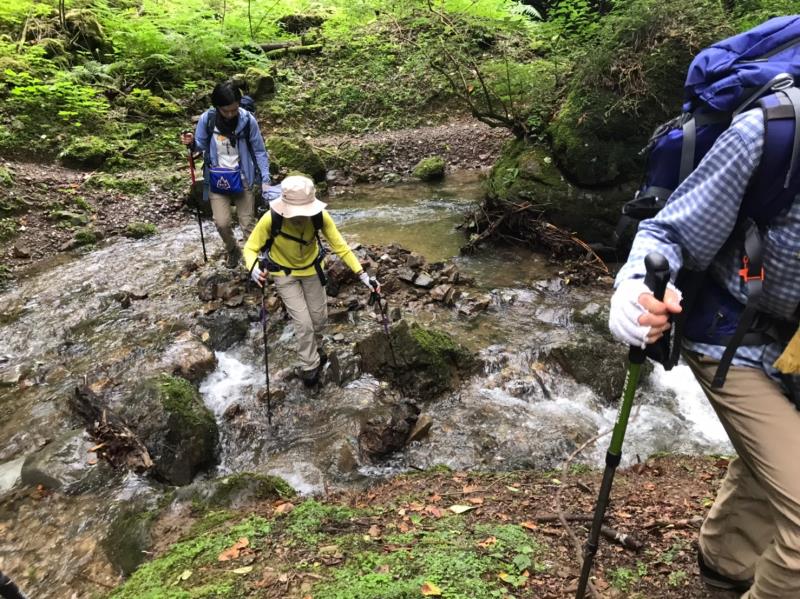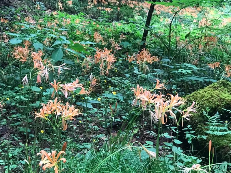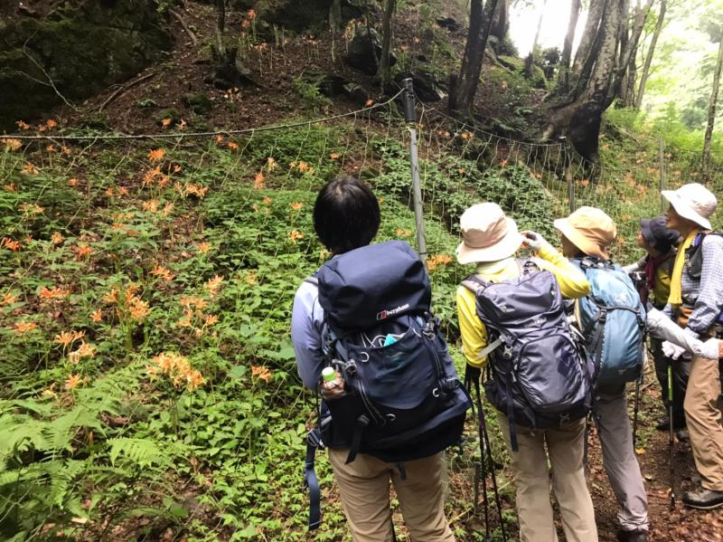 水嵩が増した渡渉を繰り返すと目の前に色鮮やかなオレンジ色が。キツネノカミソリが満開でした。ここで全コースの半分9.5km。