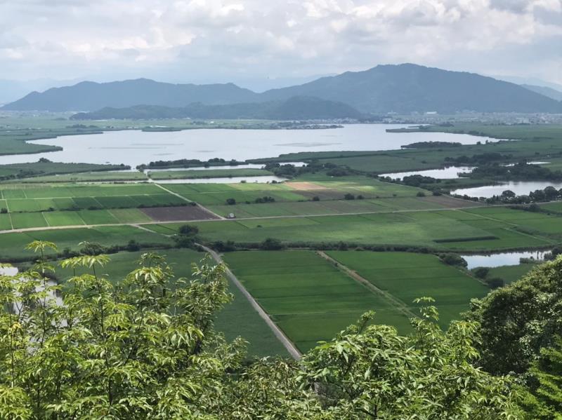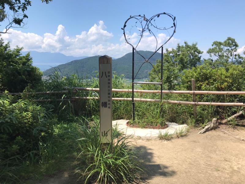 稜線に展望台がいくつかあり、近江盆地の緑豊かな田園風景と琵琶湖そして周辺の山々のコラボがすばらしい。暑さで減速気味ながら最終目的地の八幡山山頂に無事に到着した。