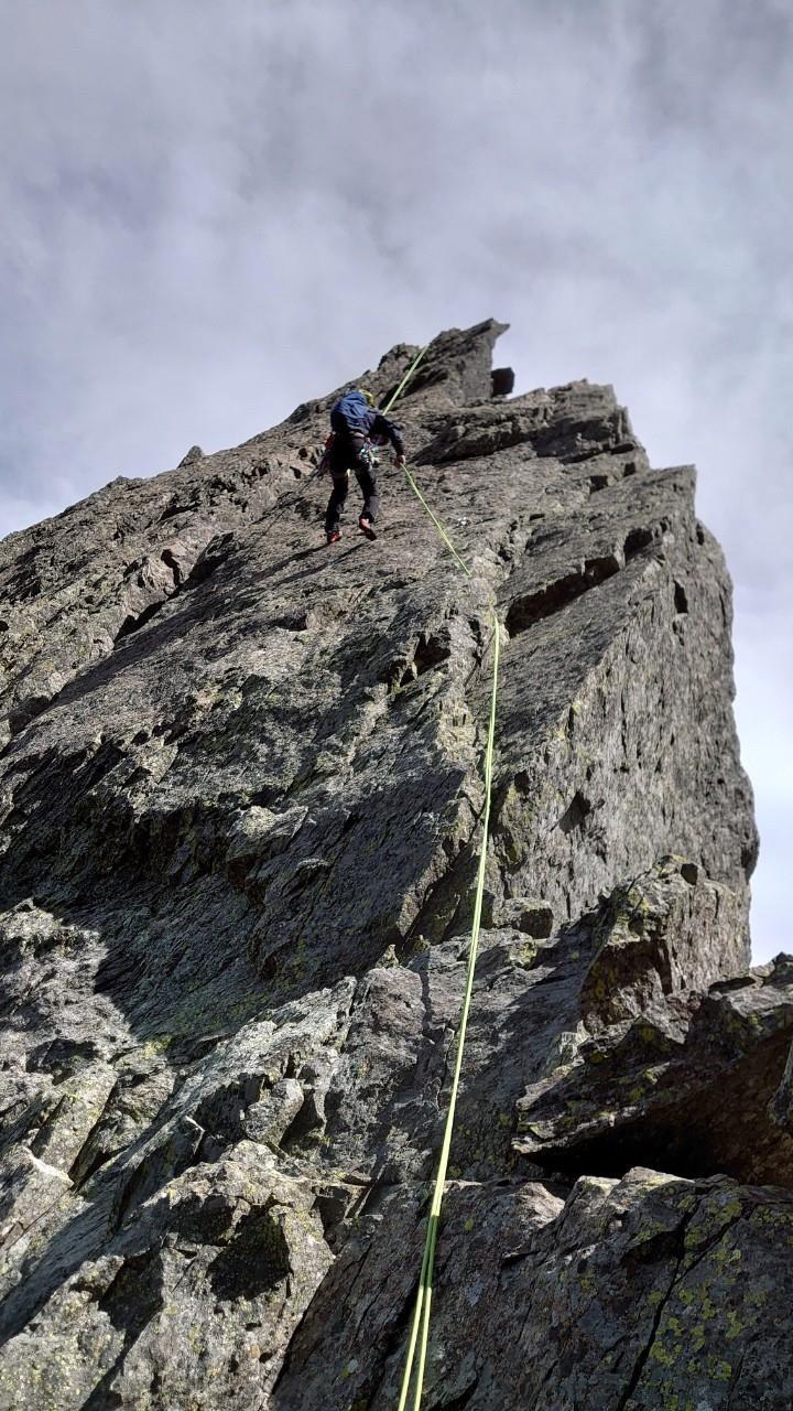 取り付きから10mほどフリーでビレイポイントに登り、25mほどの1ピッチで山頂横へ。支点は多く、岩も安定してるので、高度感を楽しみながら、クライミング。