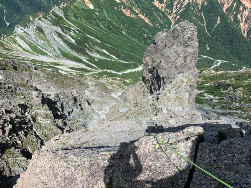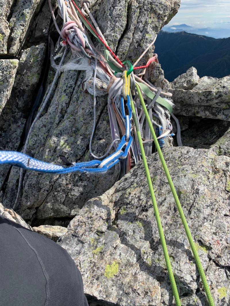 山頂からは、残置のビナを使って懸垂下降で取り付きまで。60mでギリギリ、50mのダブルロープがベスト。