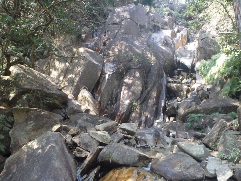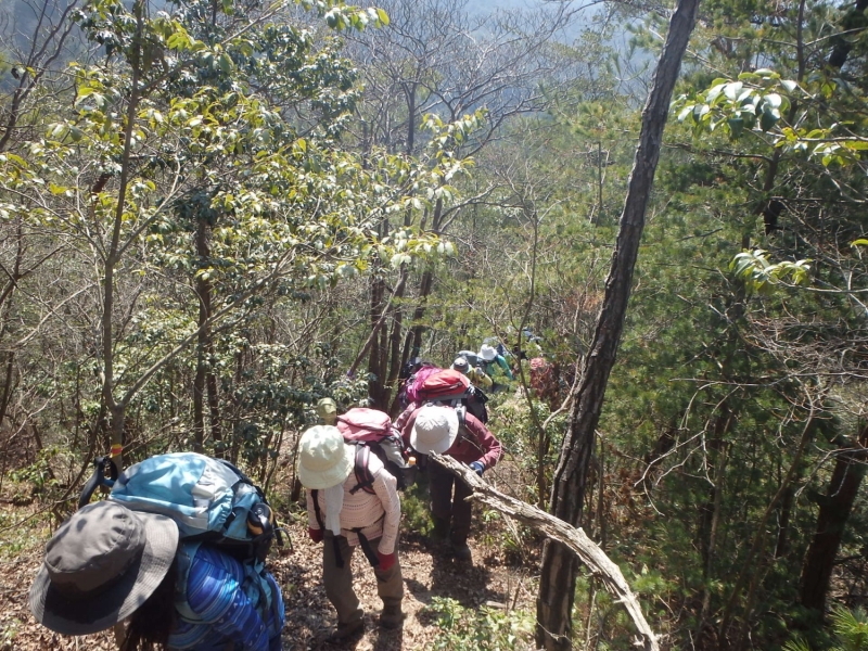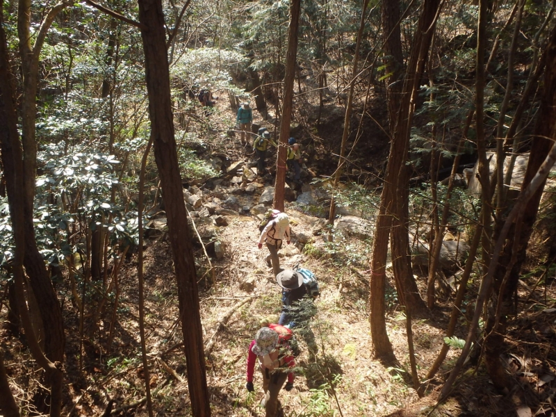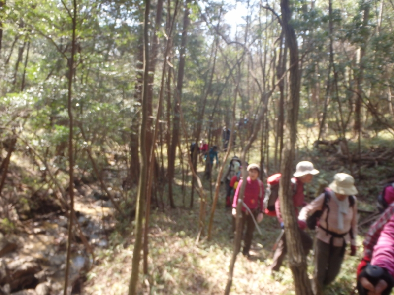 まず目指すは竜王山。歩き始めの瀬戸滝林道では春めいた小鳥のさえずりとやさしいせせらぎの水音が歓迎してくれた。続いて馬頭観音堂への熟達者向けルート。二万五千分の一地図にかろうじて破線で表記があるものの実際は、テーブ頼りの道なき道。ルートファインディングにはもってこいの場所である。とは言うものの歩行路は、木漏れ日が明るい里山風の林の中にあり小川もあって気持ちの良い山歩きとなった。そして馬頭観音堂への詰めは、展望を楽しみながらのやせ尾根歩き。爽快である。