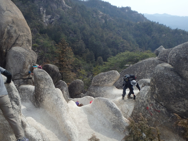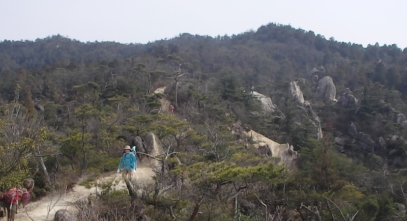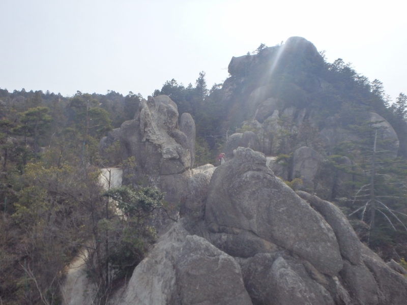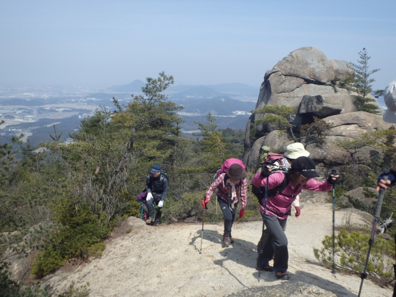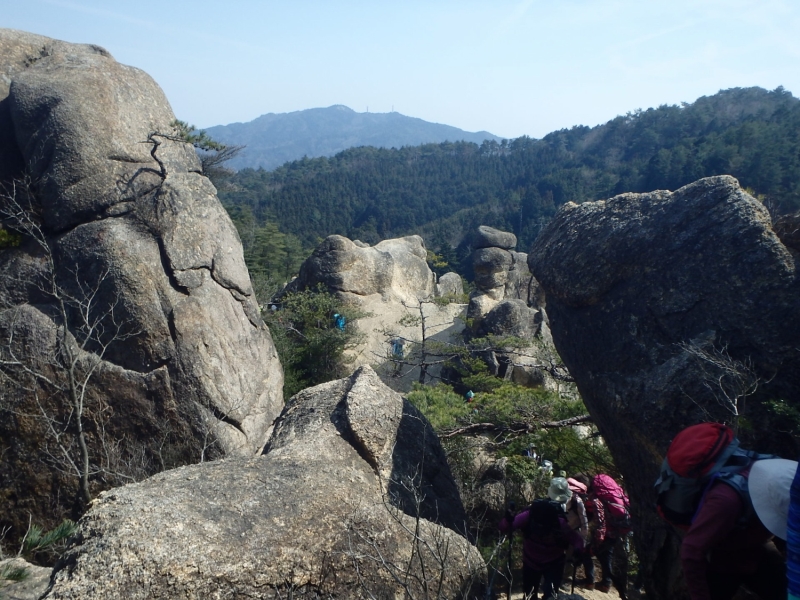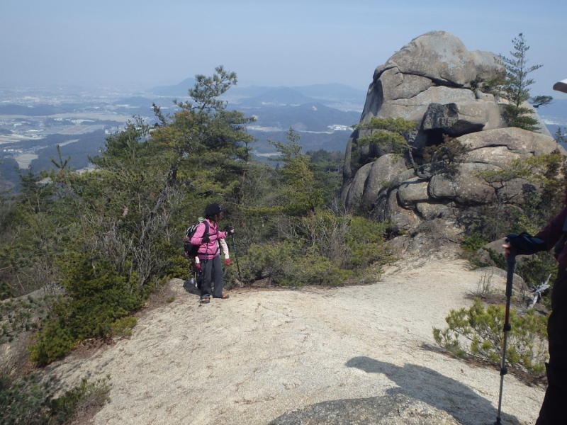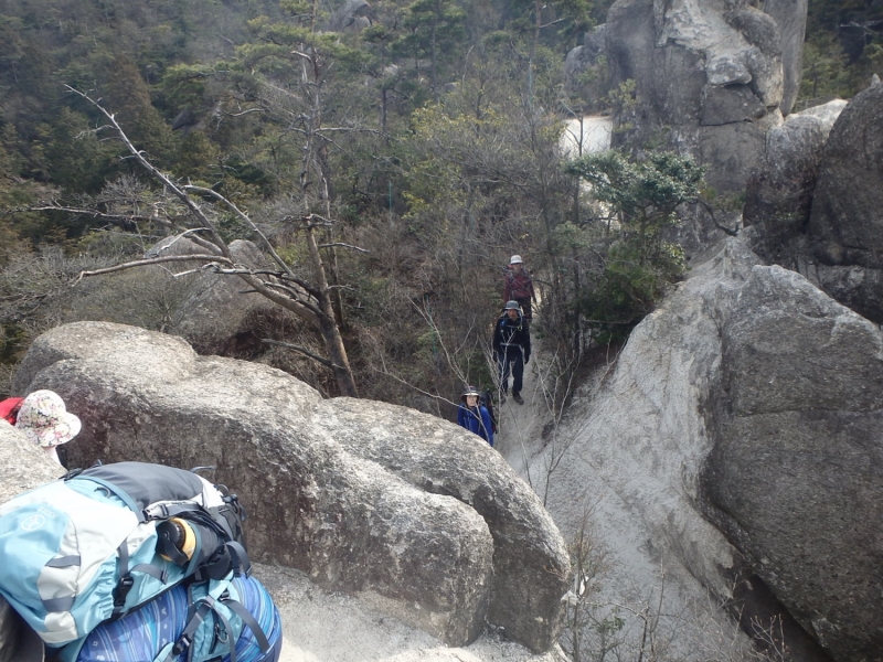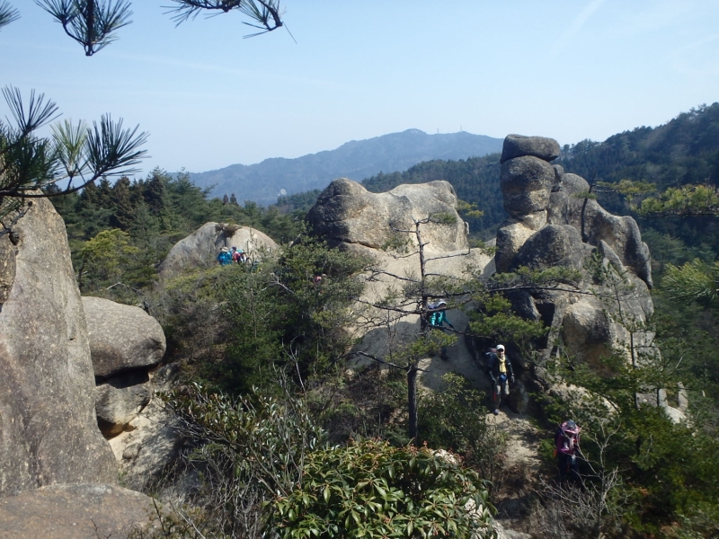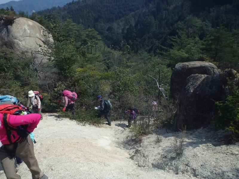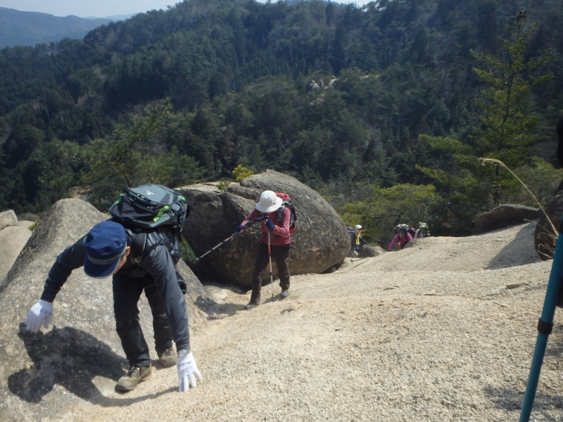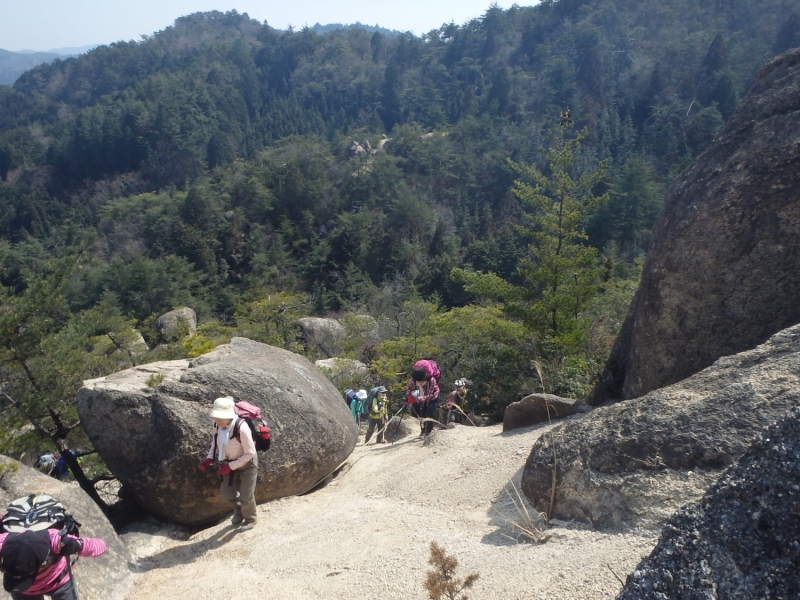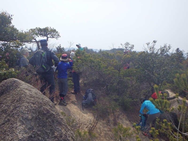 馬頭観音堂から少し林道を下り熊笹に踏み入ればそこが本日の目的地である竜王山北尾根の岩広場。大岩をぬうように巡りザレ場を駆け上がり退屈知らずの遊び場である。岩の上で、思い思いに昼食をとりしばし休憩。食事後は金勝アルプスのメインルートに入り、展望台の天狗岩では春霞みながら琵琶湖の奥に雪をかぶった武奈ヶ岳など展望を楽しんだ。ラストは鶏冠山を登って一汗かき、上桐生バス停に下りて例会を終えた。忘れられた登山道や岩巡りなど盛りだくさんの山行になったと思います。