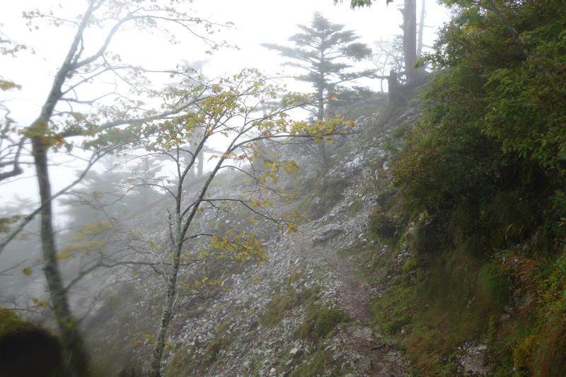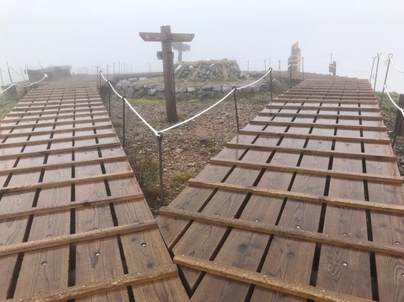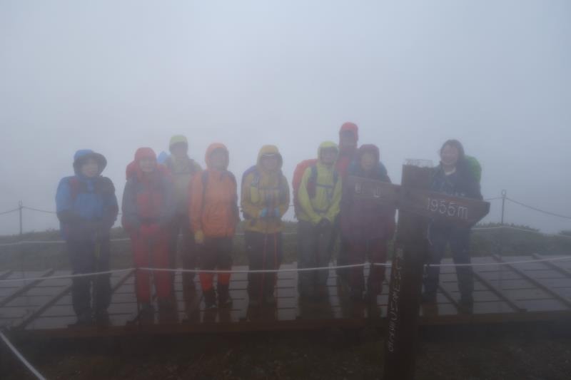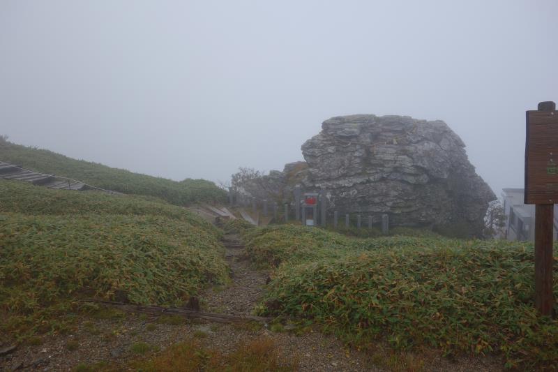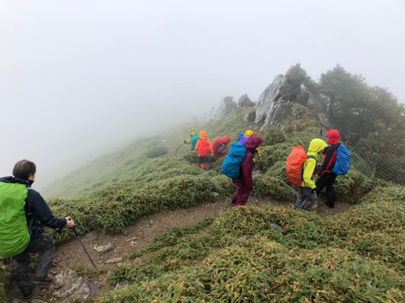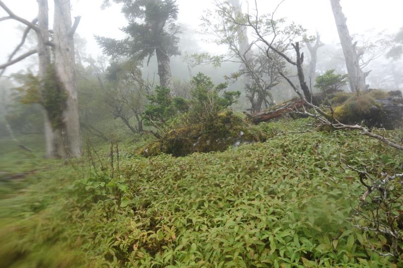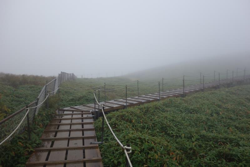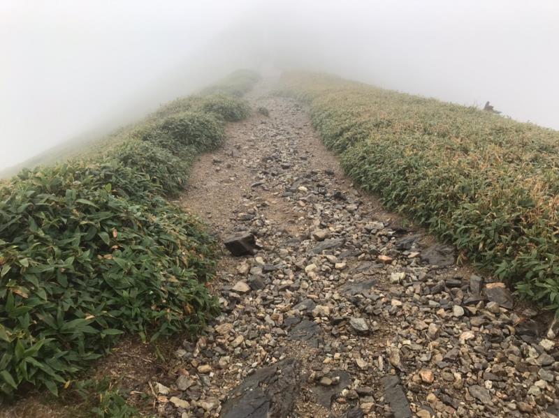 開放的な稜線が見ごたえ歩きがいがあると聞いていたがガスで視界不良、写真の通り目の前の山容すら想像できない状態が続いた。