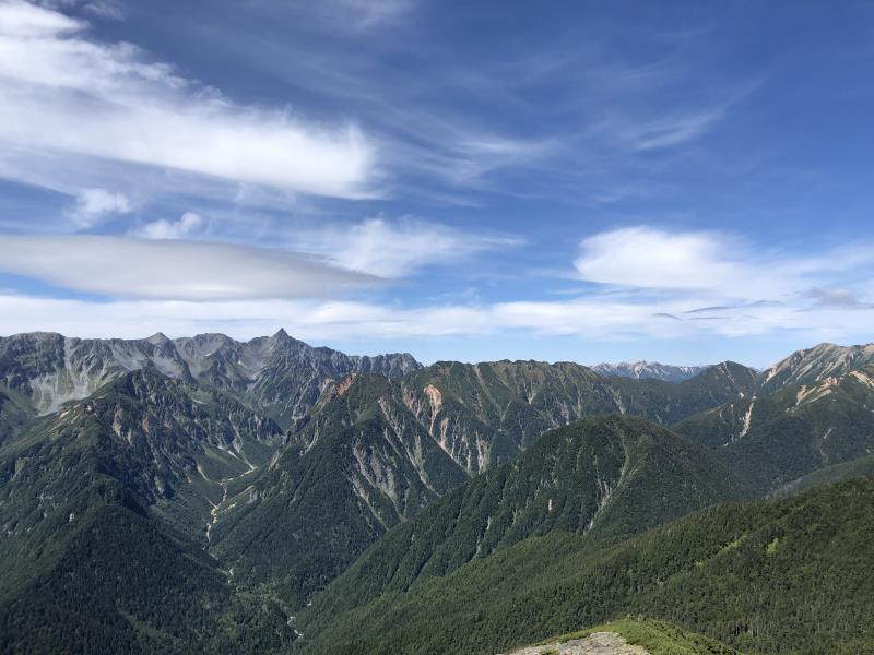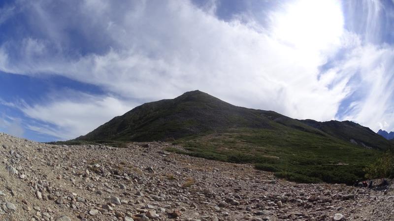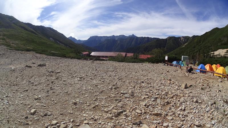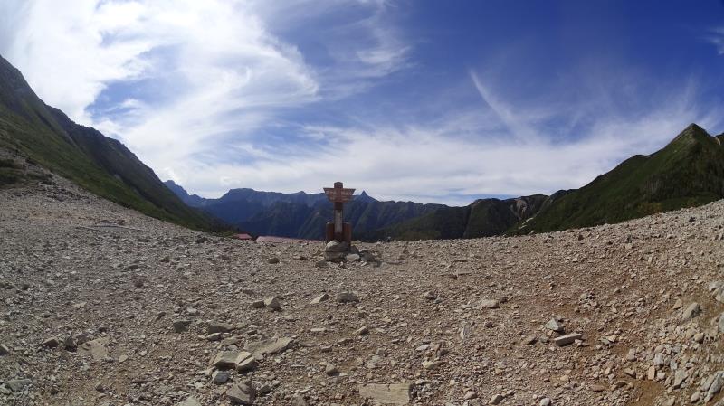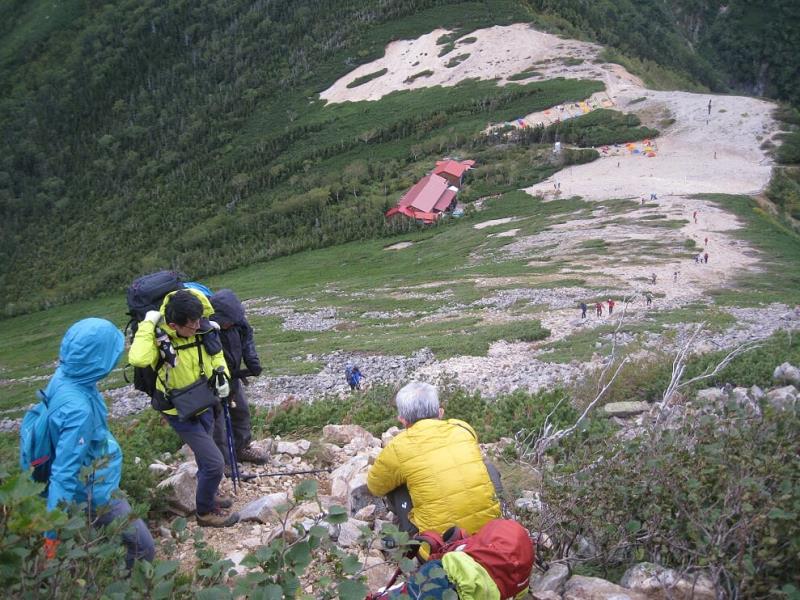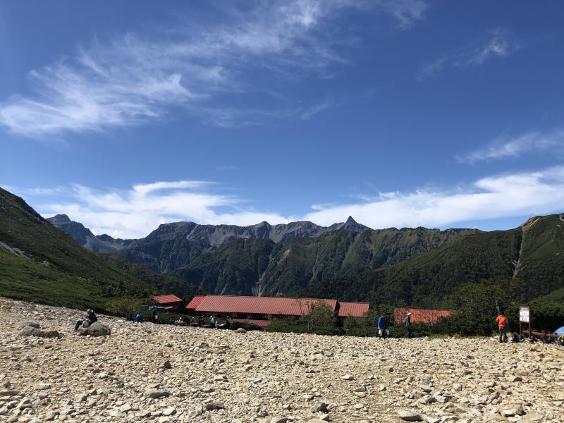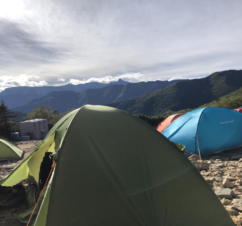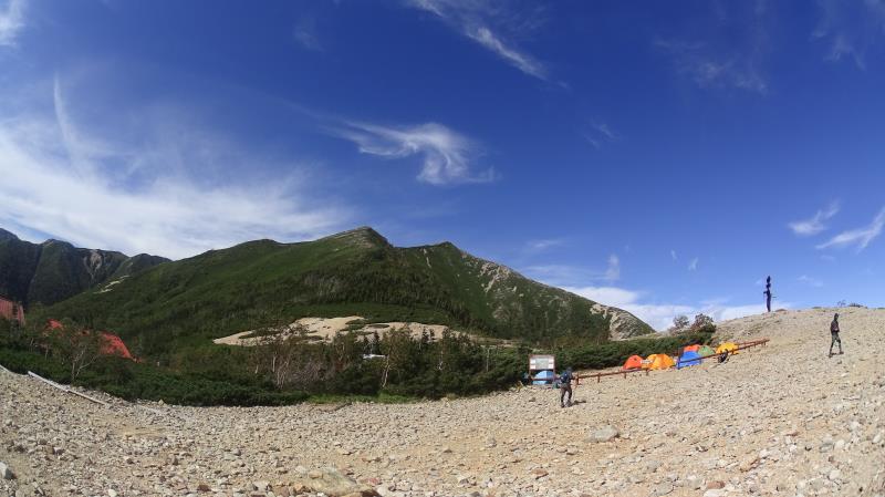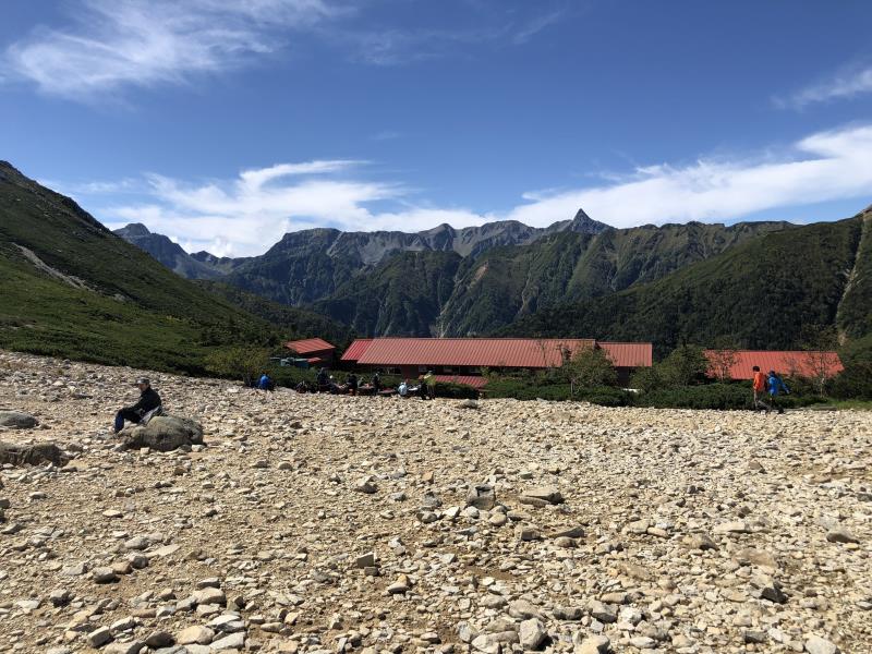 (2日目9/20)朝6時集合。常念岳を目指す。岩場を約400M程登る。常念小屋が小さく見える。結構な急登だったけど、全員無事に念願の常念岳を踏むことができた。常念岳からこれから目指す蝶ヶ岳ヒュッテが小さく見える。急峻な岩場の下りが続く、蝶槍の手前は、急斜面の登りが続く。蝶槍からは360°素晴らしい絶景が広がる。常念岳のピーク、ピラミッド型の容姿もはっきり見えた。お昼過ぎに蝶ヶ岳ヒュッテに到着。本来ならここでテント設営なのだが沢山のテントが濃厚状態だったので、L判断で、三俣まで下山する事にした。Lにタクシーを手配して頂いていたので、休憩は少なめ、間に合うように下山、なんとかその日のうちに、山行を終了する事ができた。