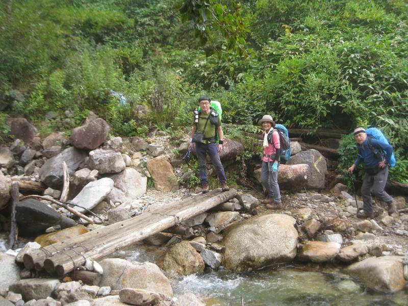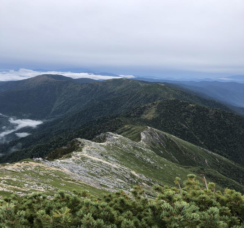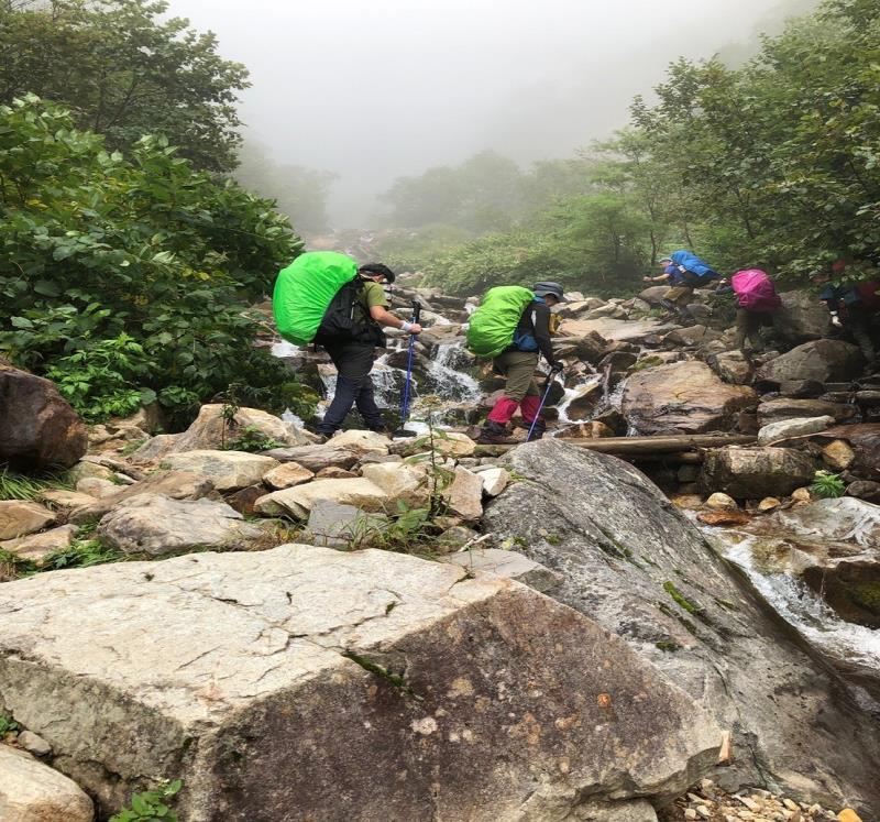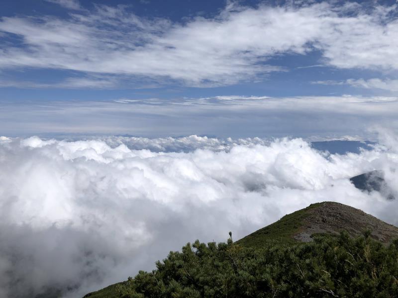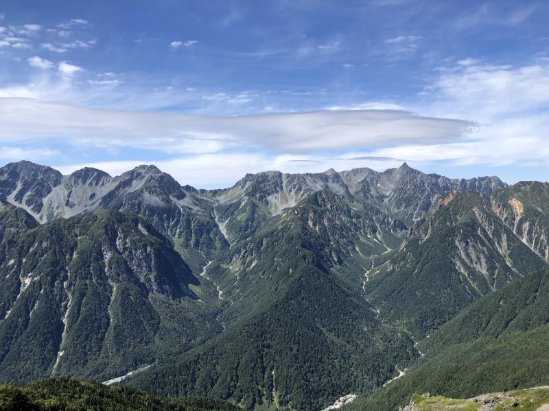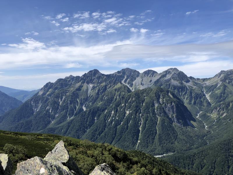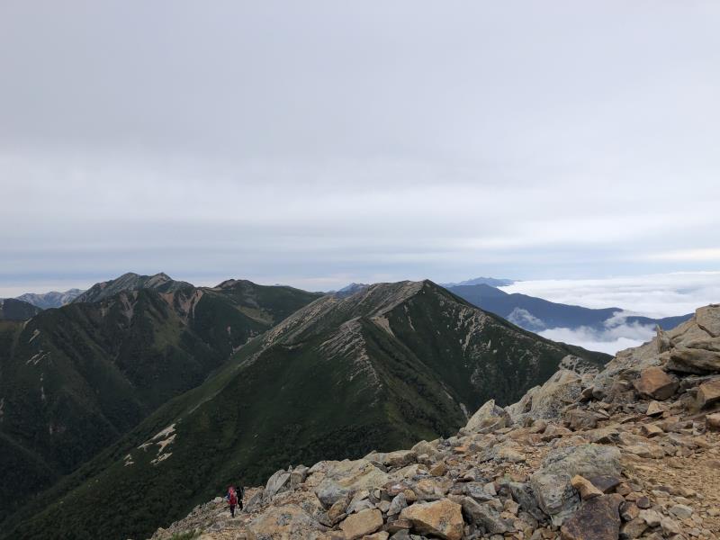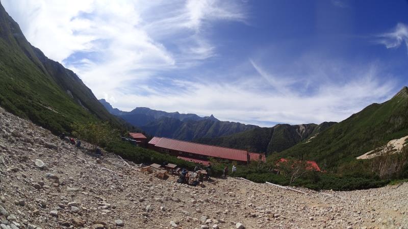 (2日目9/20)朝6時集合。常念岳を目指す。岩場を約400M程登る。常念小屋が小さく見える。結構な急登だったけど、全員無事に念願の常念岳を踏むことができた。常念岳からこれから目指す蝶ヶ岳ヒュッテが小さく見える。急峻な岩場の下りが続く、蝶槍の手前は、急斜面の登りが続く。蝶槍からは360°素晴らしい絶景が広がる。常念岳のピーク、ピラミッド型の容姿もはっきり見えた。お昼過ぎに蝶ヶ岳ヒュッテに到着。本来ならここでテント設営なのだが沢山のテントが濃厚状態だったので、L判断で、三俣まで下山する事にした。Lにタクシーを手配して頂いていたので、休憩は少なめ、間に合うように下山、なんとかその日のうちに、山行を終了する事ができた。