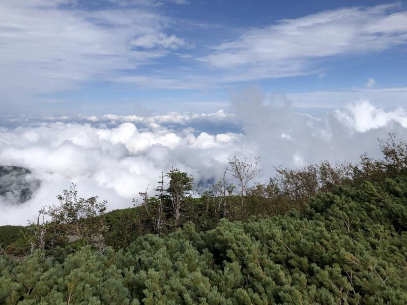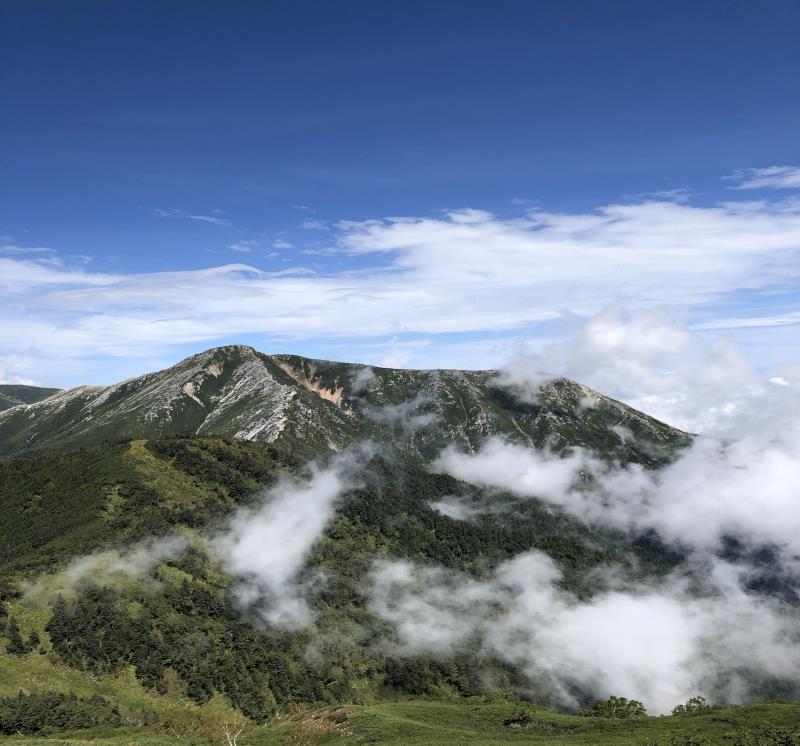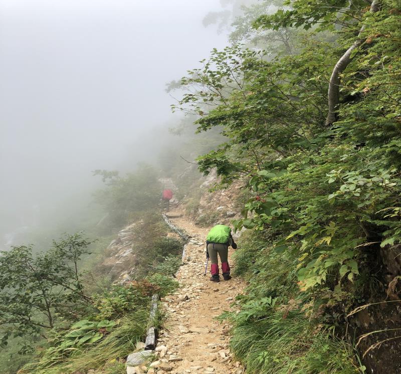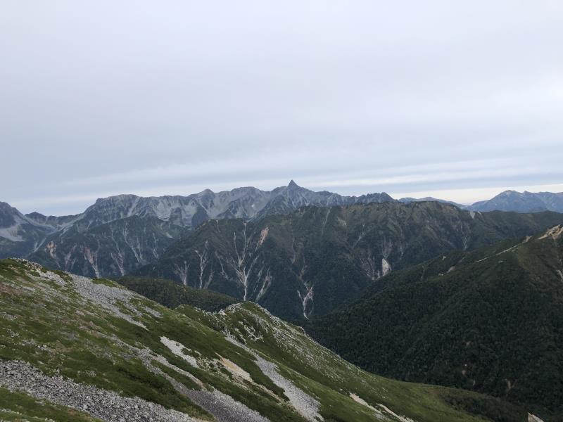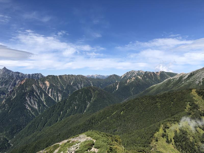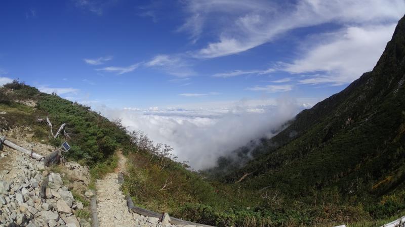 (1日目9/19)一ノ沢から常念乗越を目指す。午前は曇り空、ガスガスの中を歩く。高度をあげ、常念乗越の手前当たりから青空が広がり気温もあがる。常念乗越に到達した時は晴れ、突然、槍・穂高連峰の美しい姿が現れ感動を覚えた。