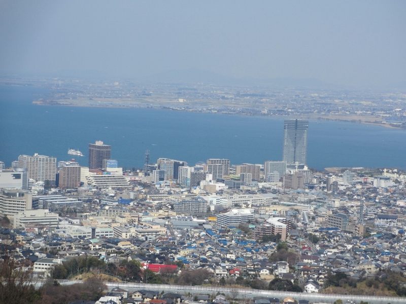この先音羽山山頂までは、傾斜も緩み、分岐点を左にとると、今までの樹林帯から一気に開けた山頂に着く。比良の稜線はまだ残雪が遠望でき、比叡、大文字と山並みが見渡せる。琵琶湖もおだやかである。山頂から、大津駅へ下るルートの途中で、右折し、膳所駅への下りをとる。
