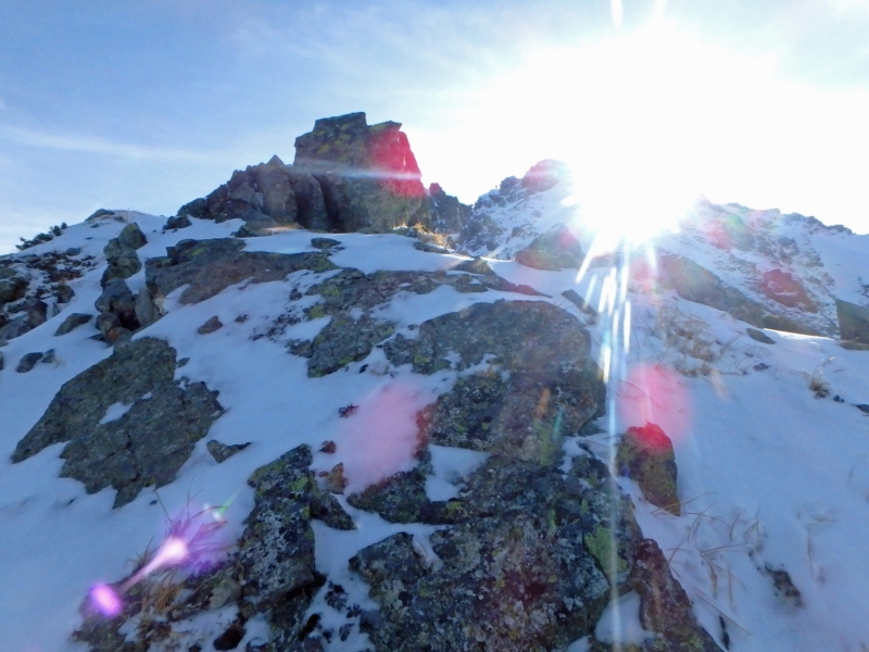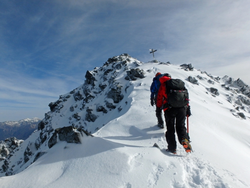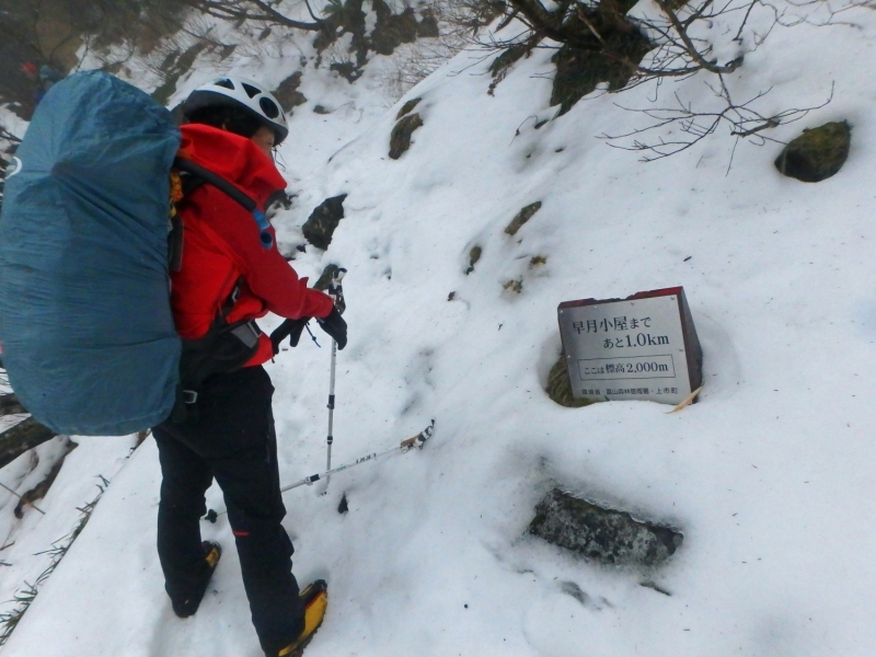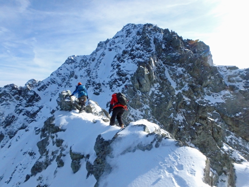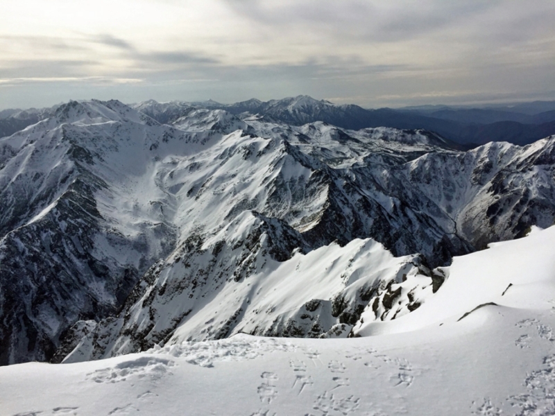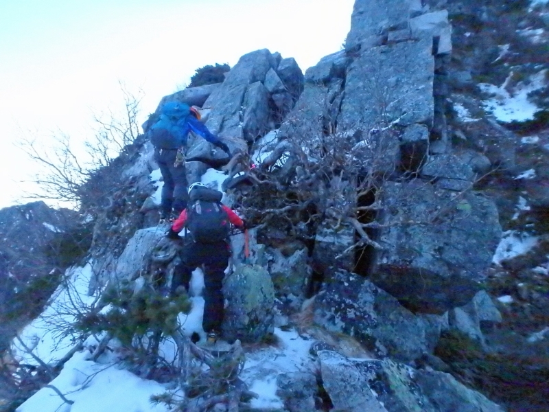 21日アタック日湯を沸かし、食事で遅くなり5時を過ぎてからのスタートになった。積雪は概ね30㎝~50㎝風は弱い、暫く樹林帯が続くが2600m辺りから岩稜帯に変わる、夏道は比較的トラバースが多いので、出来るだけピークピークでこなすが下降が悪いので懸垂も使う、少しアイゼンをひかっけると奈落の底だ、今日は暖かいがそれでも雪は硬い前爪2本とピッケルだけでクラストした雪面を登る、ふくらはぎが痛い。何度かアップダウンの後カニのハサミの核心部これもピークから登るが痩せ尾根で緊張する、やがて傾斜は緩み別山尾根との合流点から頂上に10時40分劔に立つ。御嶽や槍、去年同じ時期に登った鹿島槍もよく見える。祠は半分以上雪の中、今年の春に源次郎から登ったときは全部埋まっていた。