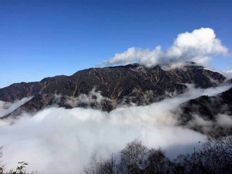 休憩後下山にこれが本当の核心かな、レベルと安全を考え懸垂を多用する7~8か所下山路でロープを張った。結果時間がかかり、小屋に16時30分に着き小屋で21日も泊まり、22日明るくなってから馬場島に向け下山、途中馬場島の交番から下山予定日遅れの問い合わせ電話があり恐縮する。昼過ぎ馬場島に下山、遅いペースのせいか疲れは殆ど無い快調だった。交番に挨拶をしてから温泉に入り、富山で寿司を食べ京都に帰った。