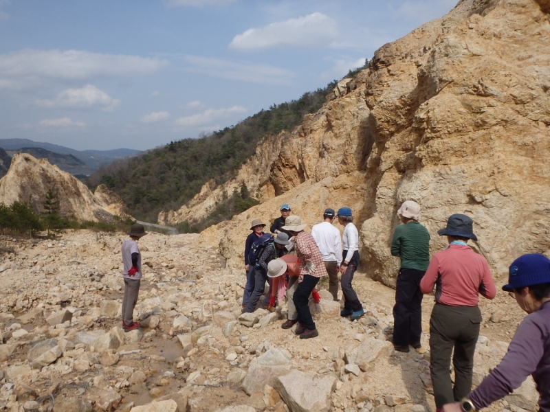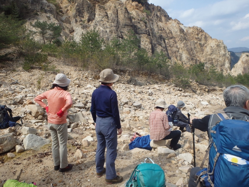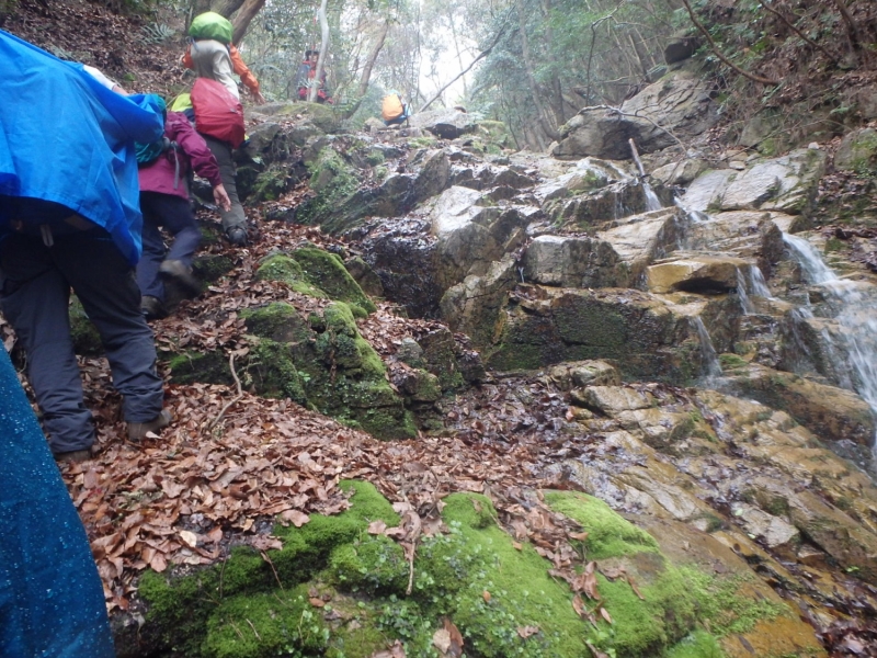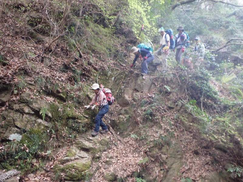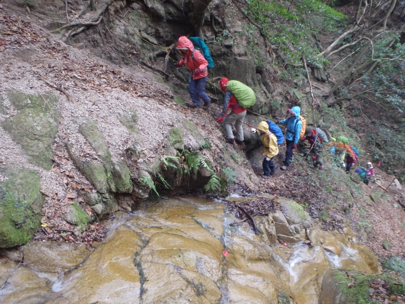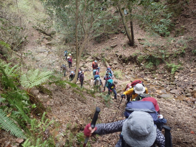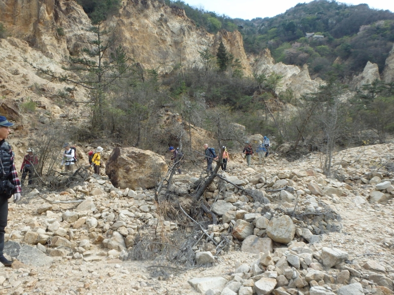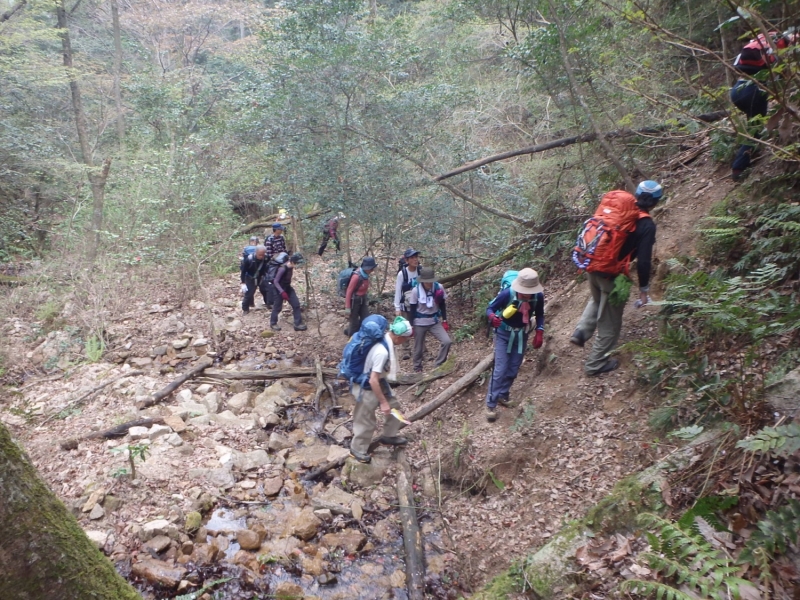 座頭谷に降り立ち、だだ広い谷中でのんびり休憩し、崩壊が進む岩群を楽しんだ。本日例会のエピローグは、「生瀬水路道」のハイク道。水路の水の流れに沿って緩やかに散策路をたどれば、やがてゴールの生瀬駅に到着した。