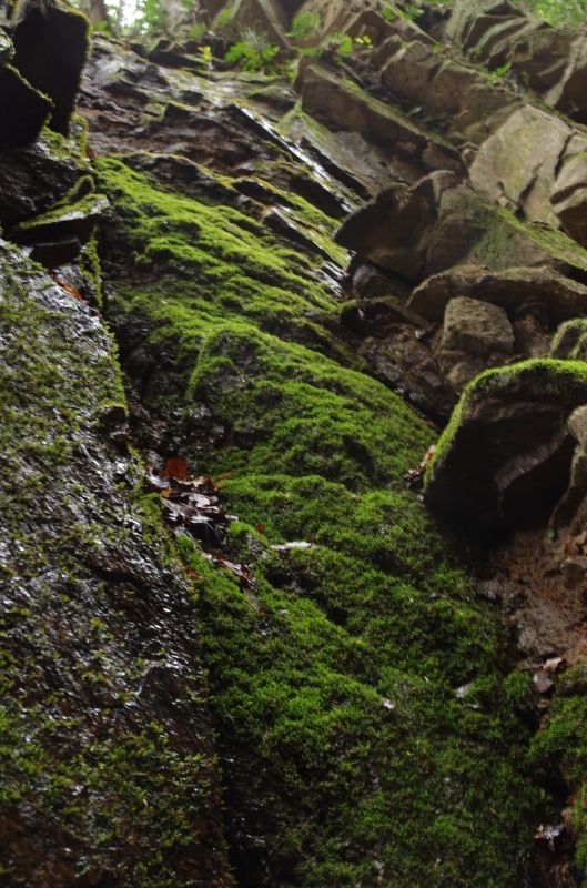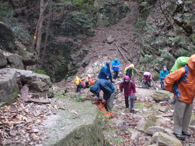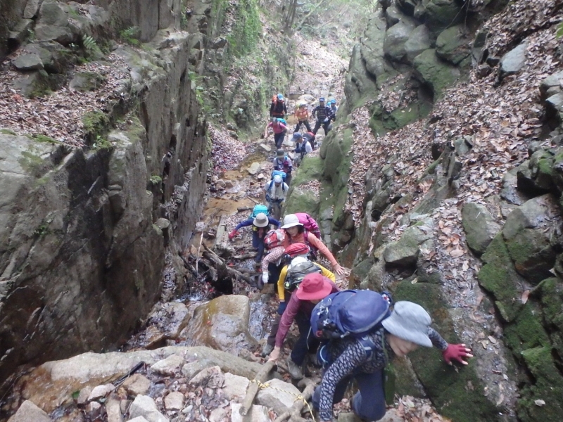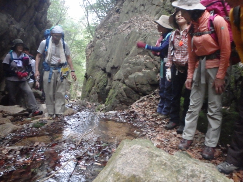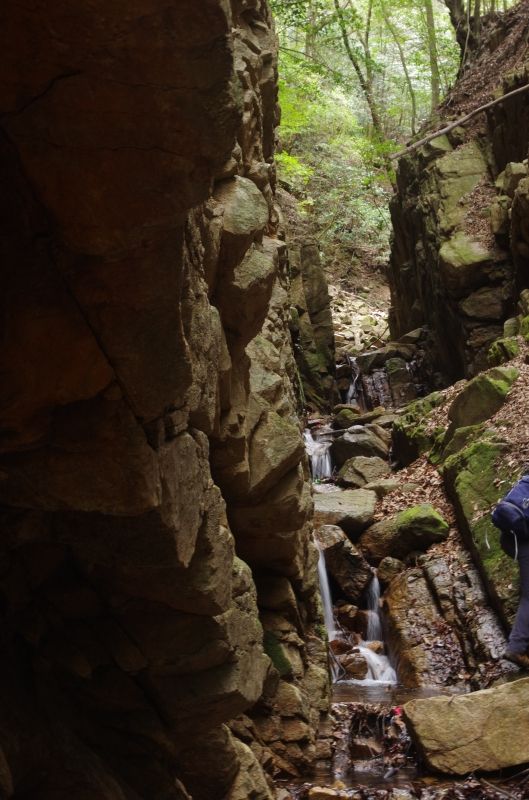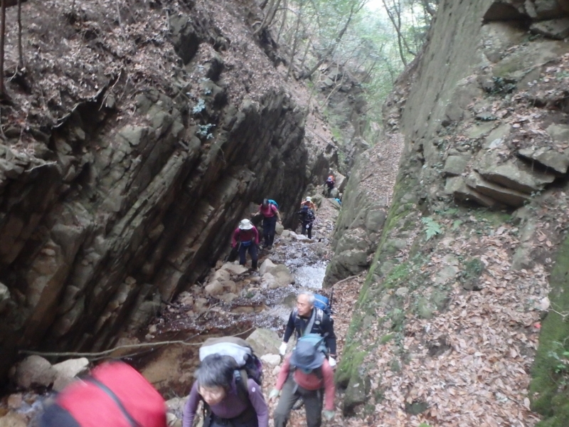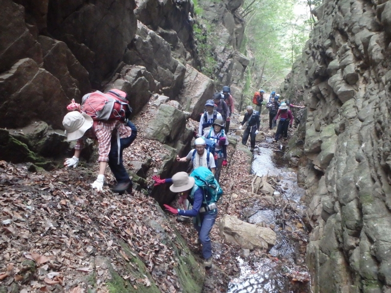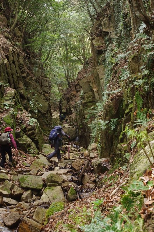 赤子谷では何度も渡渉を繰り返す。一般道ではないものの歩行路は良く踏まれており安心して沢歩きを楽しむことができる。そして赤子谷左俣の見せ場ゴルジュ(左右が切りたった廊下状の谷底)に到着。ゴルジュでは水の流れをさけながら谷間の岩を慎重にトレースしていく。見上げれば左右の岸壁がおおいかぶさってくる。あっという間にゴルジュを抜け一安心。ここで一雨降られたがすぐに止み 縦走路への急登を汗をかきかき我慢のひと登り。