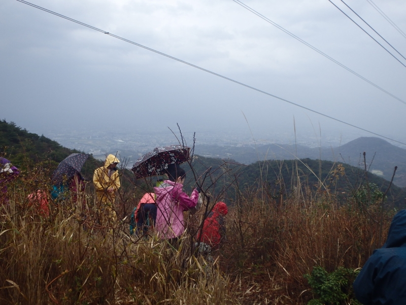 11:30、少々お昼には早いが甲山を見下ろしながら早めのランチタイム。昼食中、あろうことか雨の襲来を受け傘をさしてこれをしのいだ。その後天候は回復し快適な縦走路を進む。春の六甲山なので大勢のハイカーとあいさつを交わす。