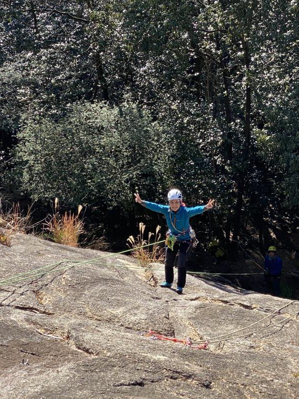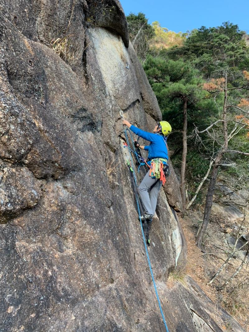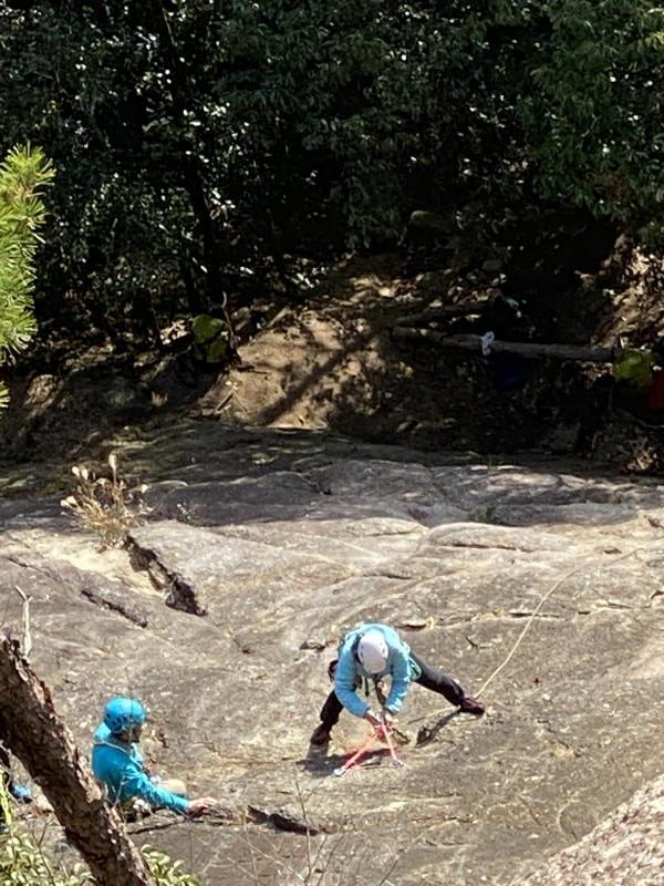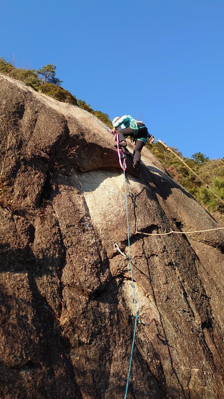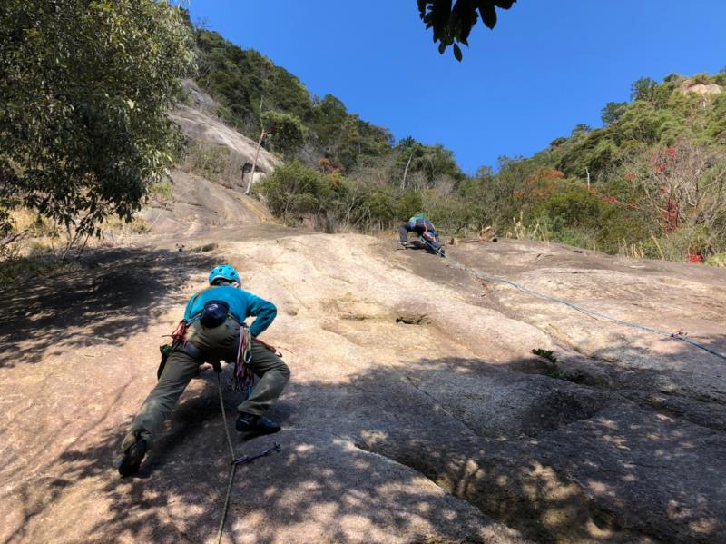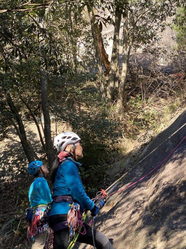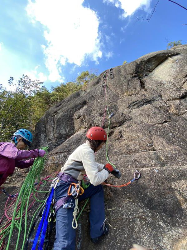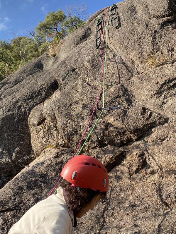 駐車場から取り付きまでは徒歩5分ほどで到着。まずトップロープを3本張り、スラブ状フェースに慣れた後リードクライミング、支点構築、ビレイの練習。午後はアブミを使ったエイドクライミングや仮固定・脱出の練習も行いました。