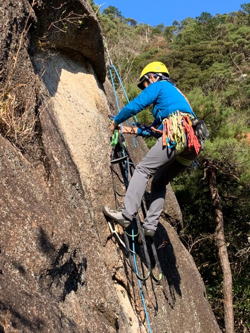 アブミやフィフィなど人口登攀の道具に初めてチャレンジするメンバーも多く、A0 で登る箇所ありで時間をかけて練習。
