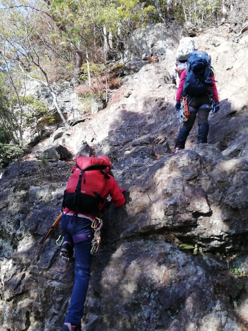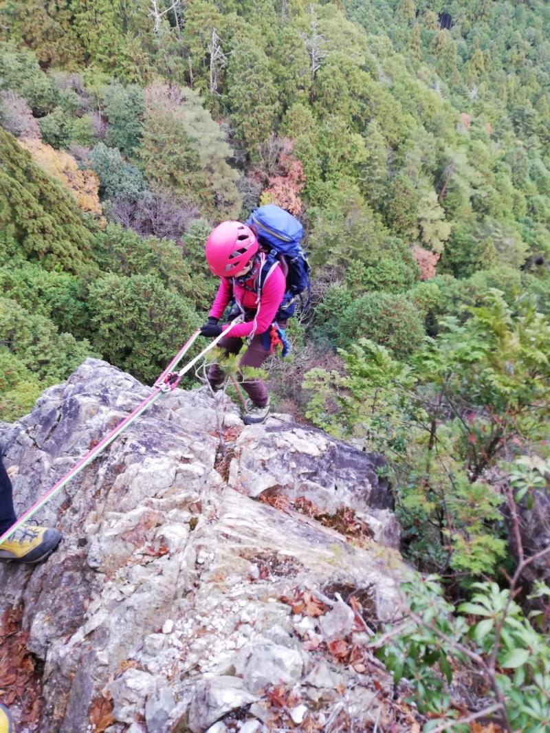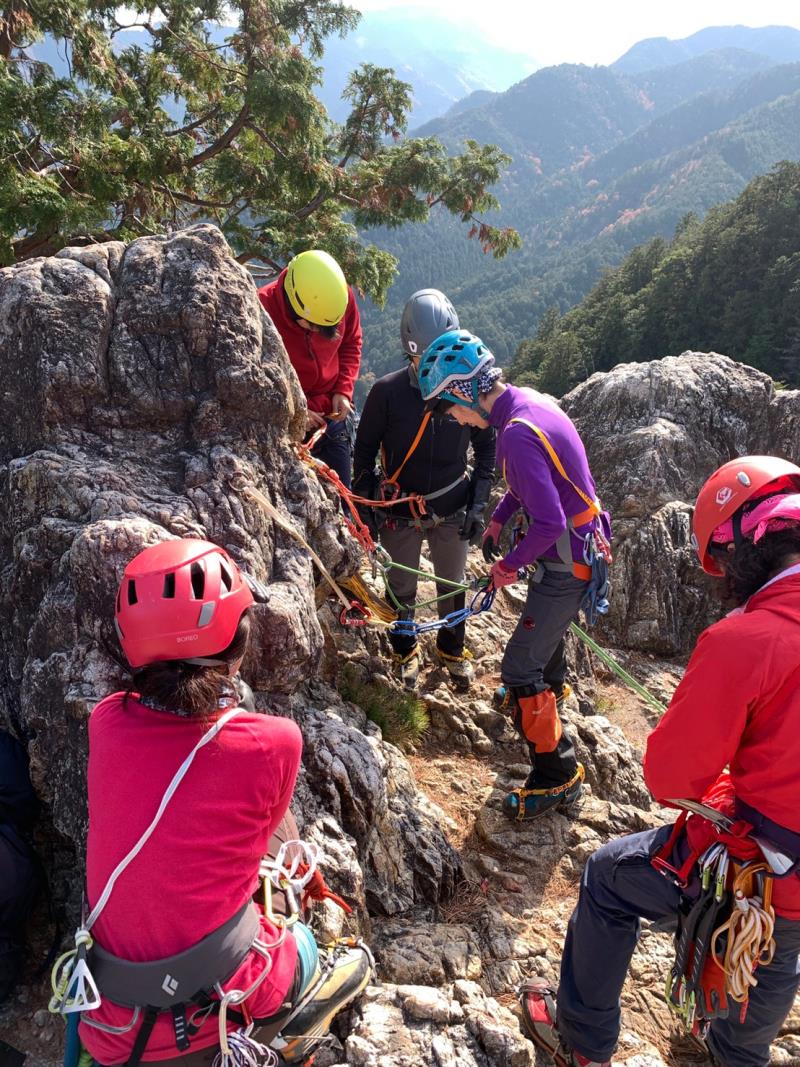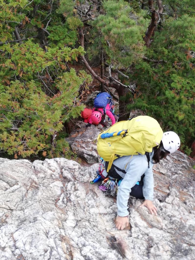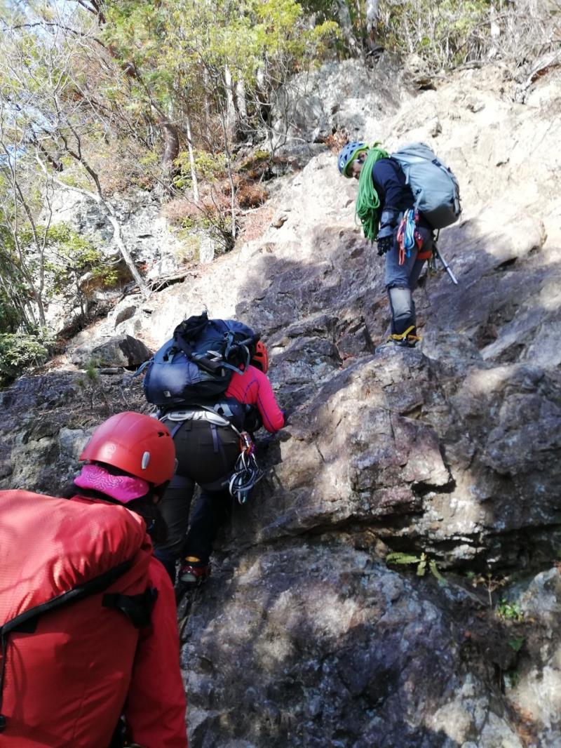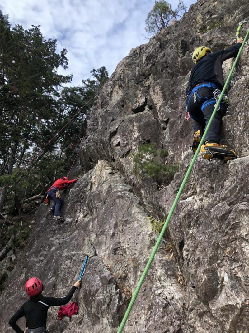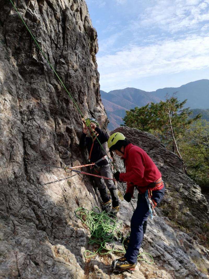 アイゼントレーニングとは雪の上でとお考えの方もおられる様ですが、ここでのアイゼントレーニングはアイゼンを履いてY懸の岩場を登り、頭と呼ばれる展望の良い岩場で2ヵ所ロープを張り上がり下りの練習。帰りはMKの岩場で50メートル懸垂で下山しました。
