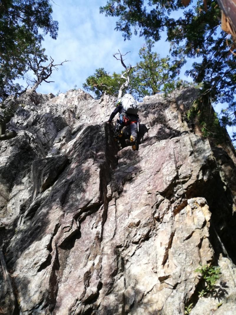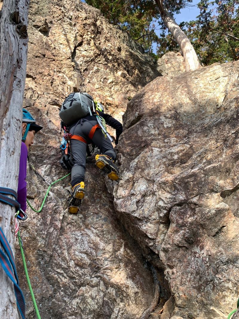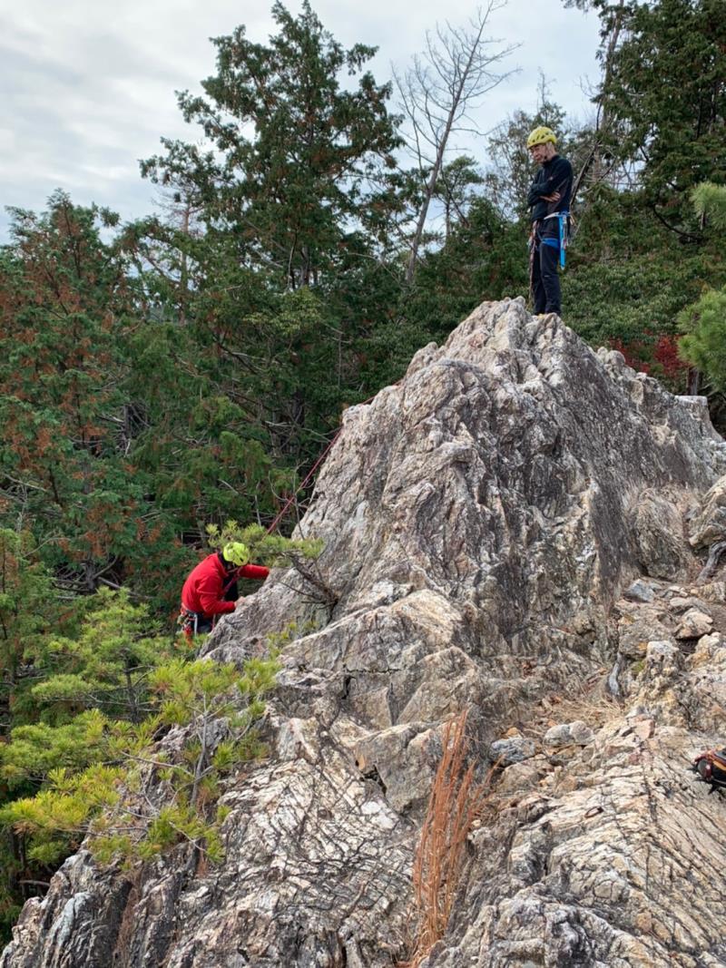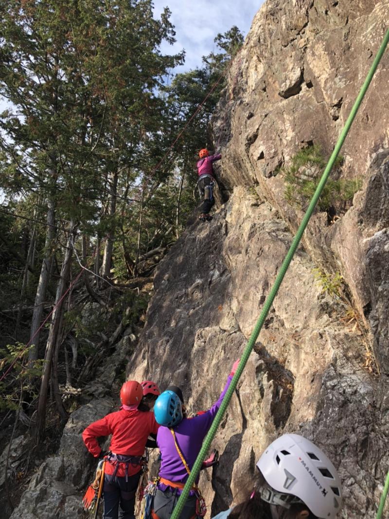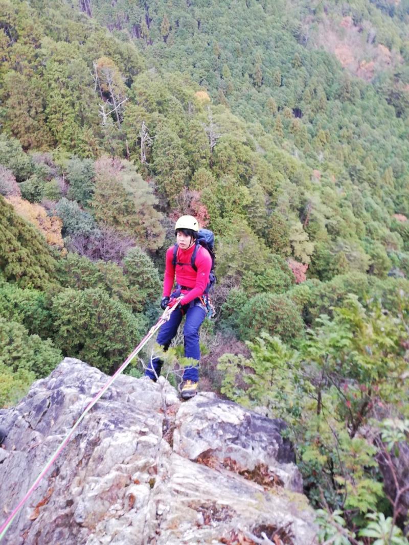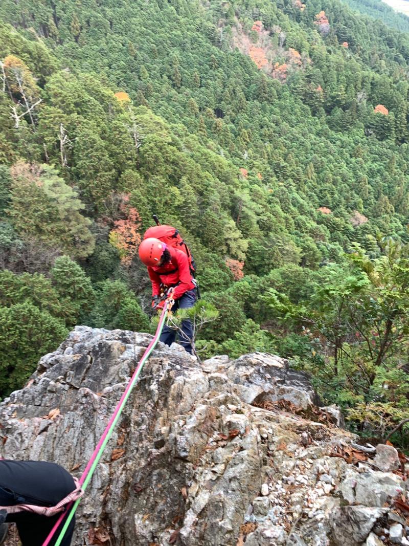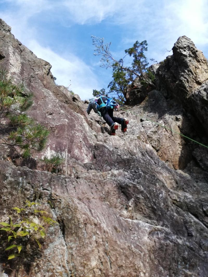 アイゼントレーニングとは雪の上でとお考えの方もおられる様ですが、ここでのアイゼントレーニングはアイゼンを履いてY懸の岩場を登り、頭と呼ばれる展望の良い岩場で2ヵ所ロープを張り上がり下りの練習。帰りはMKの岩場で50メートル懸垂で下山しました。