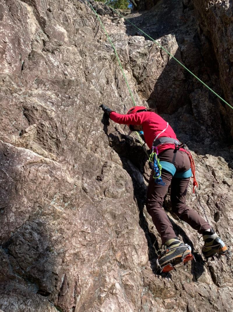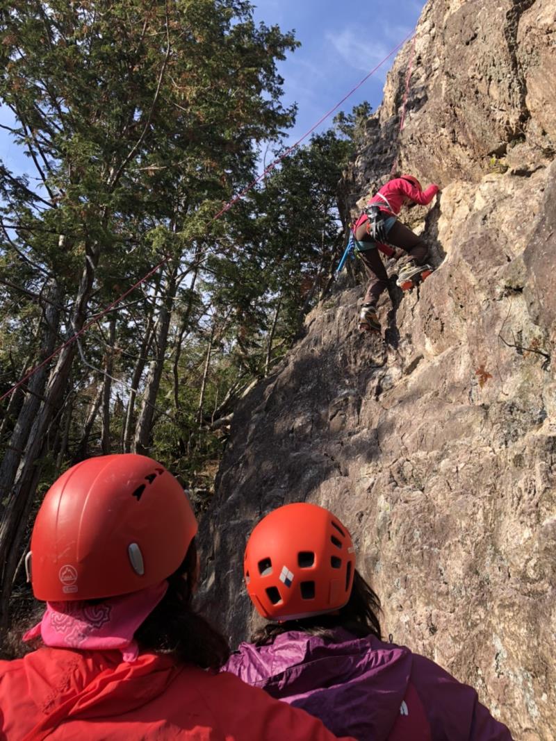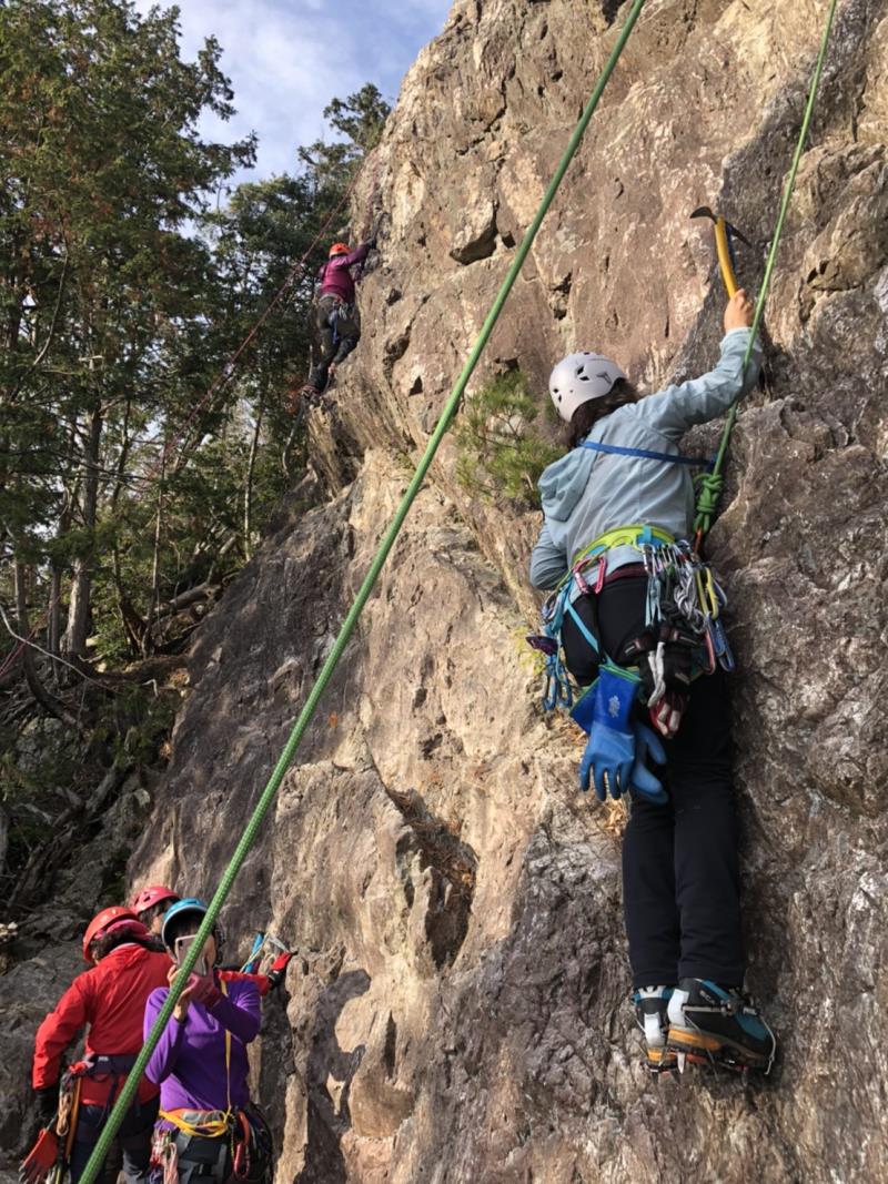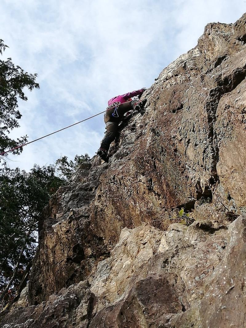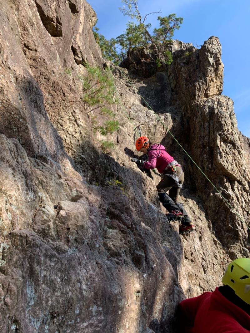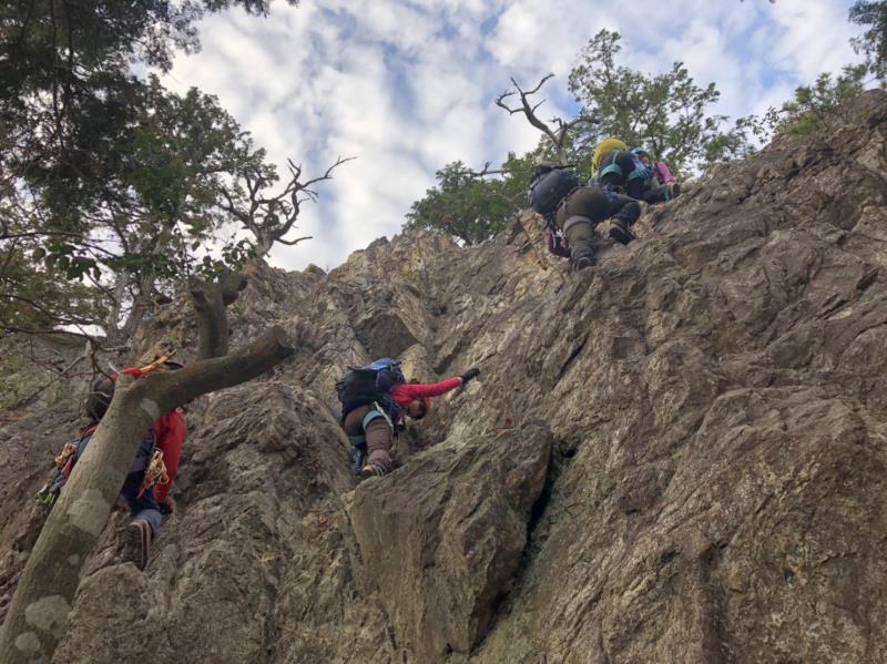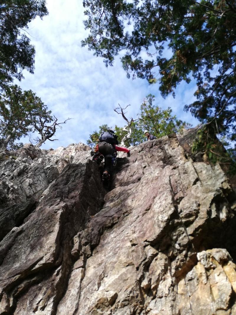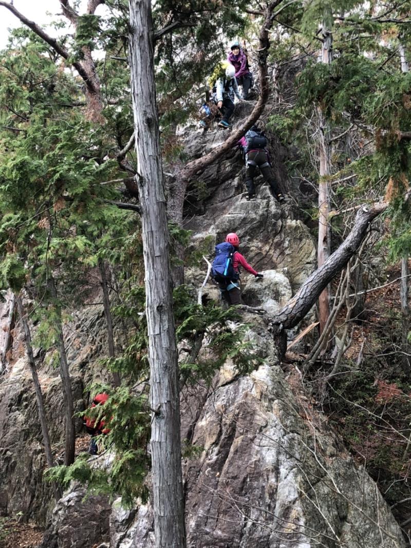 アイゼントレーニングとは雪の上でとお考えの方もおられる様ですが、ここでのアイゼントレーニングはアイゼンを履いてY懸の岩場を登り、頭と呼ばれる展望の良い岩場で2ヵ所ロープを張り上がり下りの練習。帰りはMKの岩場で50メートル懸垂で下山しました。