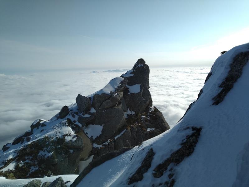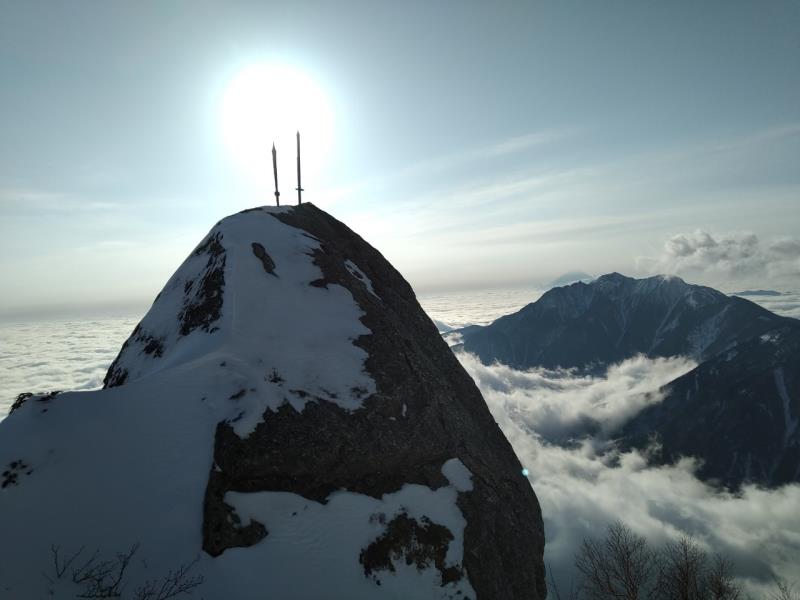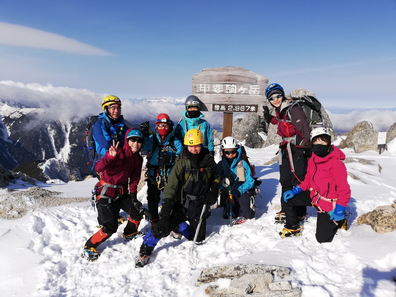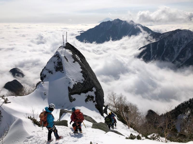 2日目、雪のコンデションもよく経験豊富なメンバーのフォローを受けながら八合目からの難所をクリアすると甲斐駒ブルーに聳え立つ山頂が迎えてくれた。