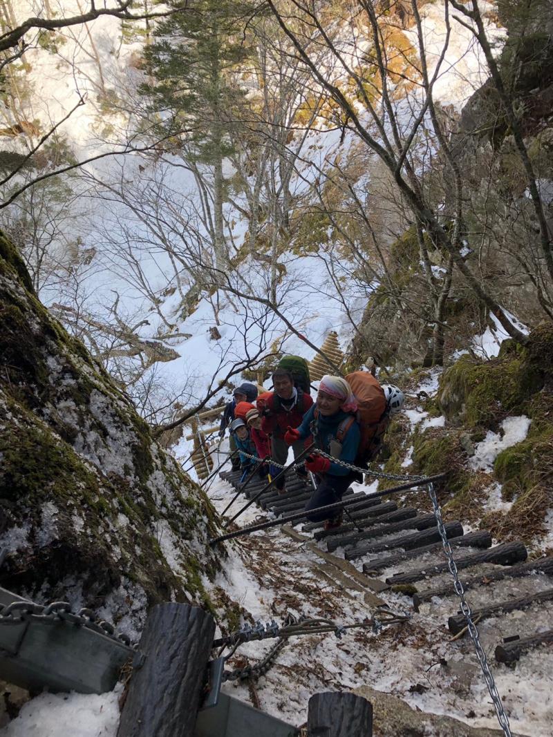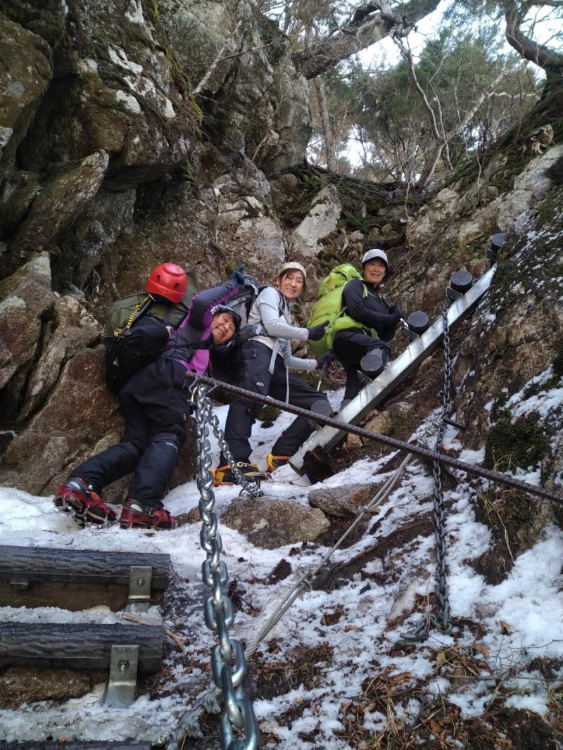一日目は樹林帯から始まり梯子や鎖の連続するやせ尾根を登り、ようやく小屋に到着。コロナ対策の取られた小屋で英気を養い翌日に備える。