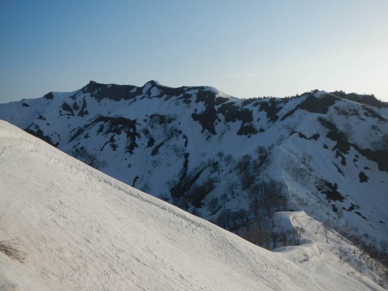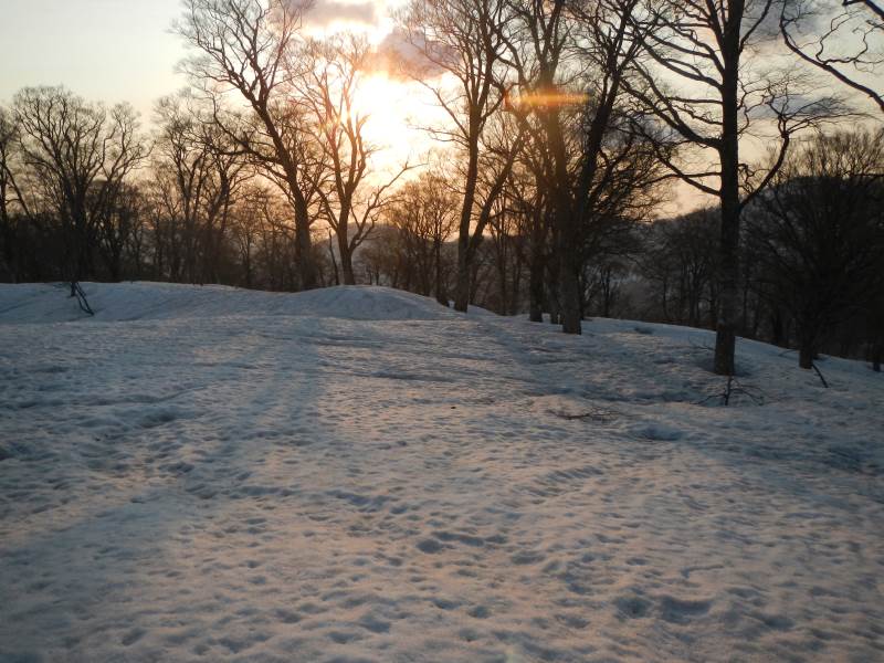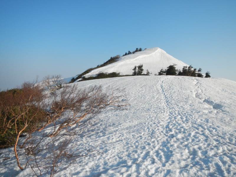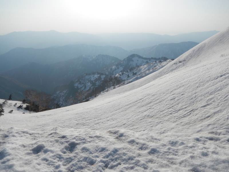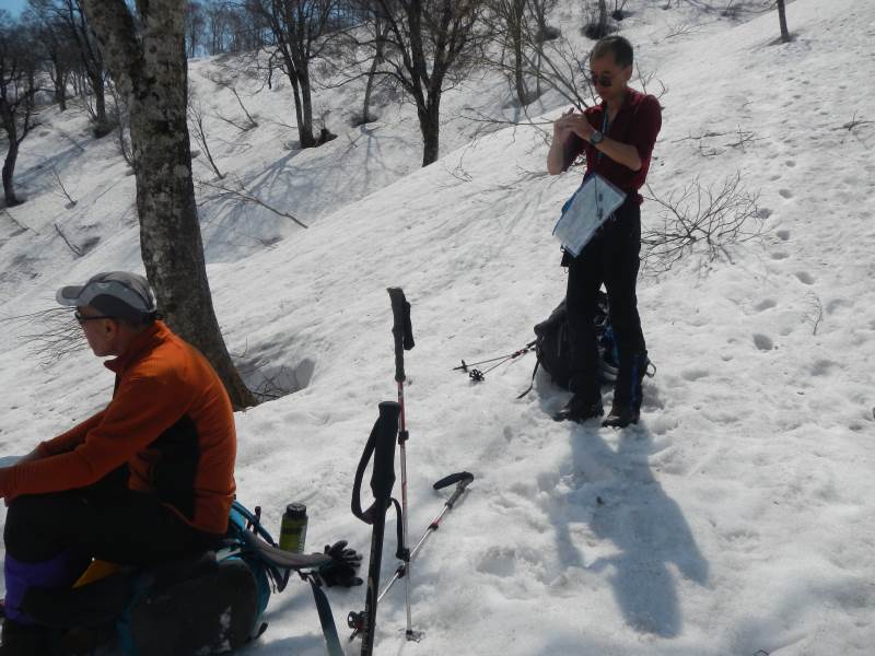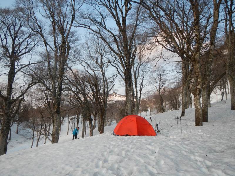 28日夜は登山口近くの道の駅で前泊し、翌日早朝から登山口に移動、中宮発電所の導水管の横の長い階段を登り、山毛欅尾山(ブナオ山)までの急坂の所々で藪漕ぎになりました。昼頃に北側の山の天候が悪化、あっという間にこちらの上空をアラレを降らせながら雲が通過し、白山の方向へ移動していきました。雷鳴が聞こえていましたが、影響はありませんでした。14時頃にテント泊地の冬瓜平に到着し、夜までゆっくりと休みました。放射冷却でちょっと寒い夜(氷点下数度)を過ごし、翌日不要な荷物はテントに置いて、4時過ぎに笈ヶ岳に向け出発、凍りぎみの雪の上をアイゼンで踏みしめて進みました。
